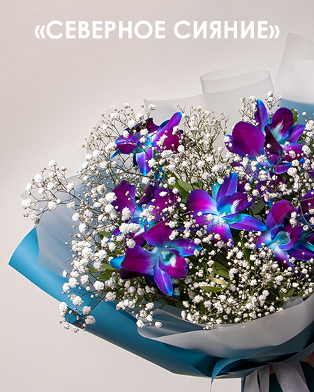 Коллекция "Северное сияние" создана специально для тех, кто любит яркие краски и экстравагантные сочетания. Это букеты, которые никого не оставят равнодушным. Чарующий цвет орхидей, переходящий из темно-синего в фиолетовый и ярко-голубой, и белая гипсофила в точности повторяют образ ночного неба в период появления Полярного сияния.