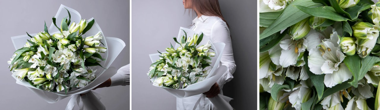 Альстромерия — цветы со стройными стеблями и пышными соцветиями. Каждый стебель альстромерии содержит три-пять бутонов. Альстромерию используйте для добавления объёма и текстуры букету. Её название происходит от фамилии любителя растений.