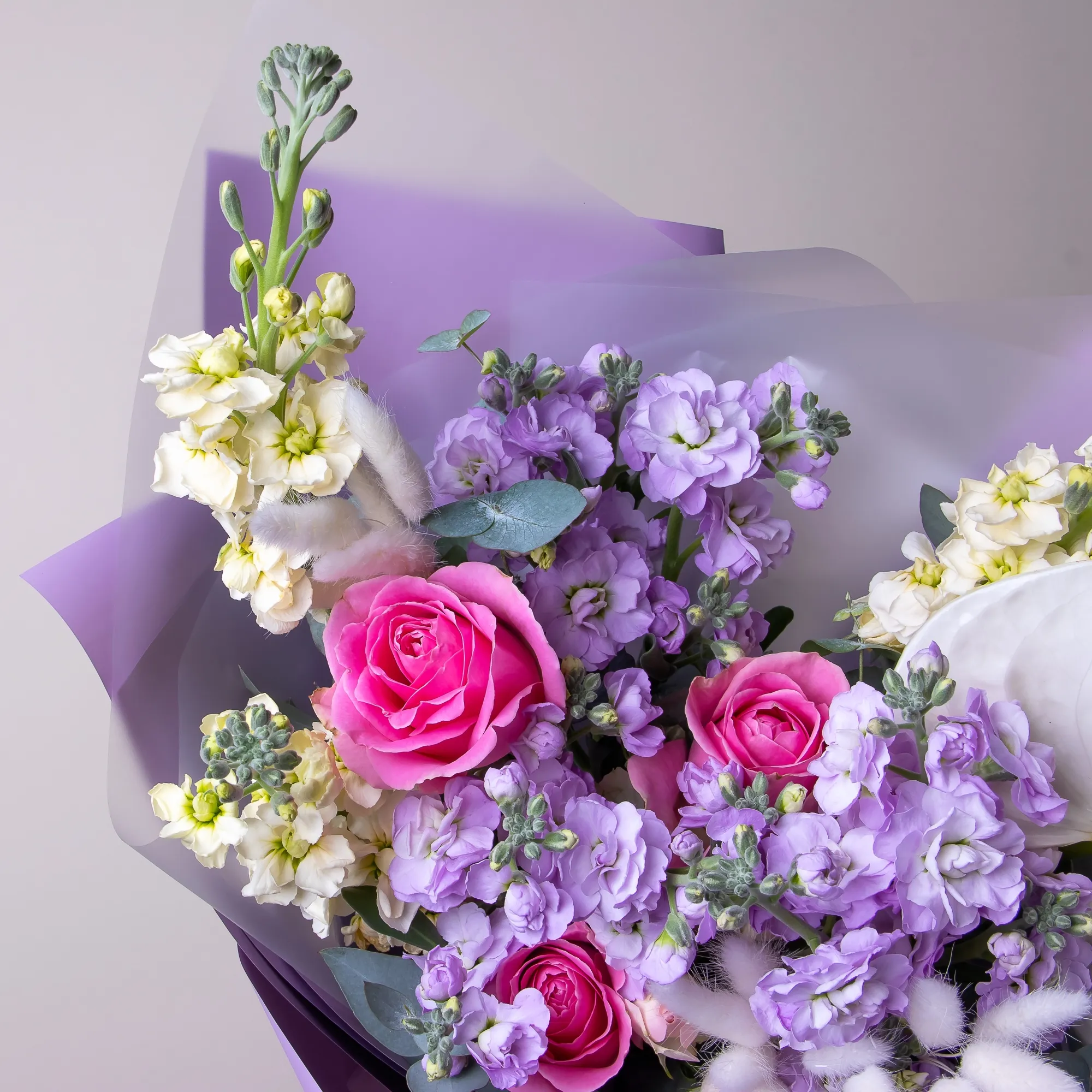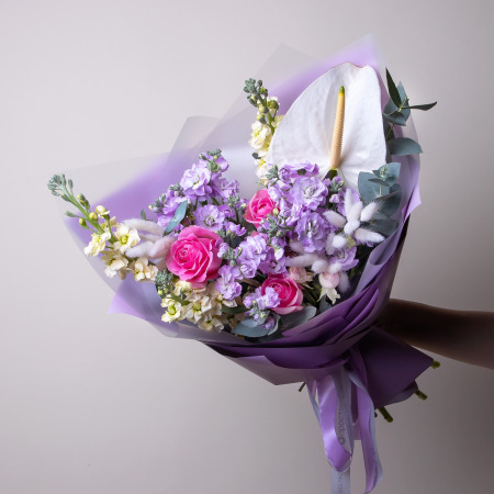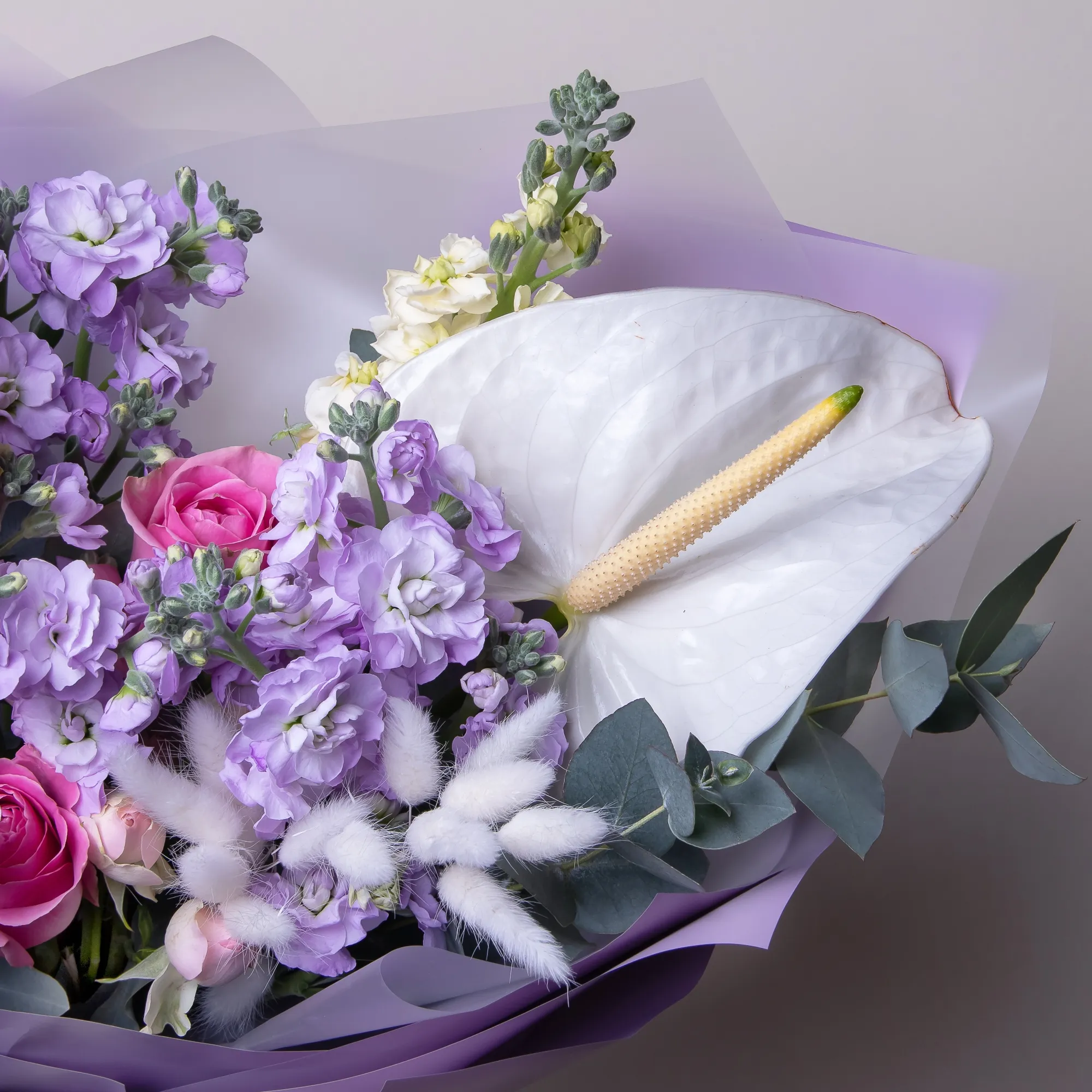Роза-3, Маттиола-6, Антуриум-1, Роза кустовая-1, Листья эвкалипта-5