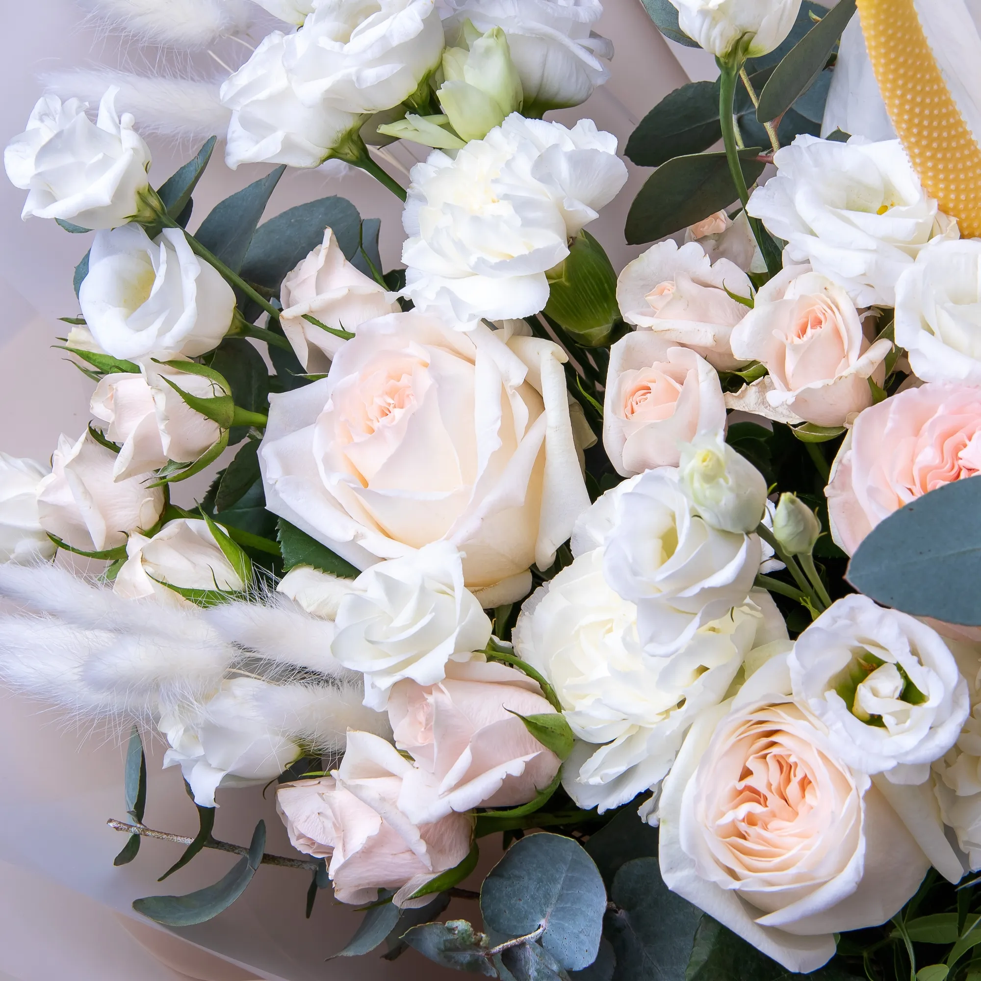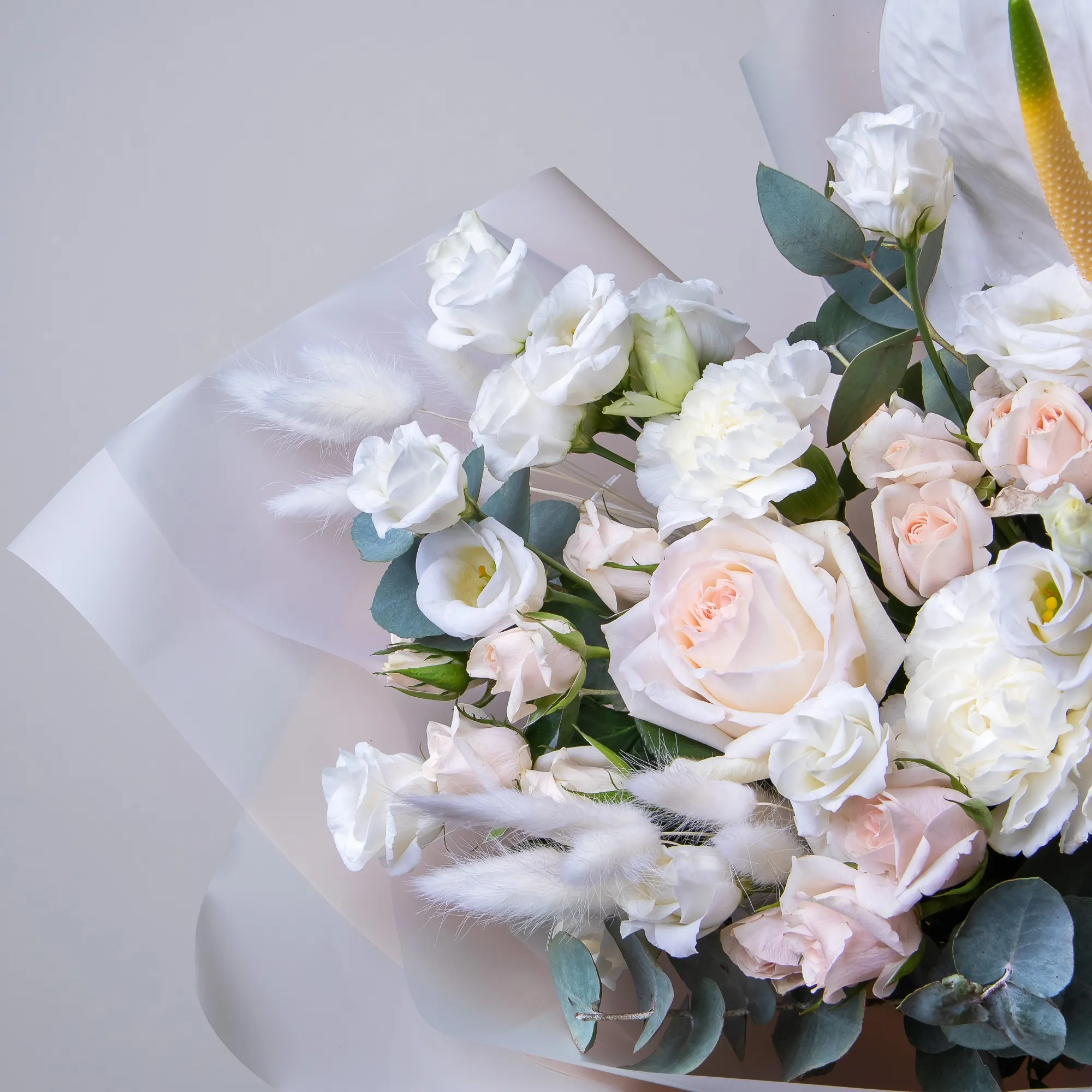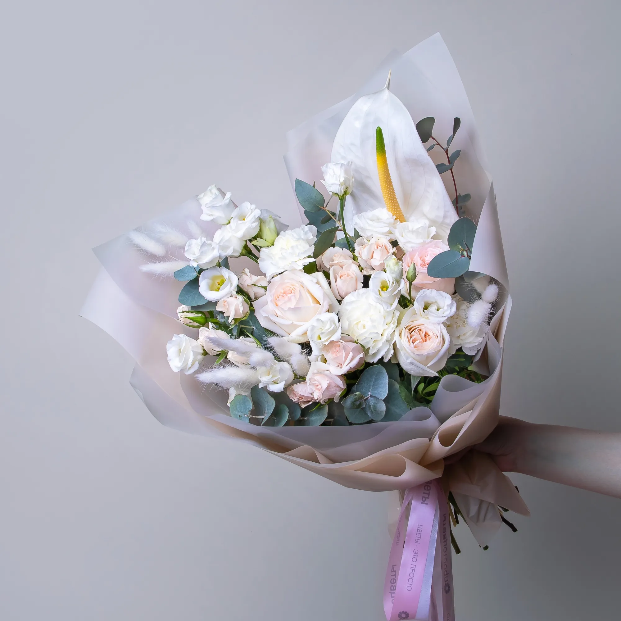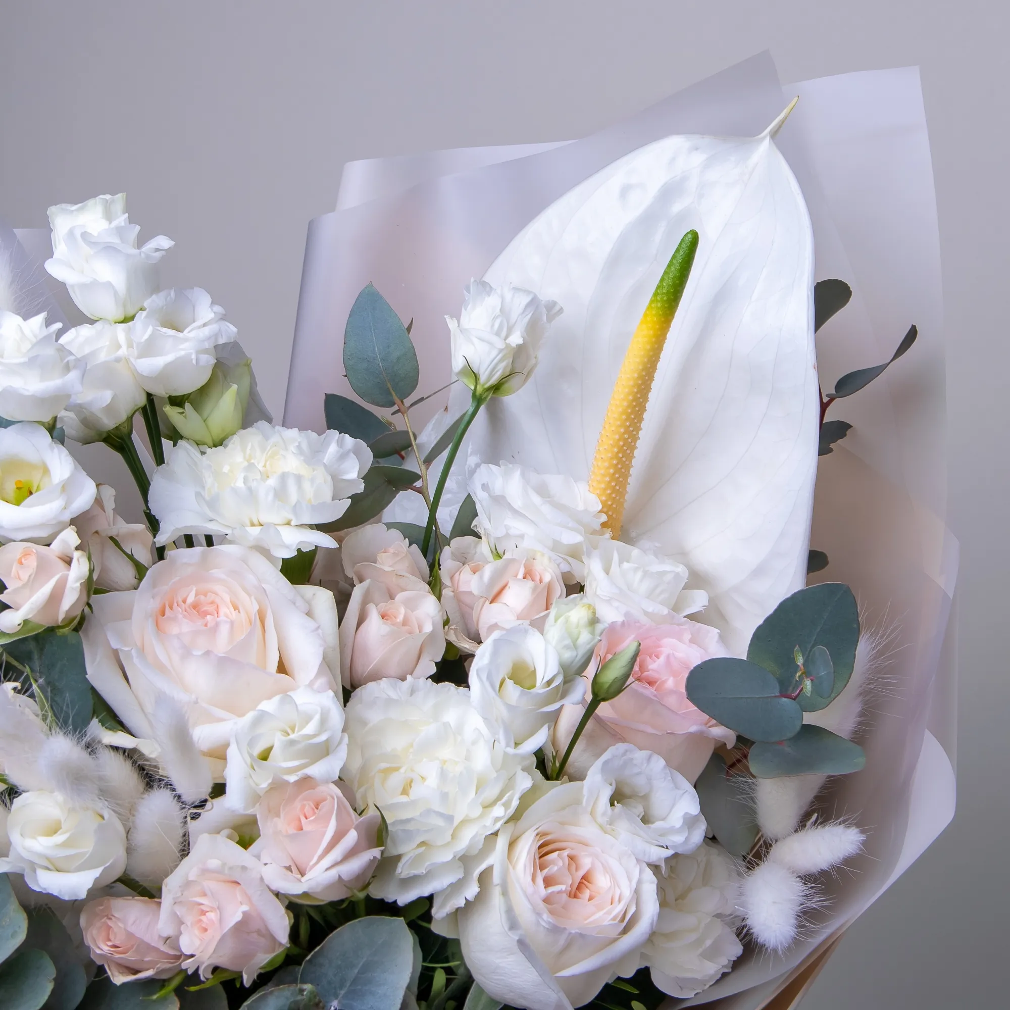 Гвоздика-3, Антуриум-1, Эустома-2, Роза кустовая-3, Роза пионовидная-3, Листья эвкалипта-5