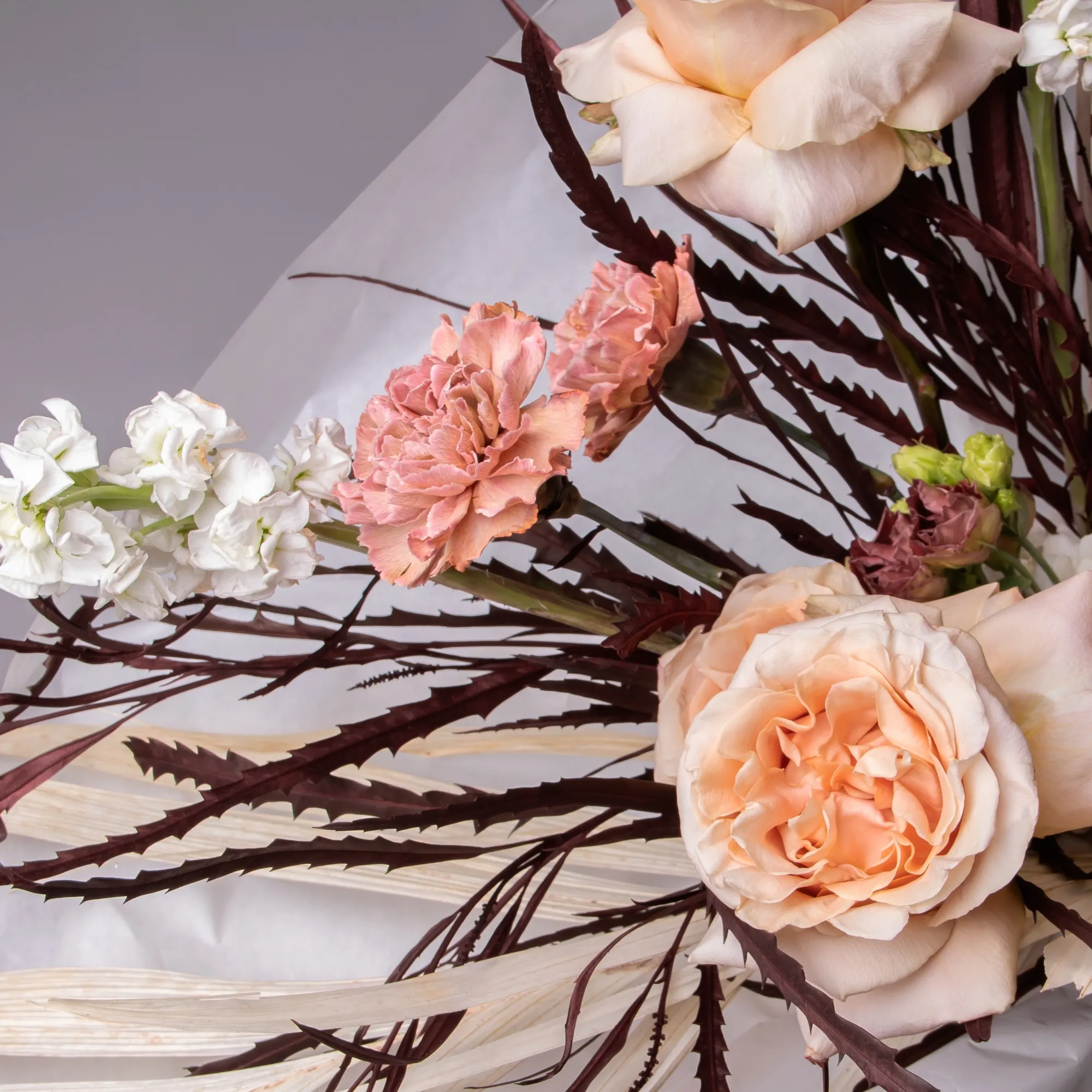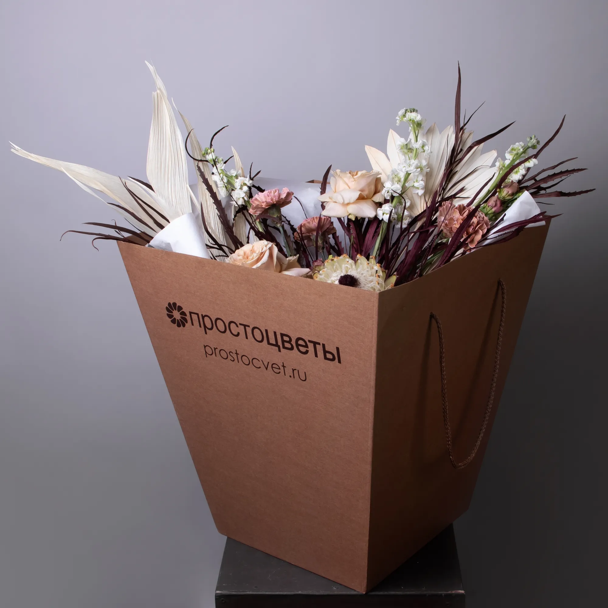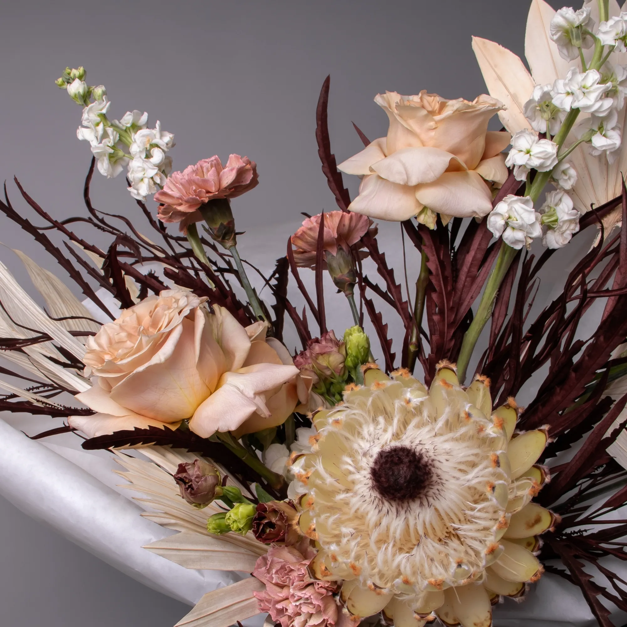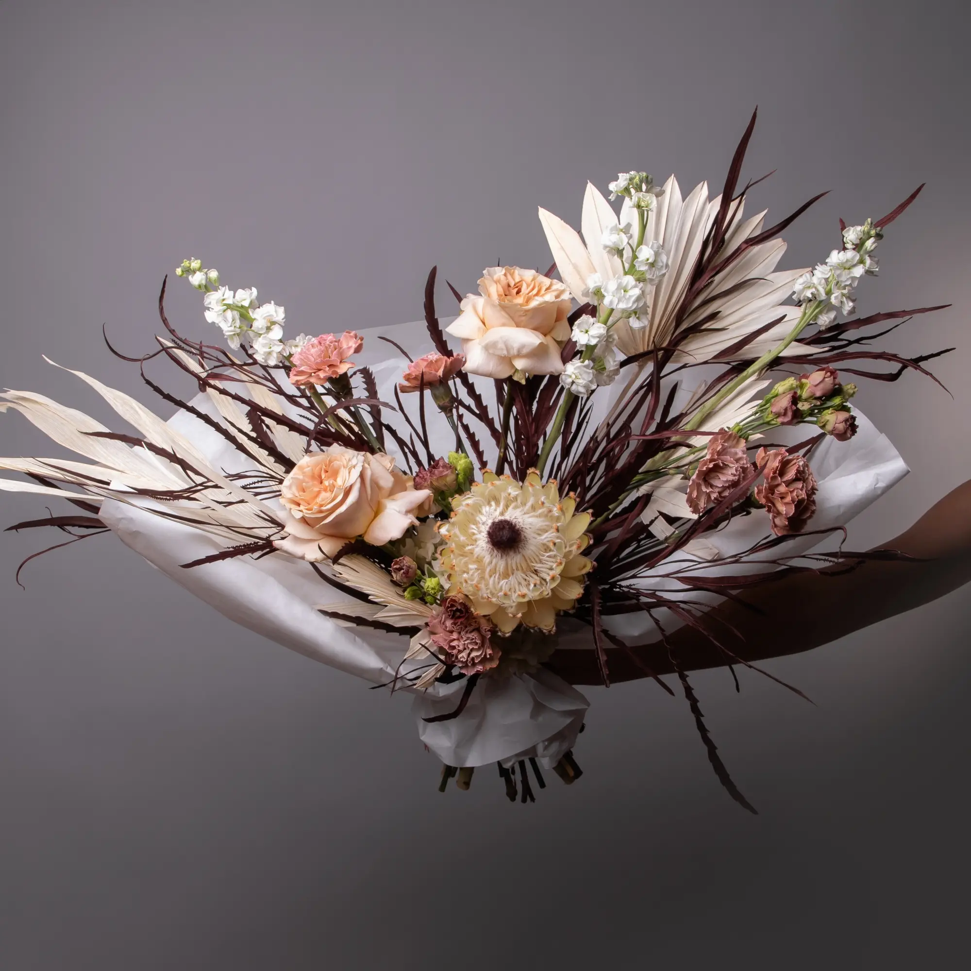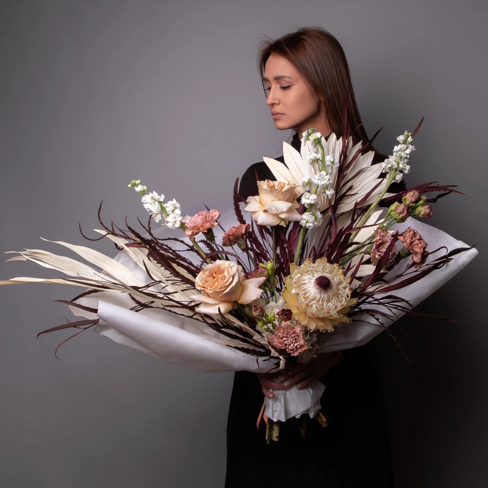 Гвоздика-5, Гортензия-1, Роза-3, Маттиола-3, Протея-1, Эустома-3, Листья пальм-1, Гривиллея-1