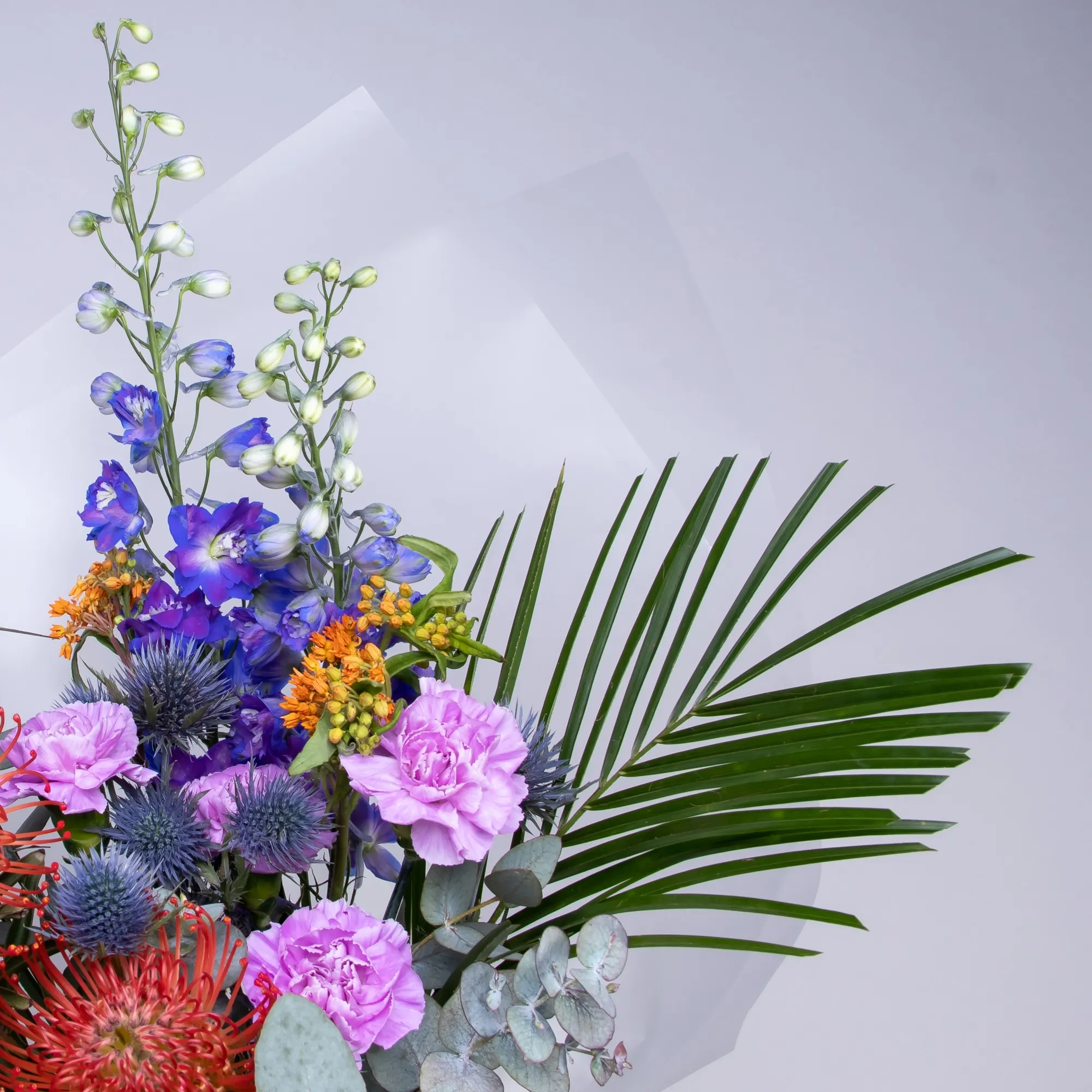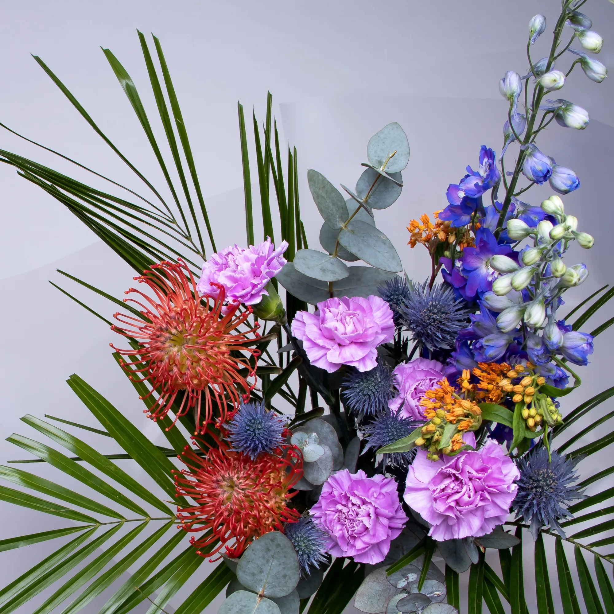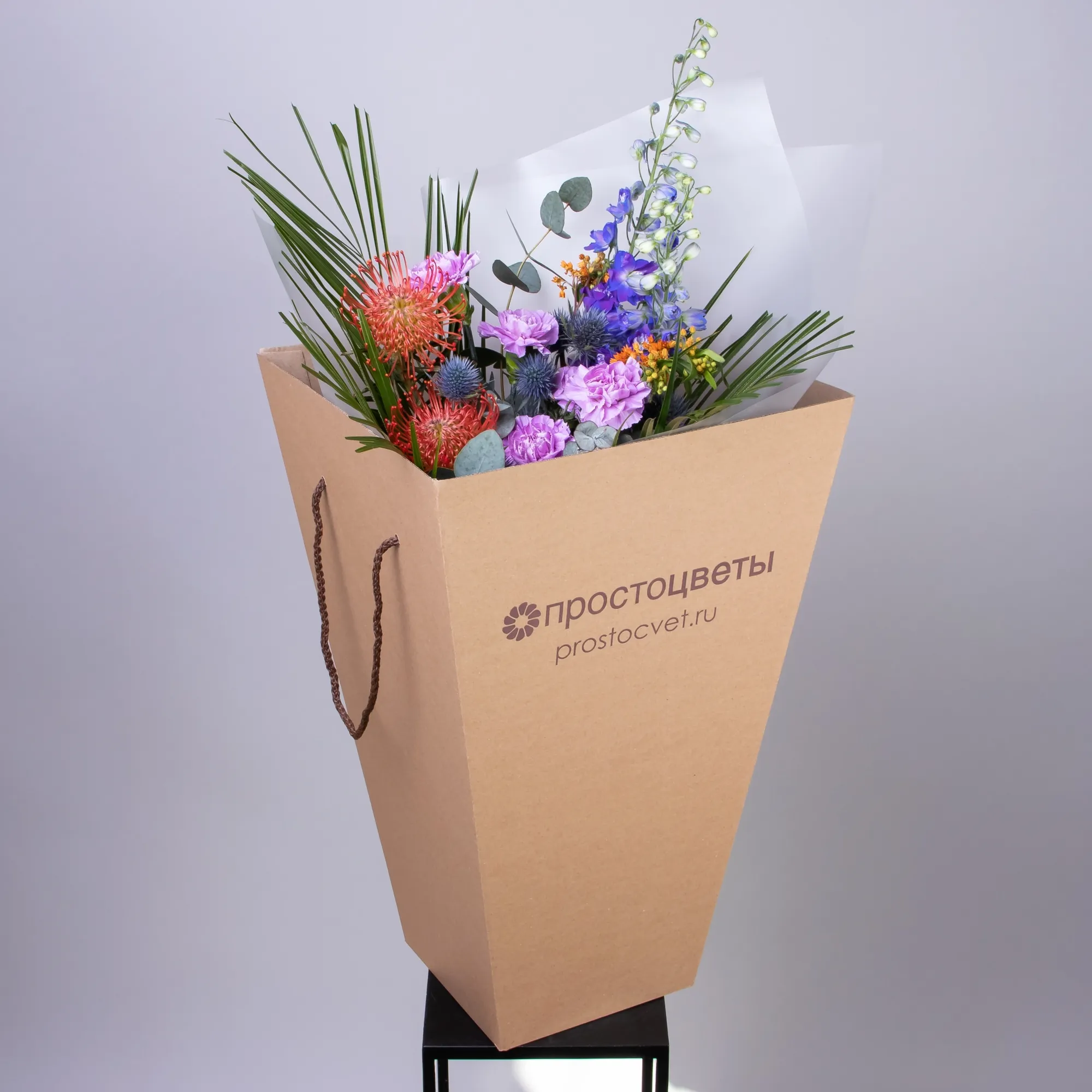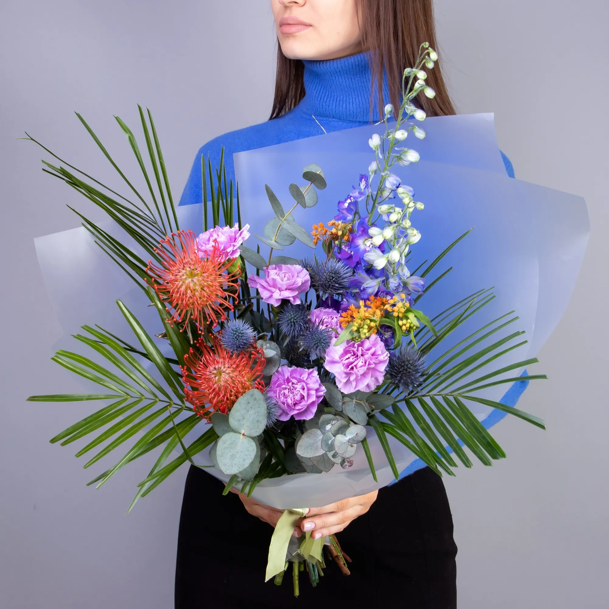 Гвоздика-5, Дельфиниум-2, Нутан-2, Листья эвкалипта-2, Асклепиас-2, Листья финик-3, Эрингиум-3