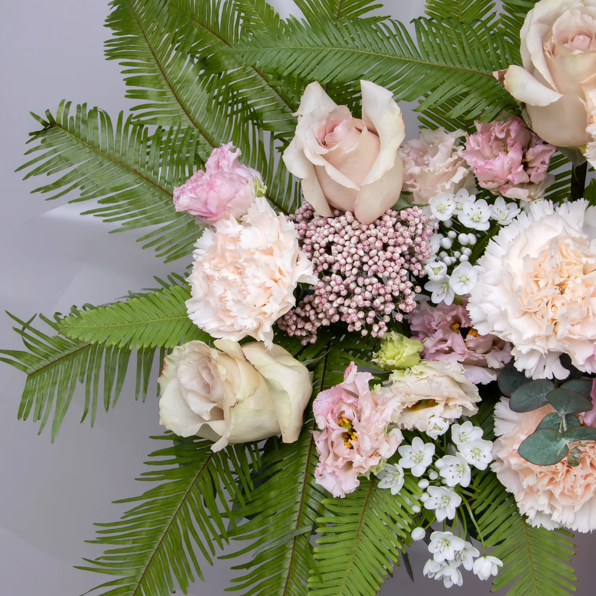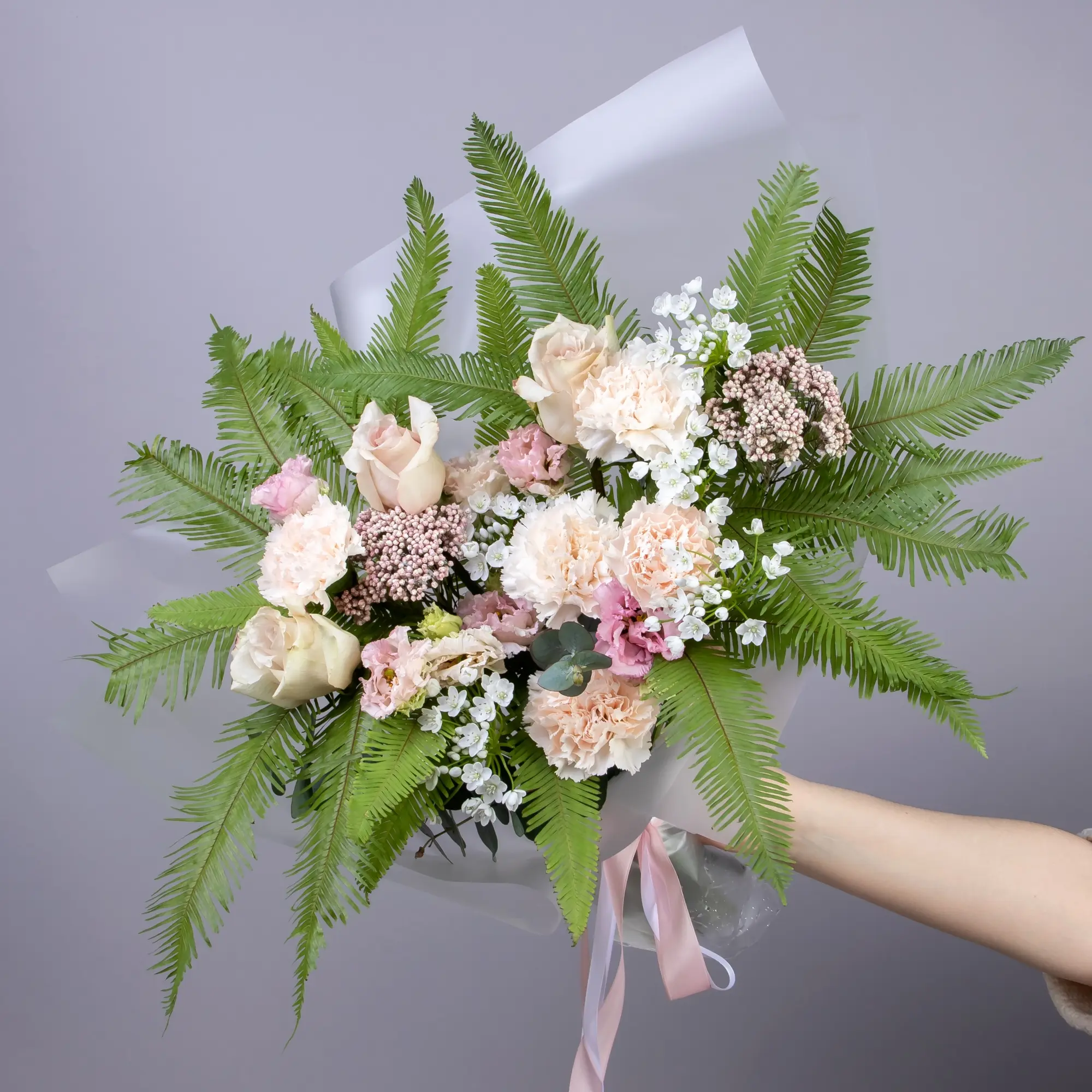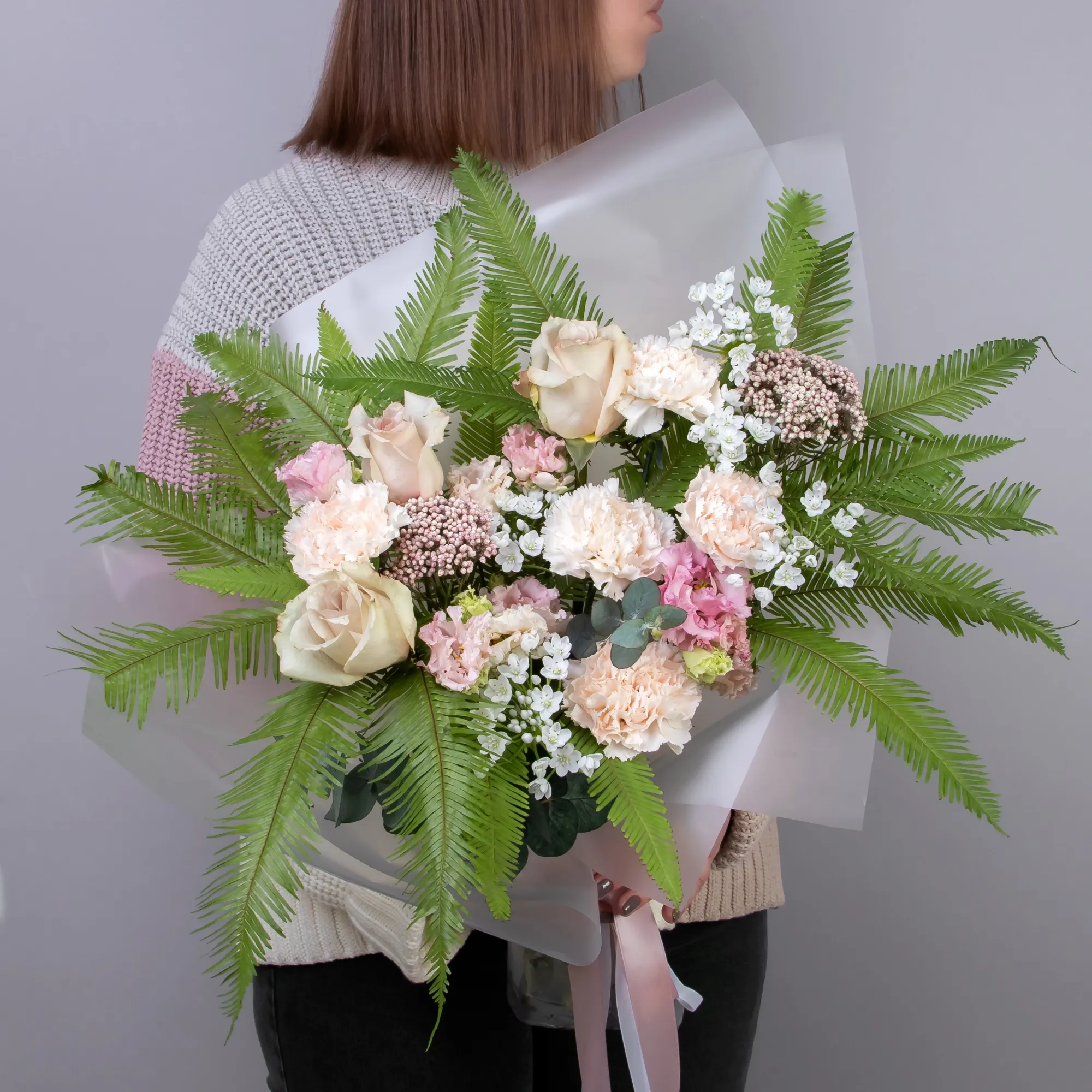 Лизиантус-4, Гвоздика-5, Роза-3, Эустома-4, Листья эвкалипта-2, Аллиум-5, Озатамнус-2, Листья амбрелла-4
