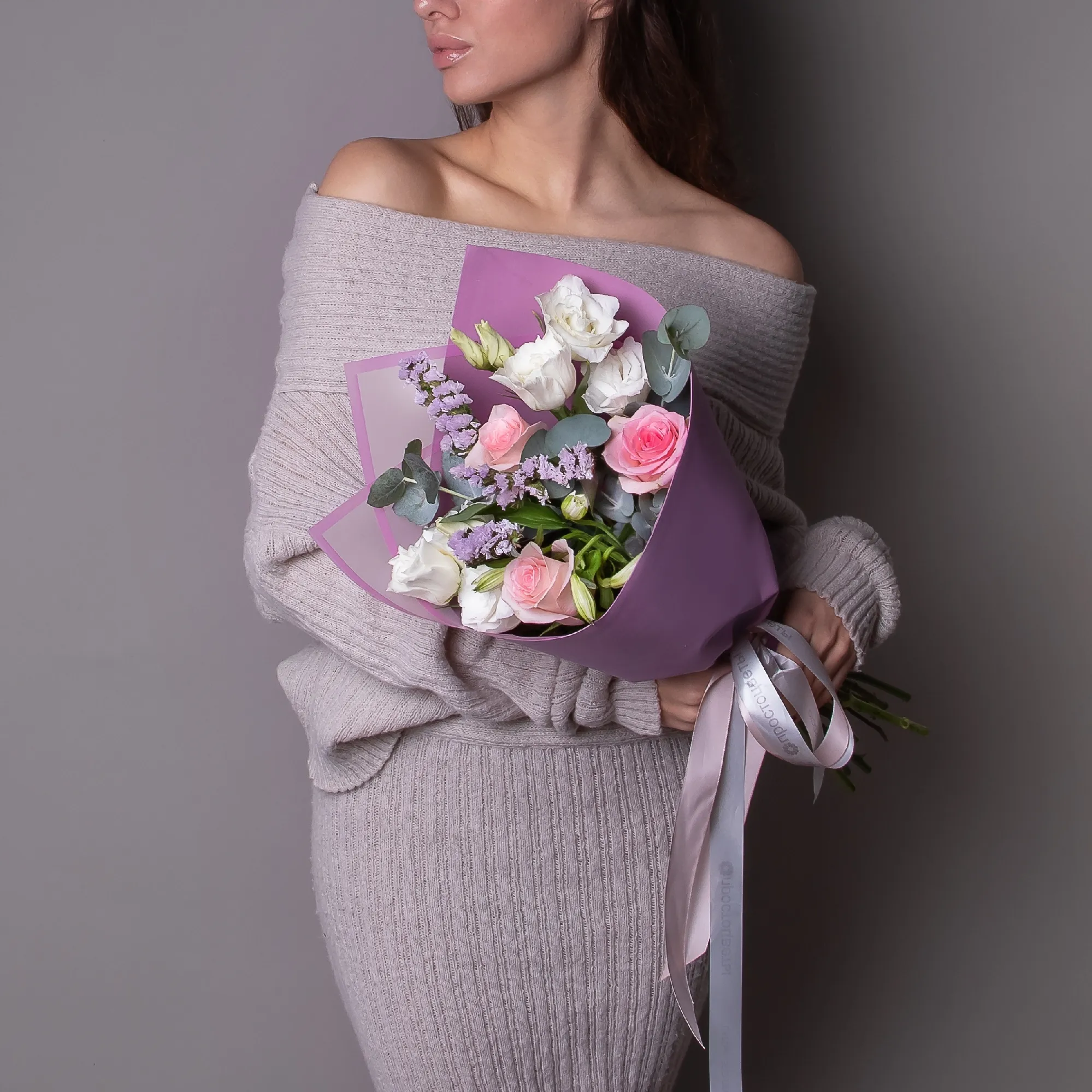 В составе букета "Адель" в размере XS белая альстромерия, лизиантус, роза "Аква" и сиреневая статица. Букет дополнен листьями фисташки и эвкалипта. Идеально подойдёт под любой формат торжества и по любому поводу, будь то романтическая прогулка, юбилей или день рождения близкого человека.