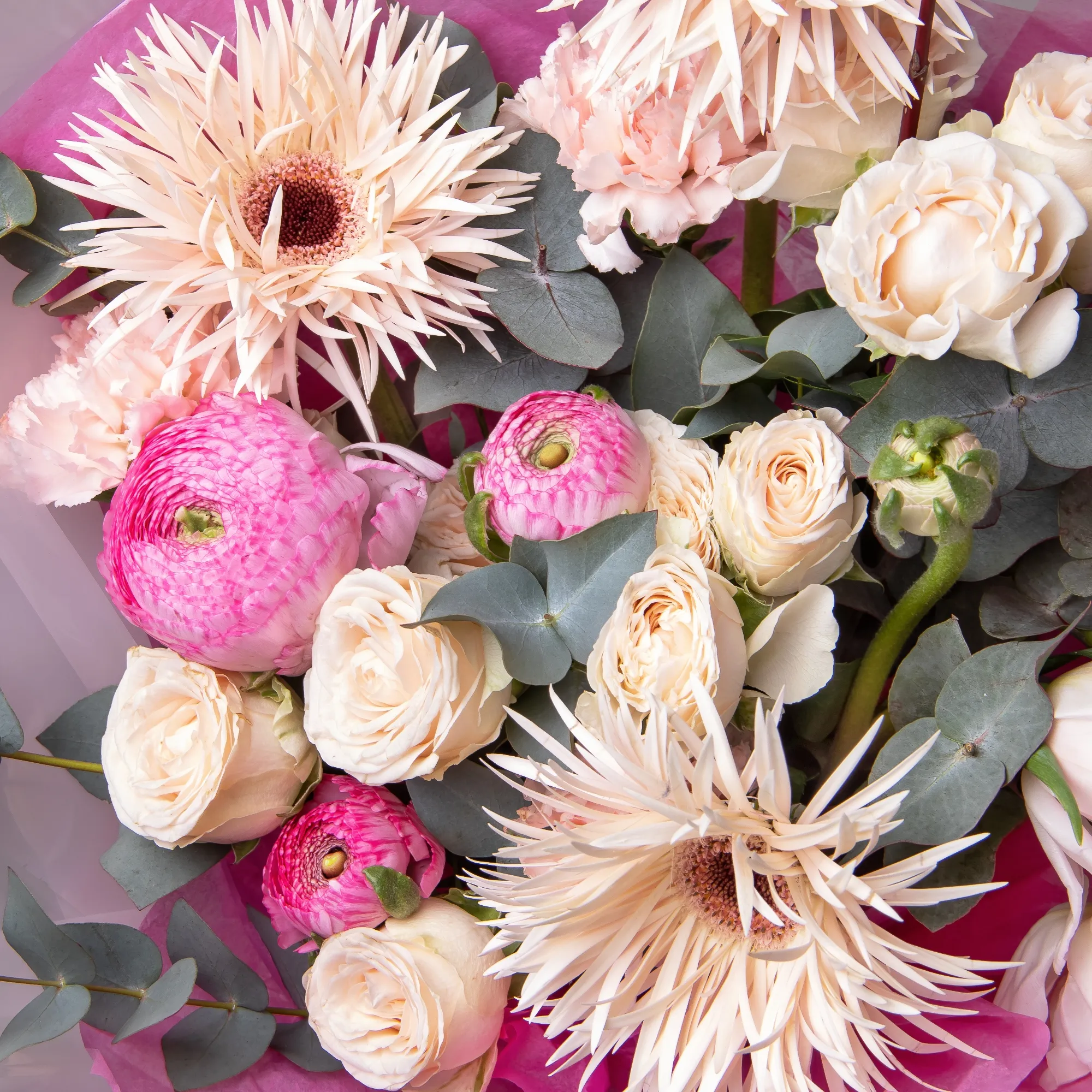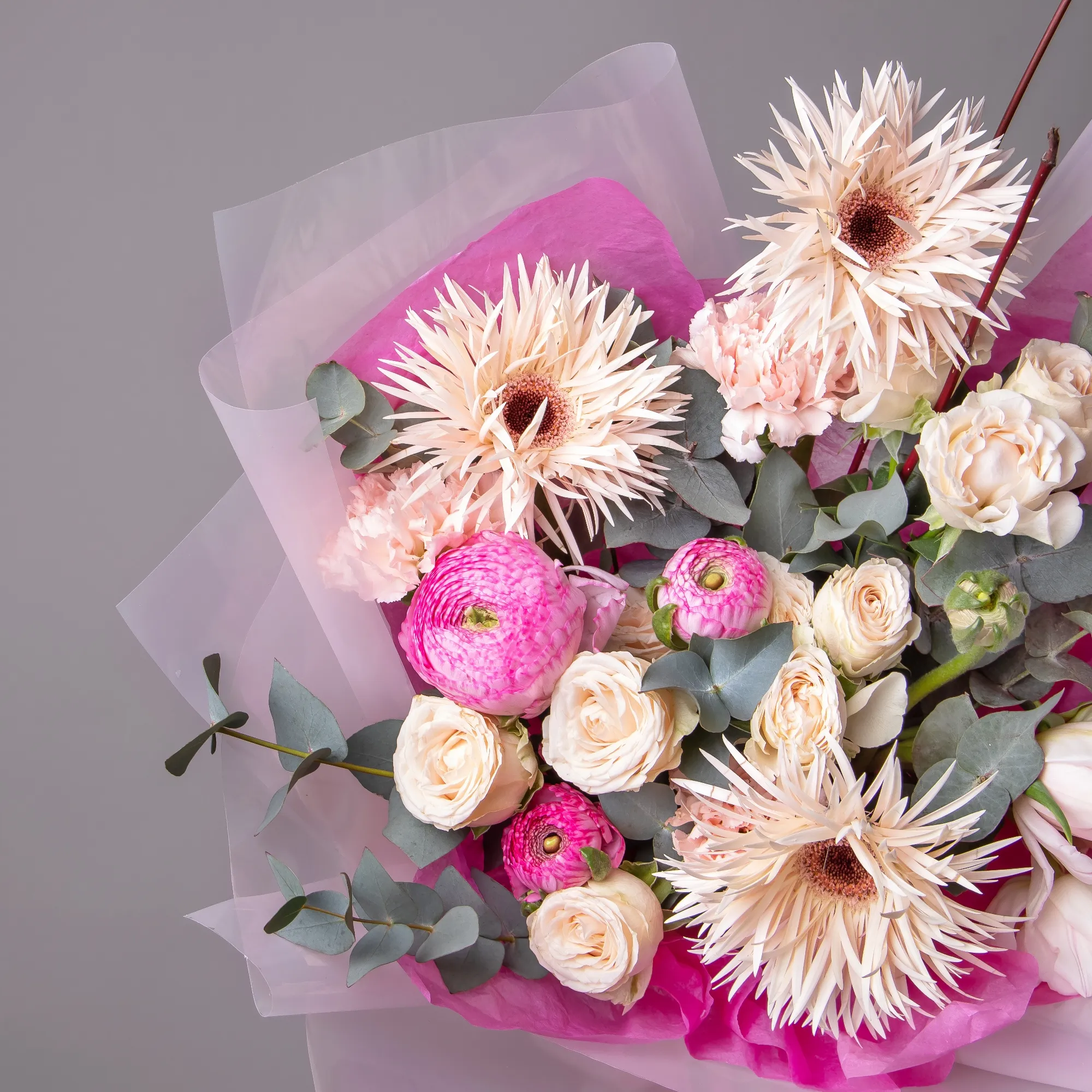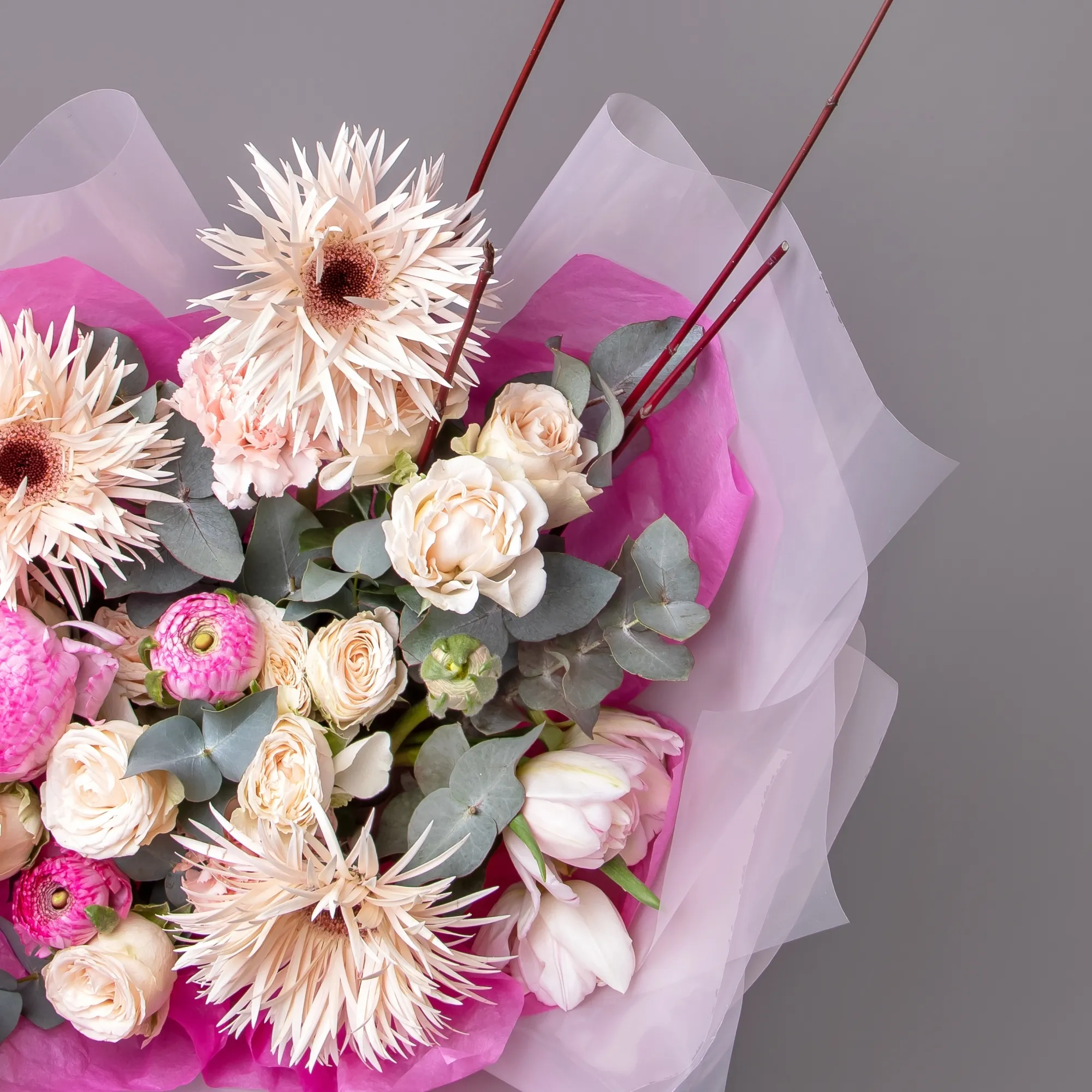 Гвоздика-3, Гербера-3, Тюльпан-3, Роза кустовая-3, Ранункулюс-3, Листья эвкалипта-3