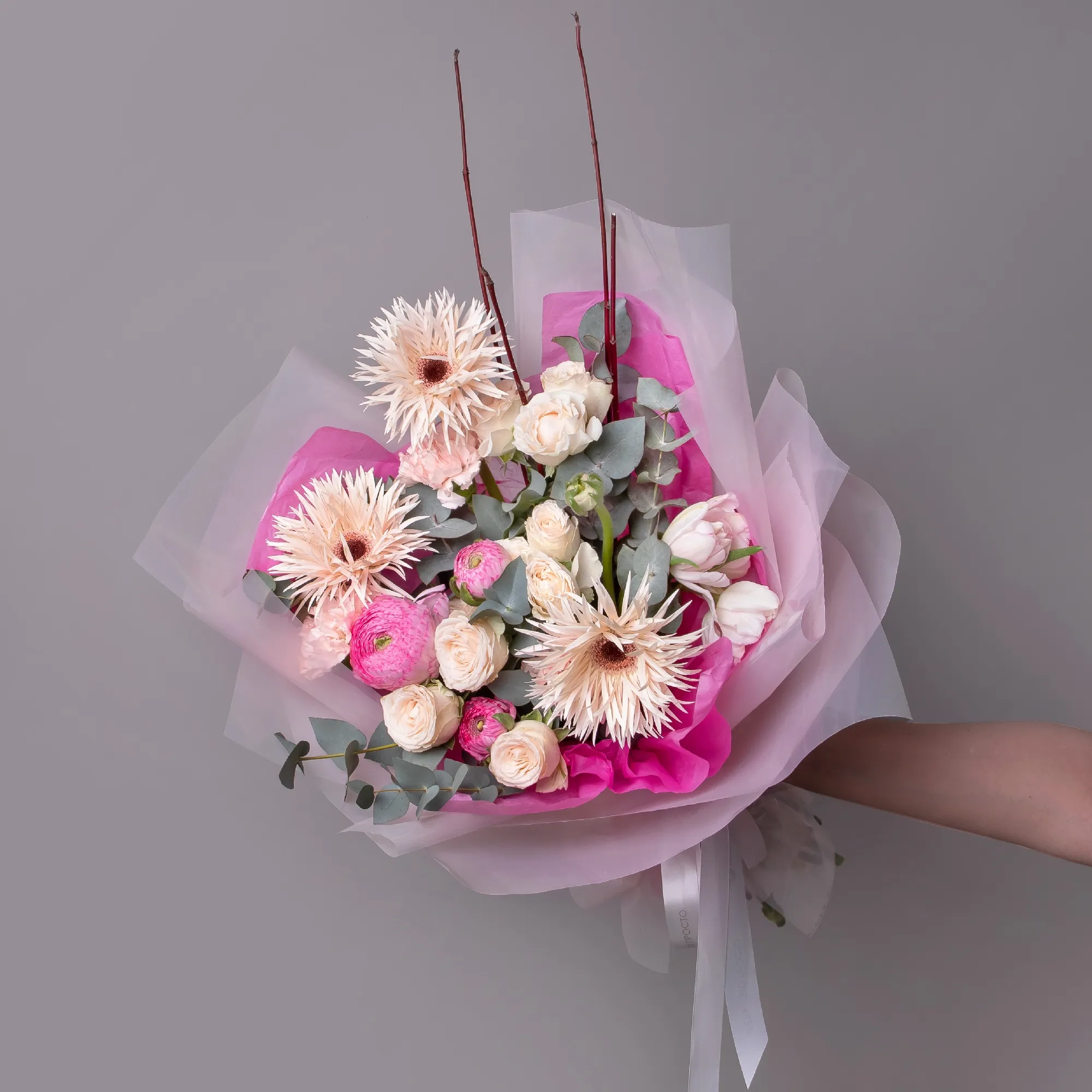 В составе букета "Афина" светло-персиковая гербера, розовый ранункулус, нежно-розовый тюльпан, кустовая роза сорта "Софи", розовая гвоздика. Трендовость и элегантность придают букету цветущие ветки. Преподнесите этот букет ценительнице утонченной красоты. Букет "Афина" - когда слова бессильны, но цветы все скажут за вас.