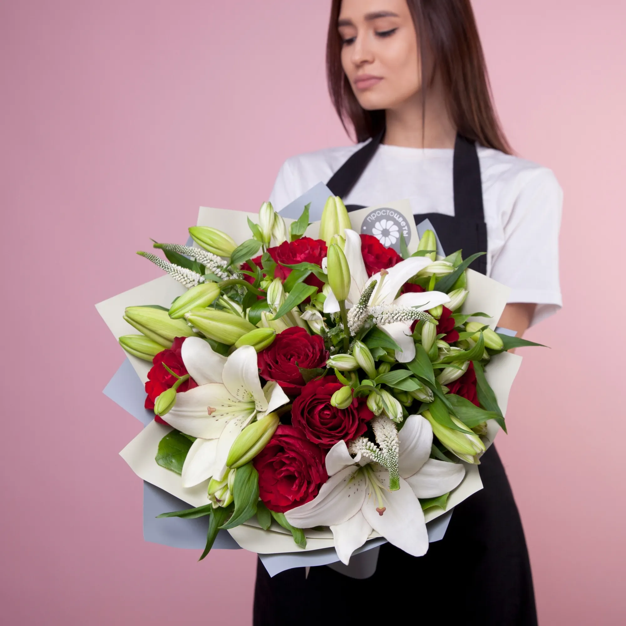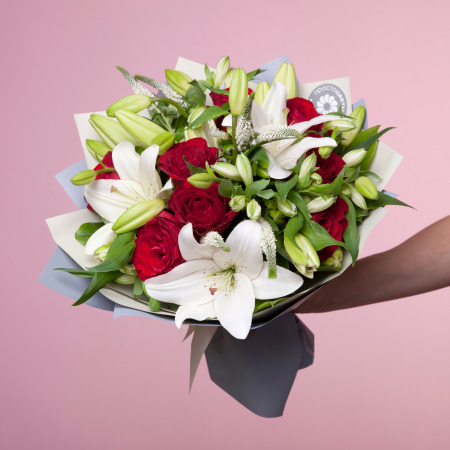 Букет, названный в честь богини любви, полностью оправдывает свое название. Красные розы - главный символ любви, потрясающе контрастируют с ароматными белыми лилиями. Для полноты картины в букете также присутствуют белая альстромерия и нежная кустовая вероника
