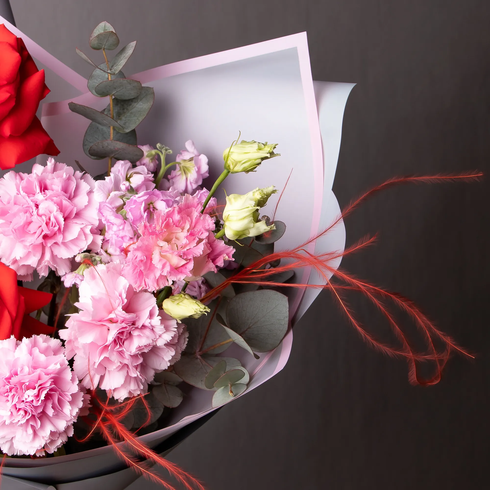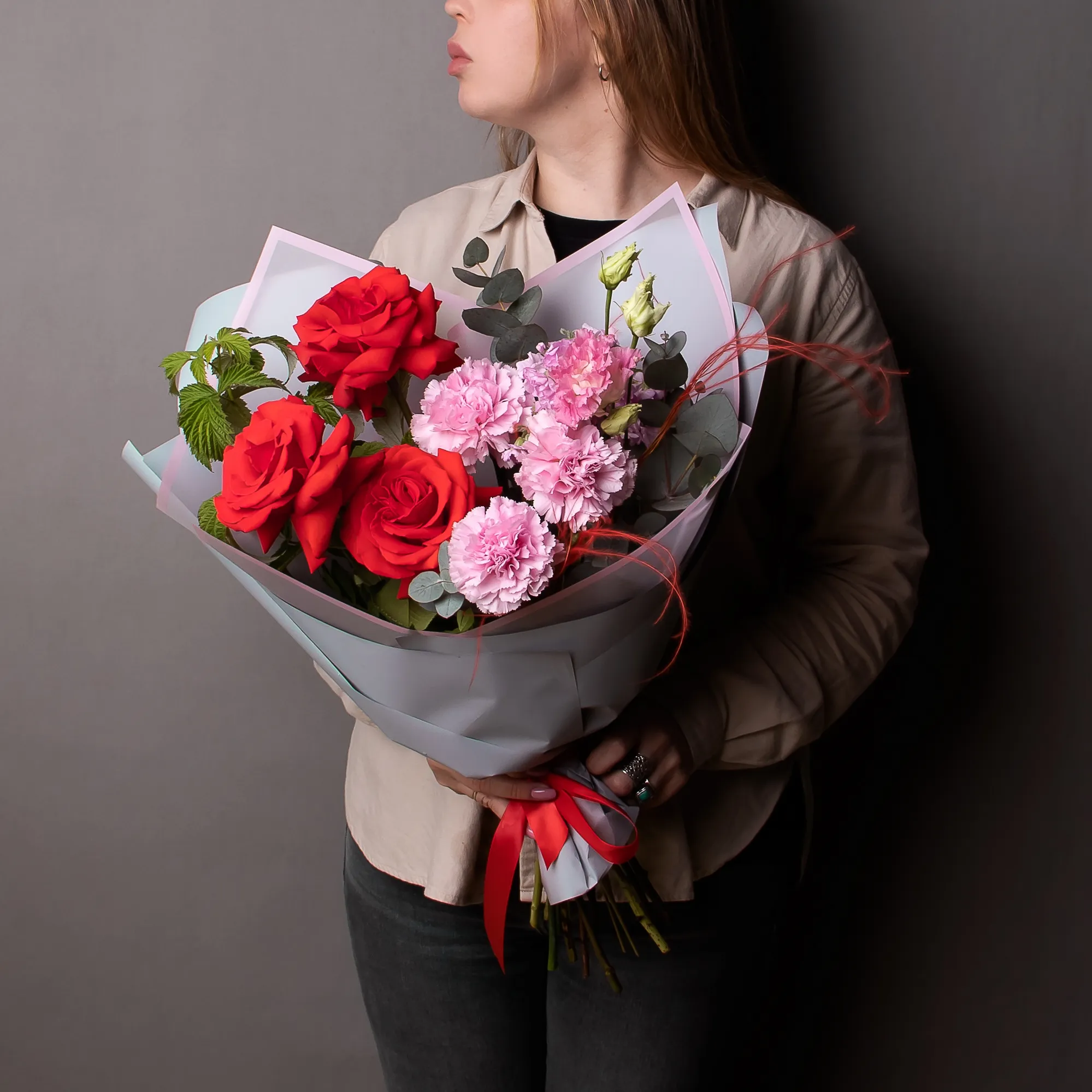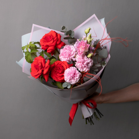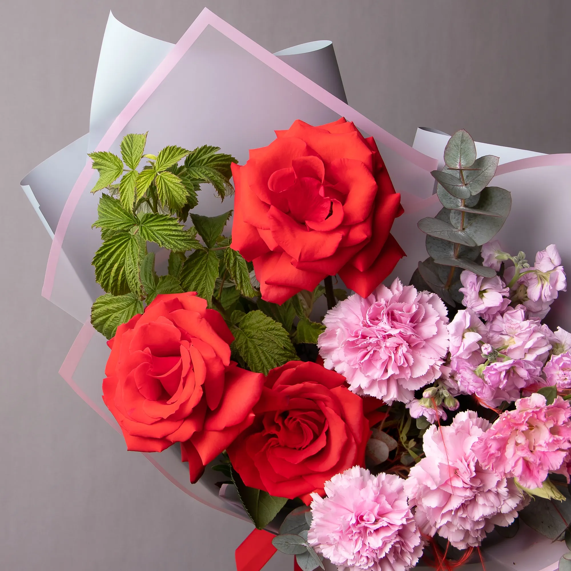 Гвоздика-3, Роза-3, Эустома-1, Ветки малины-1, Листья фисташки-4, Листья эвкалипта-2