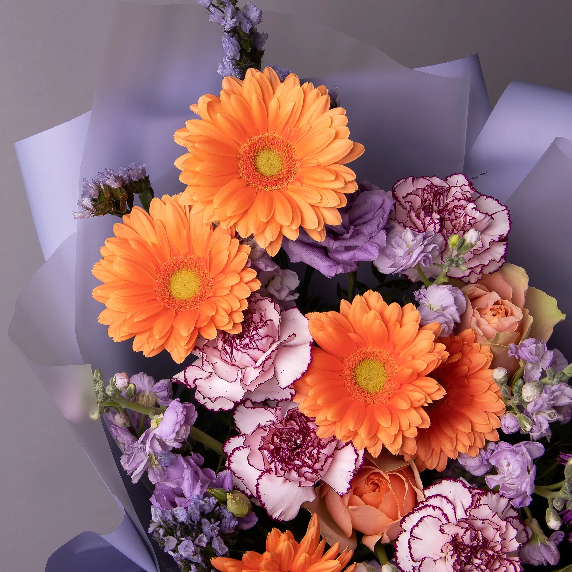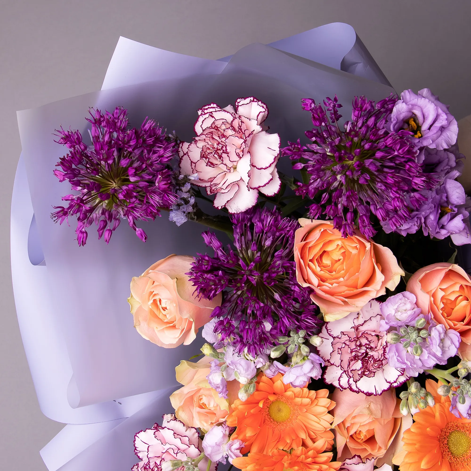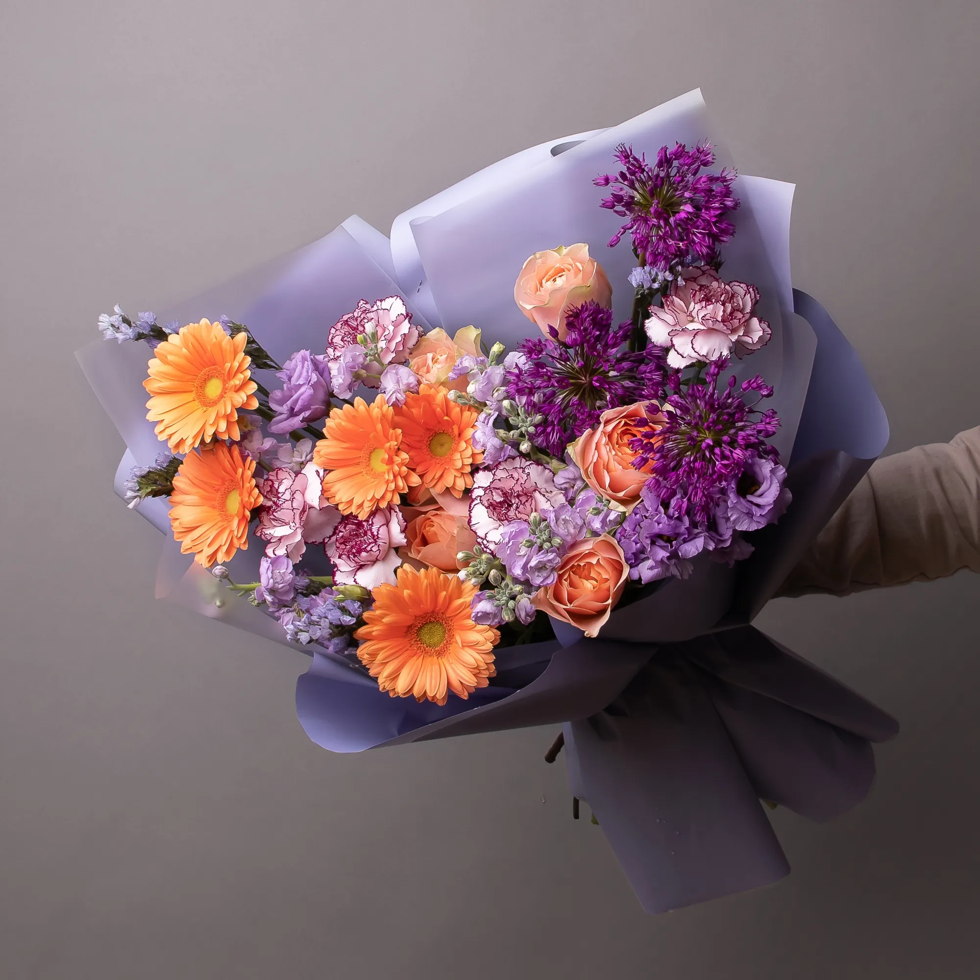 Когда под одной шелковой лентой встречается сочетание из оранжевых гермини, лавандовых матиоллы, лизиантуса и гвоздики, кремовых роз и фиолетового алииума, бережно окруженных листьями фисташки и сиреневой статицей - получается букет "Амур", который прекрасно подойдет для подарка на памятную дату и профессиональные успехи.