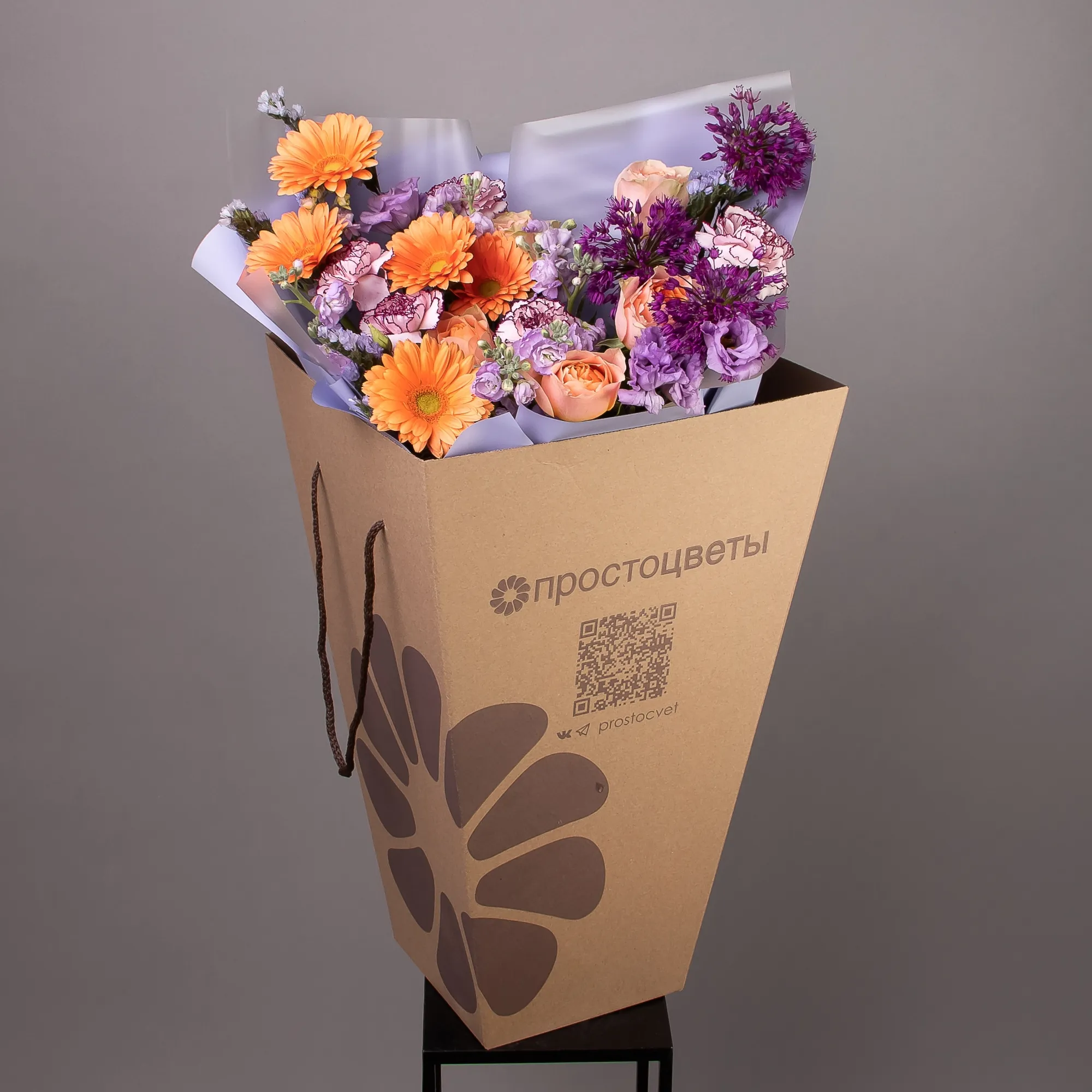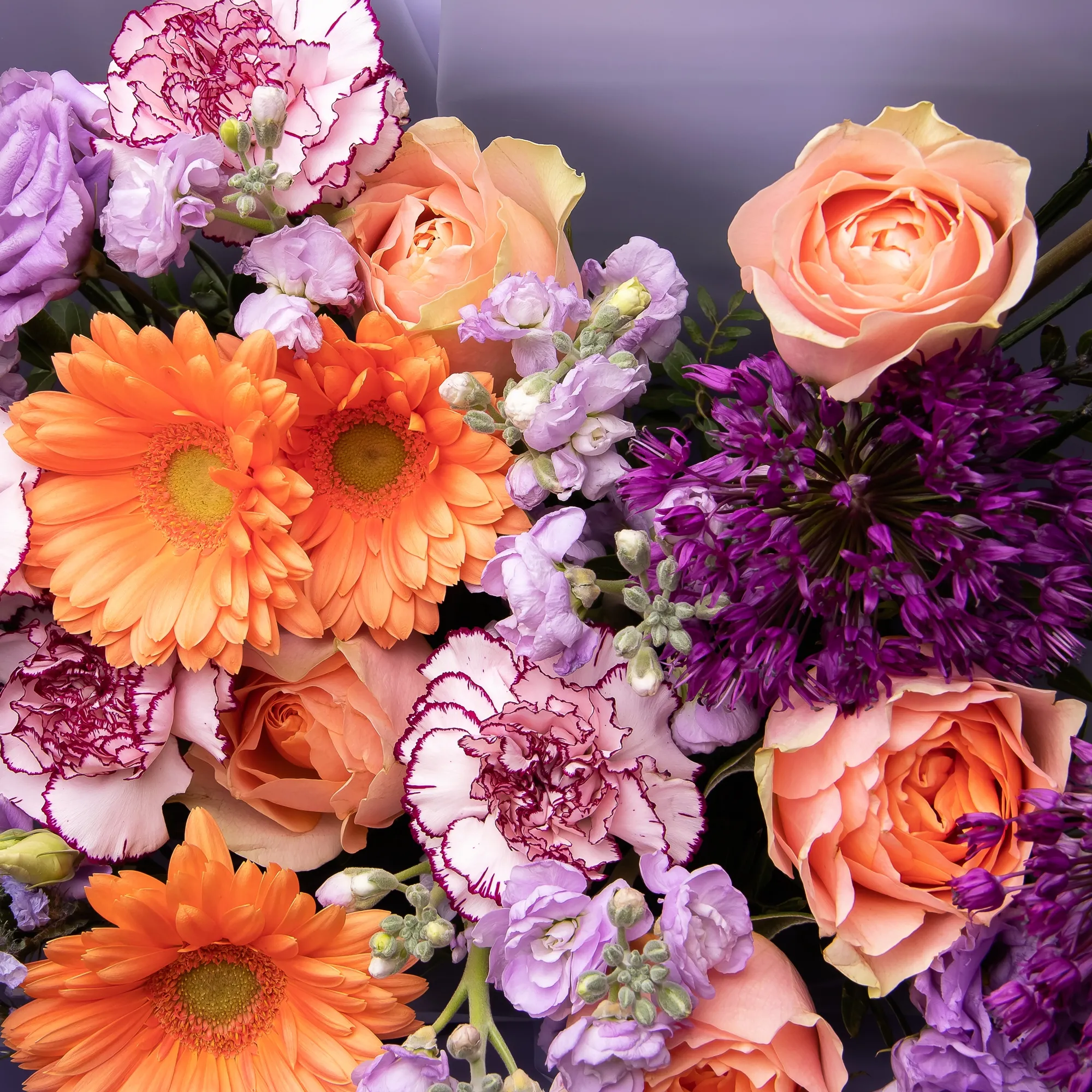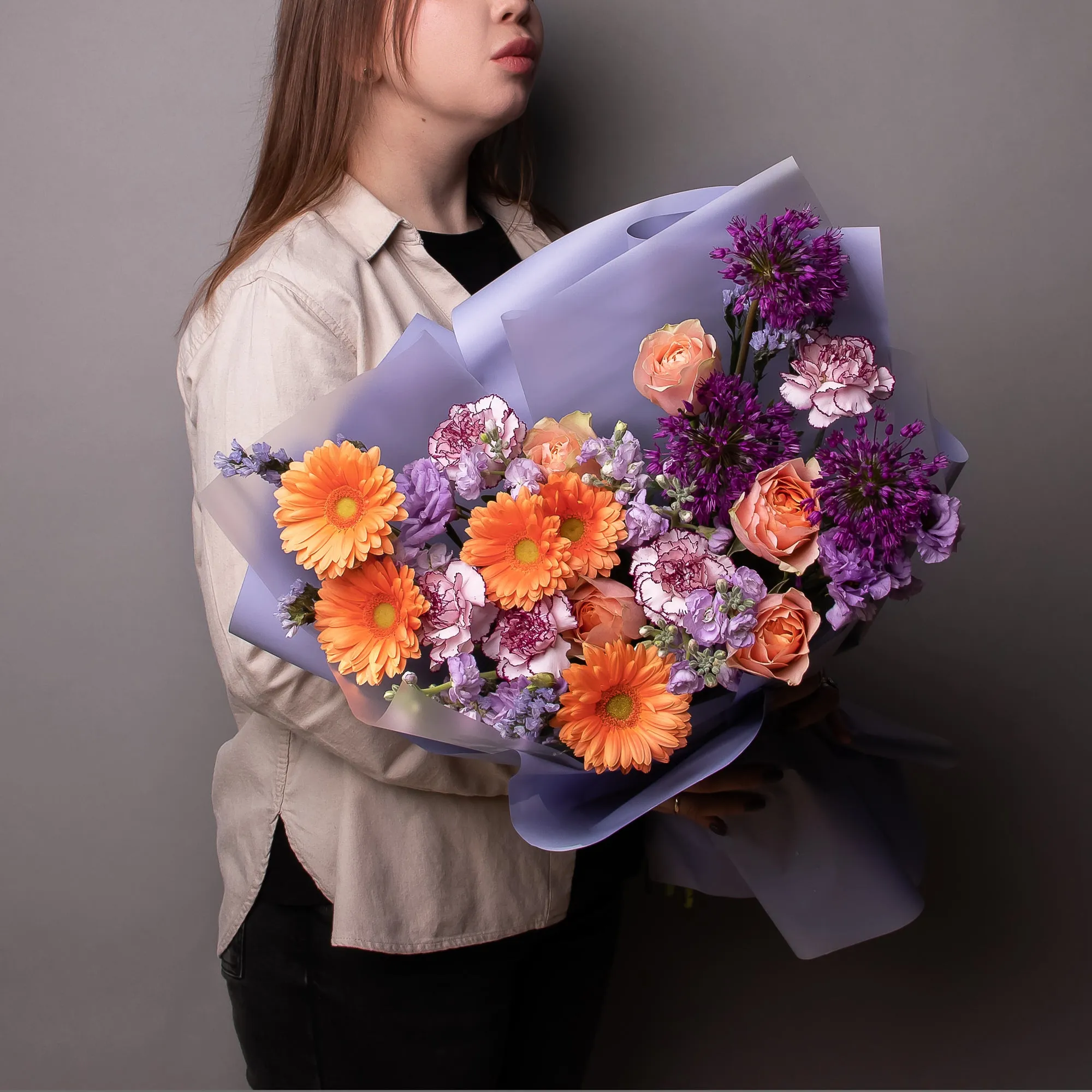 Когда под одной шелковой лентой встречается сочетание из оранжевых гермини, лавандовых матиоллы, лизиантуса и гвоздики, кремовых роз и фиолетового алииума, бережно окруженных листьями фисташки и сиреневой статицей - получается букет "Амур", который прекрасно подойдет для подарка на памятную дату и профессиональные успехи.