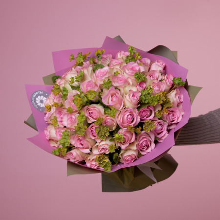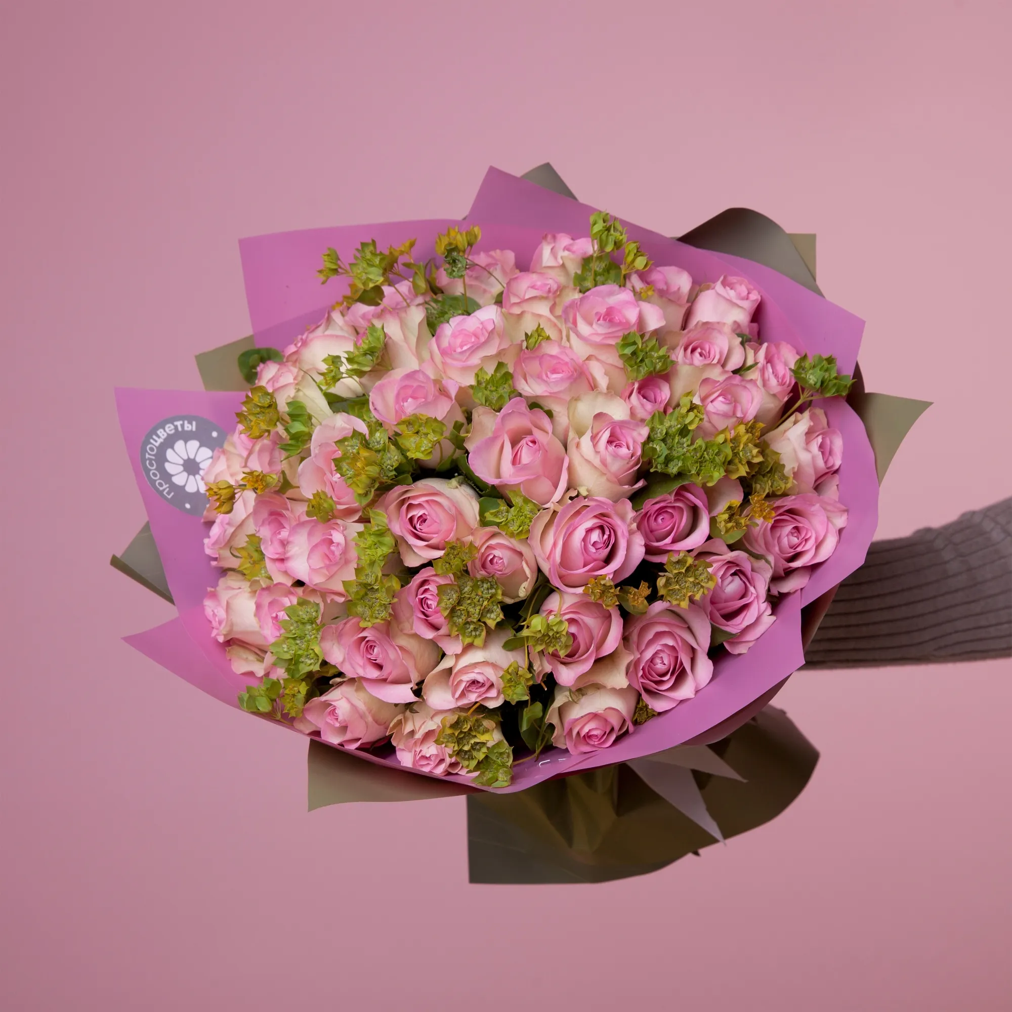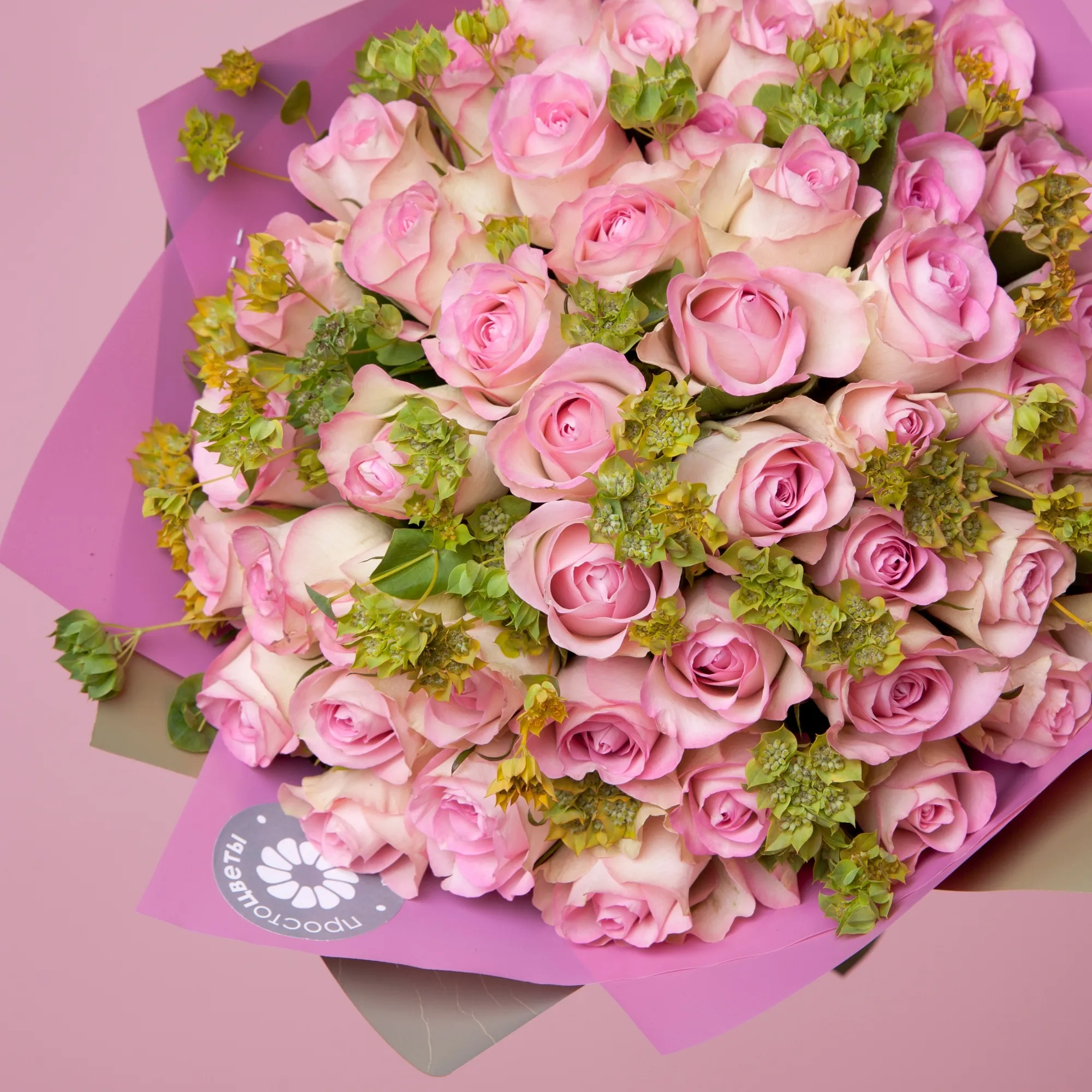 Классический круглый букет из пыльно-розовых роз и воздушного буплерума. Букет для нежных и романтичных девушек.