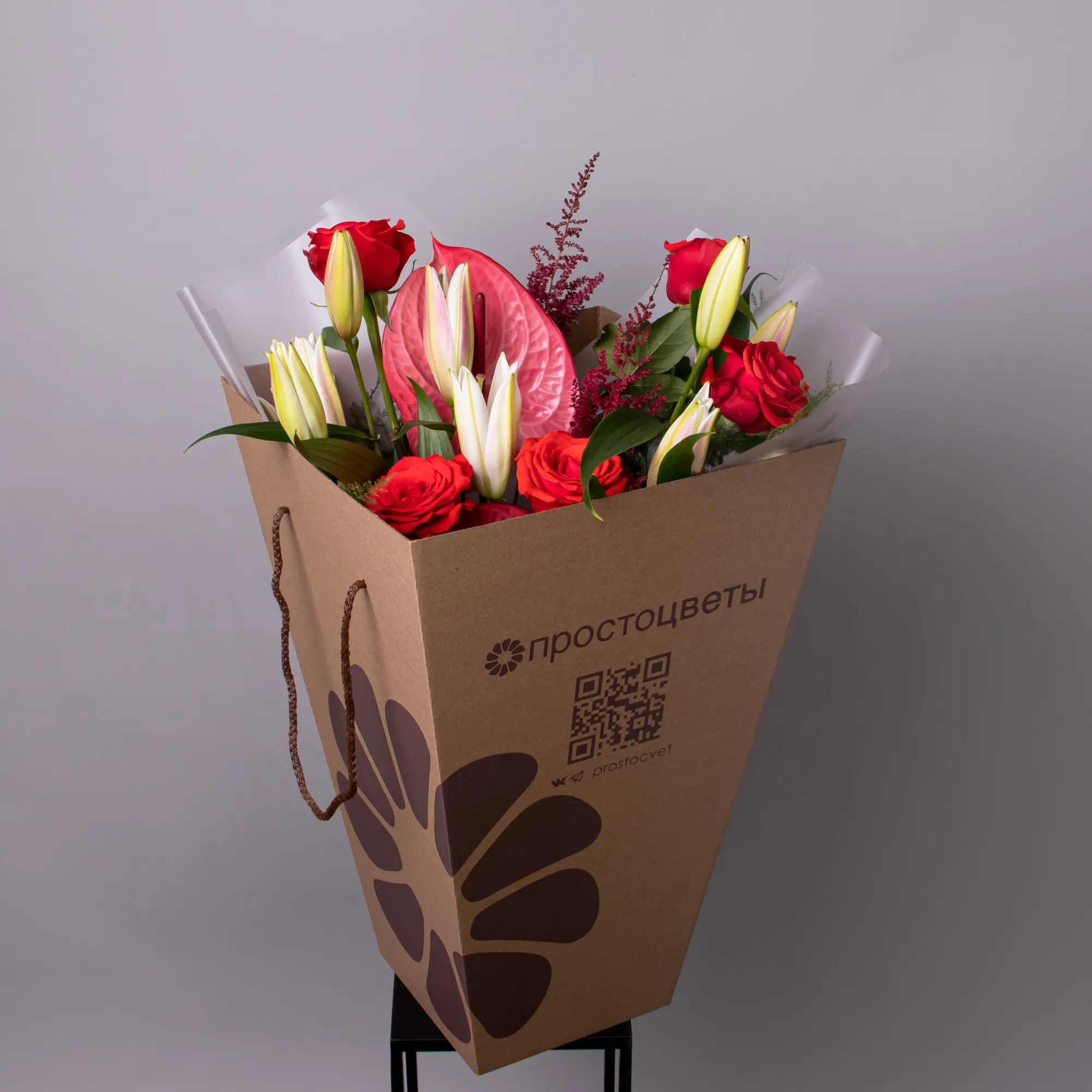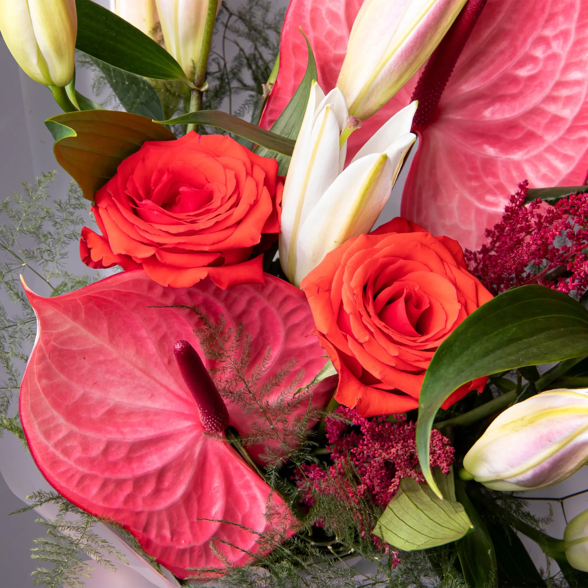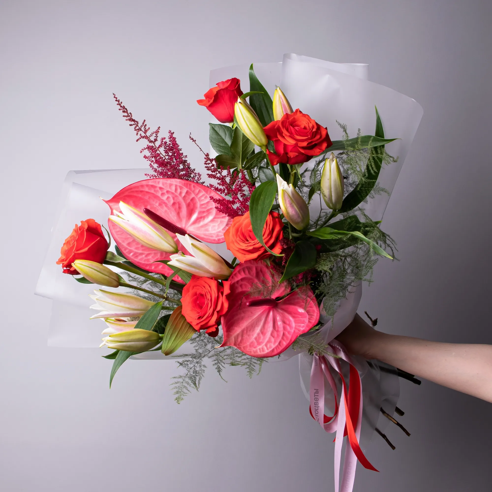 Роза-5, Лилия-2, Антуриум-2, Листья аспарагус-5, Листья фисташки-5