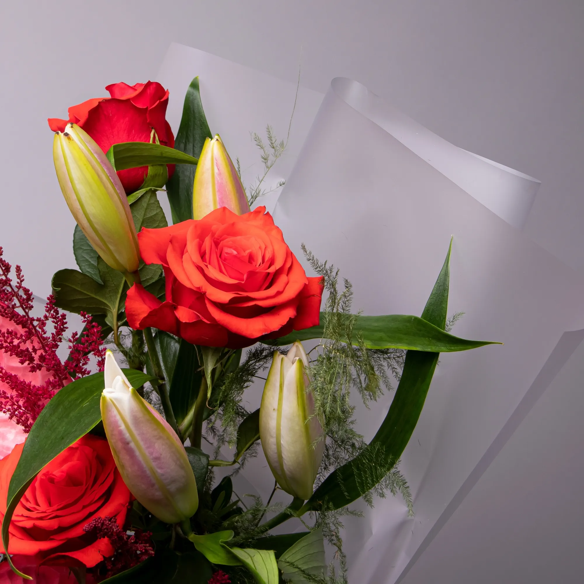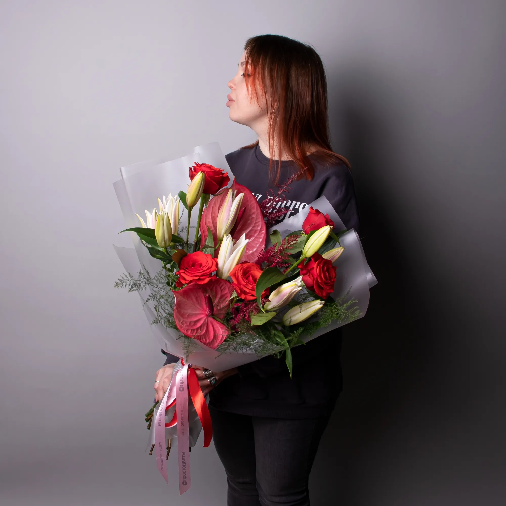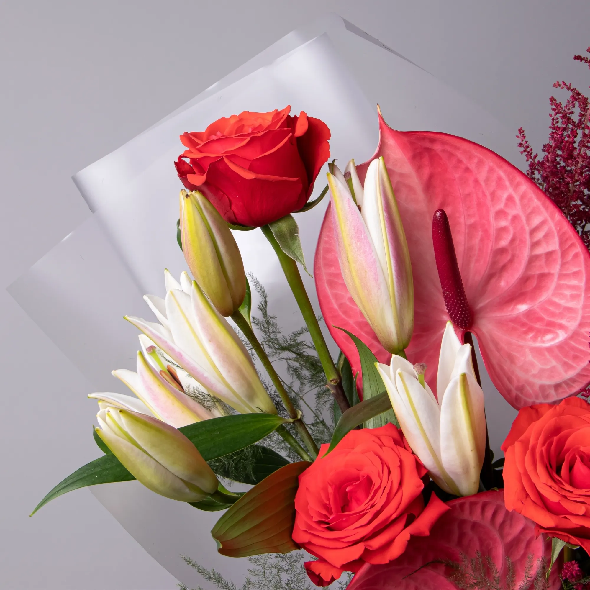Роза-5, Лилия-2, Антуриум-2, Листья аспарагус-5, Листья фисташки-5