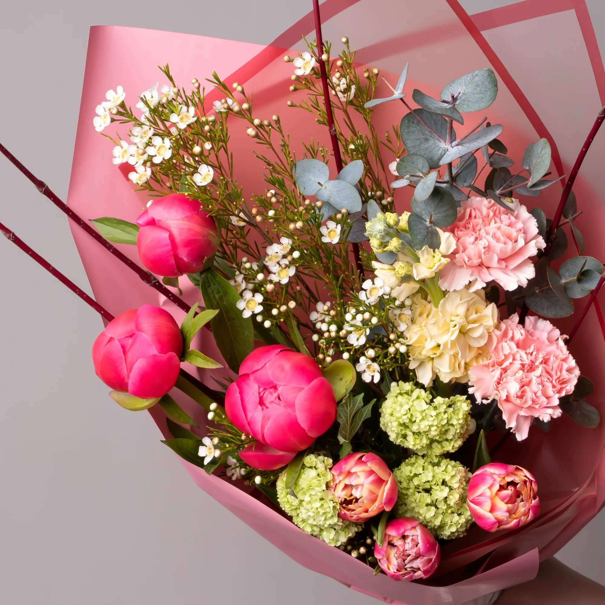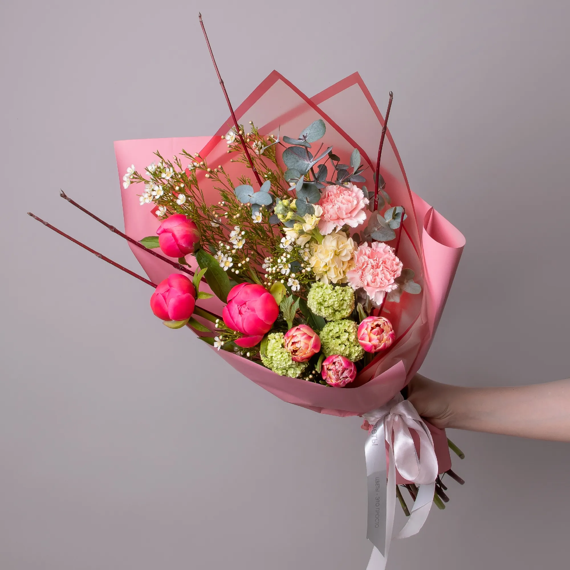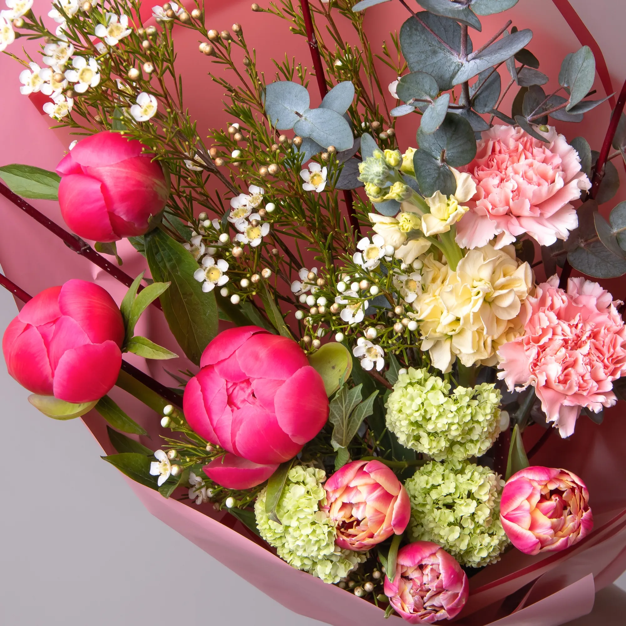 В составе букета "Ариэль" меняющий цвет пион "Корал шарм", розовая гвоздика, белый хамелациум, кремовая маттиола, тюльпан бело-розовый, ярко-салатовый вибурнум, а также листья фисташки и эвкалипта.