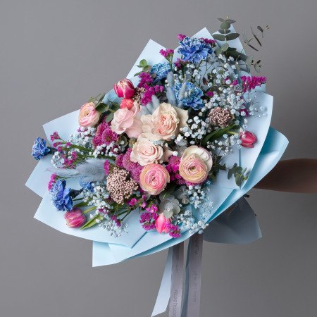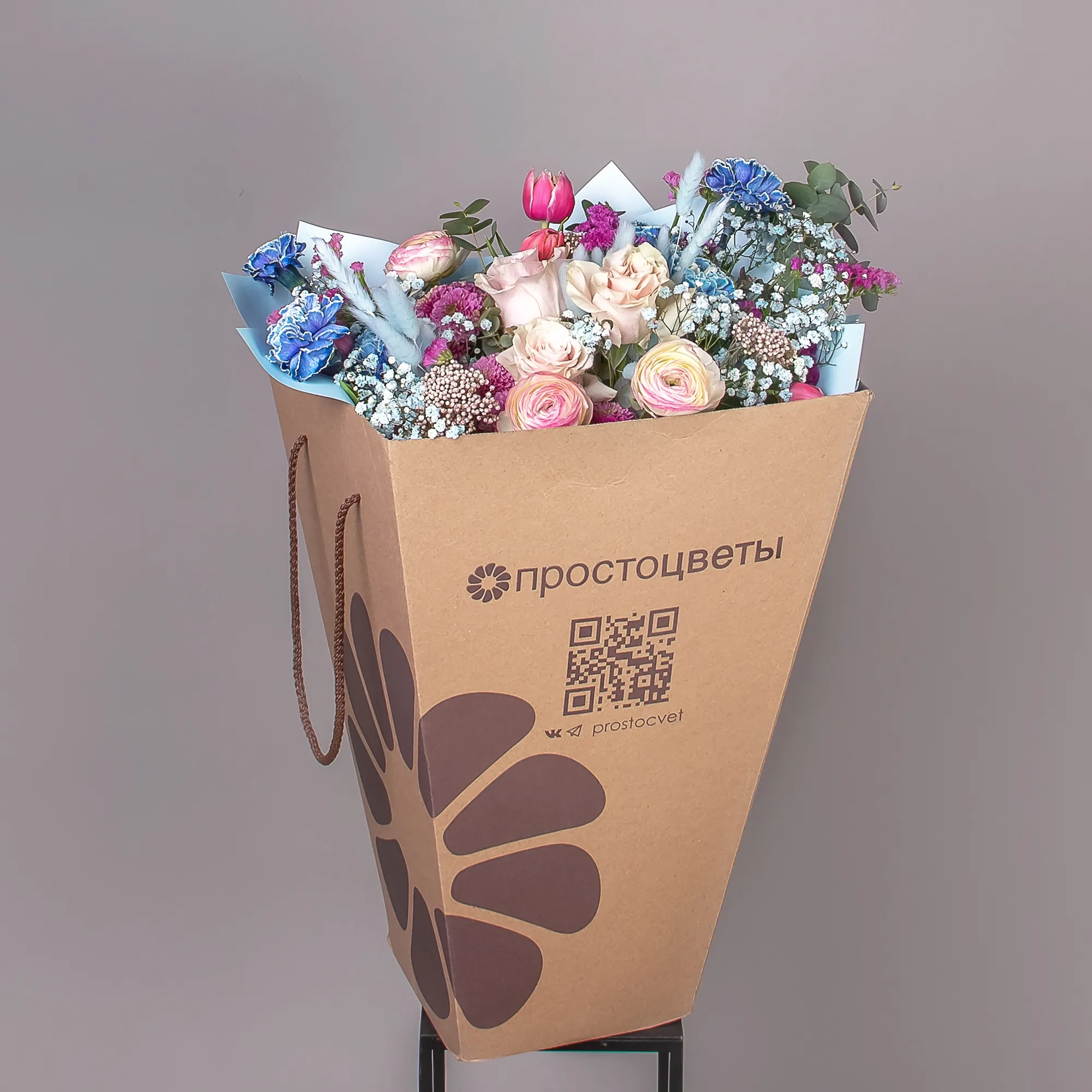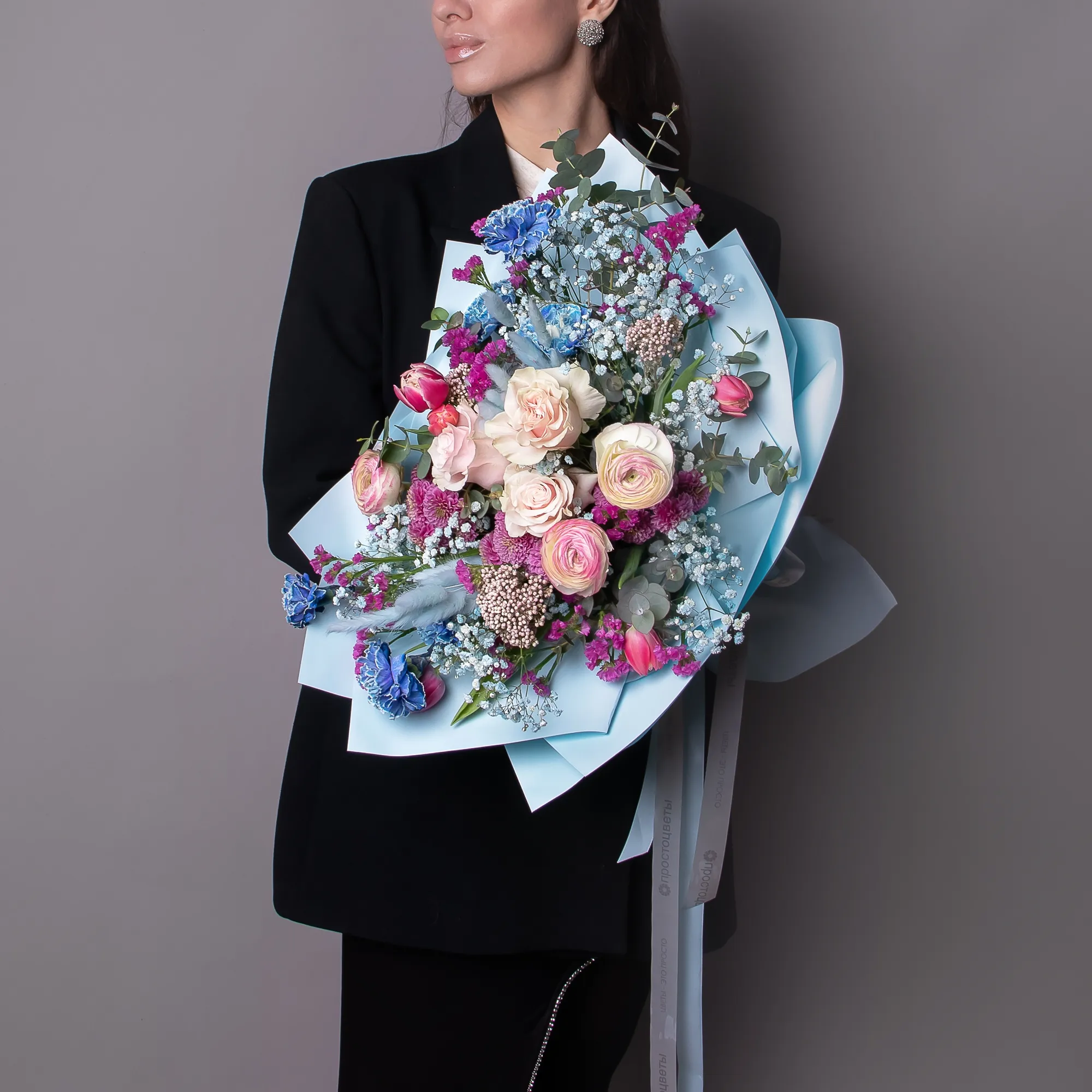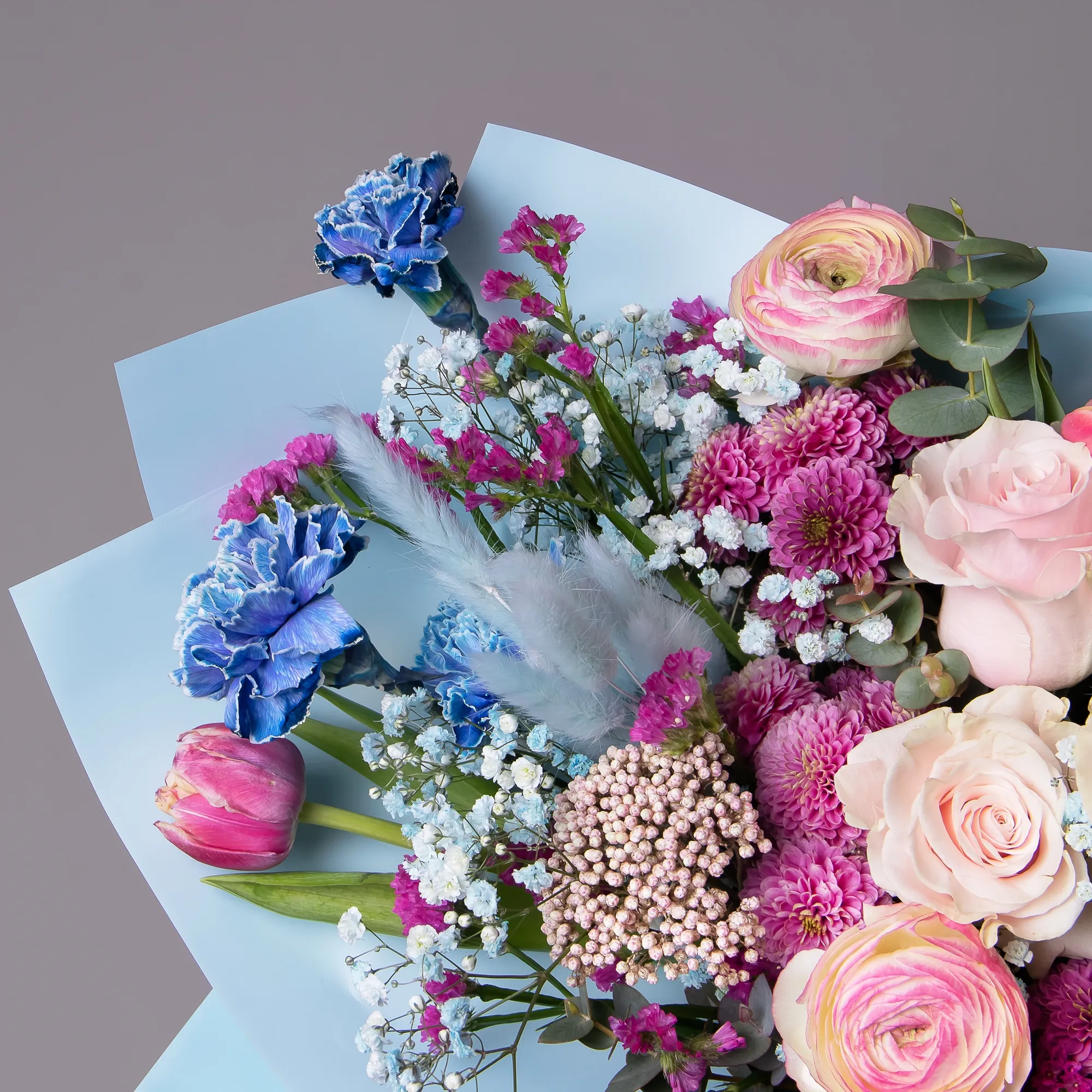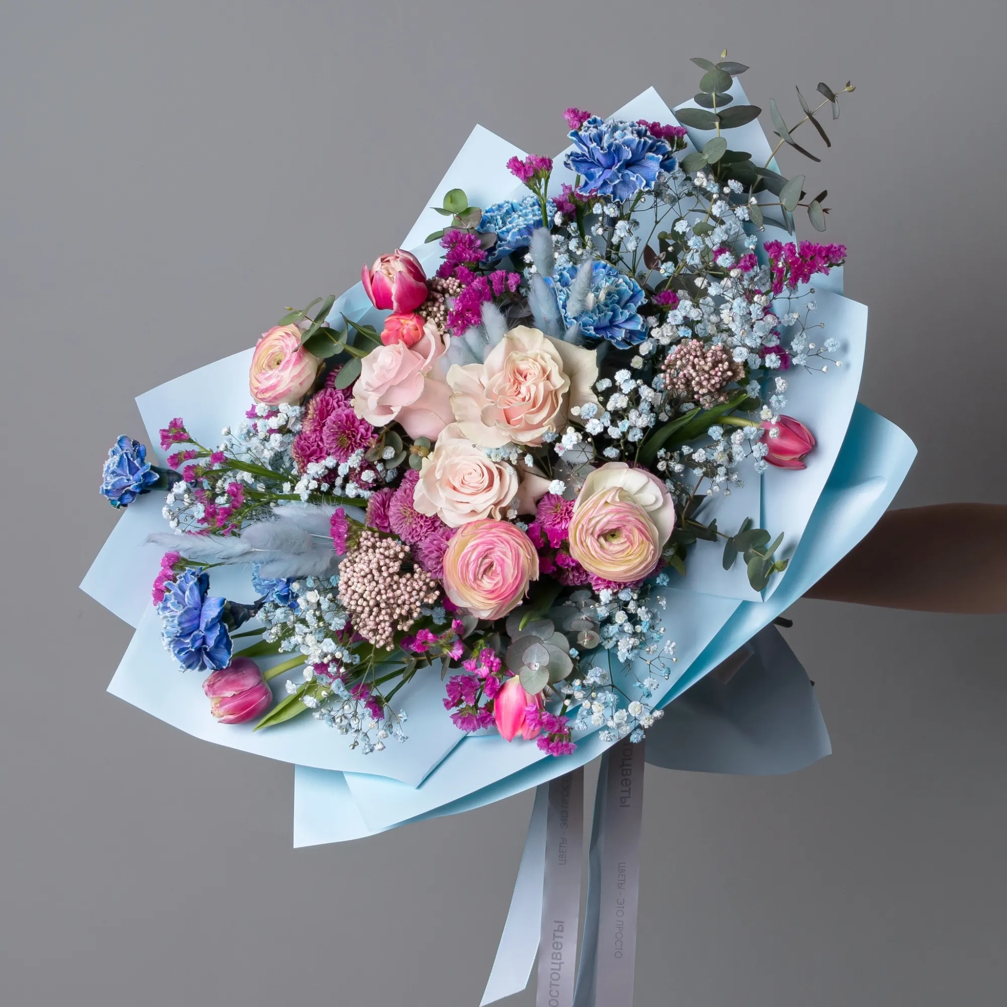 Гвоздика-6, Роза-3, Тюльпан-5, Хризантема-3, Ранункулюс-5, Листья эвкалипта-3