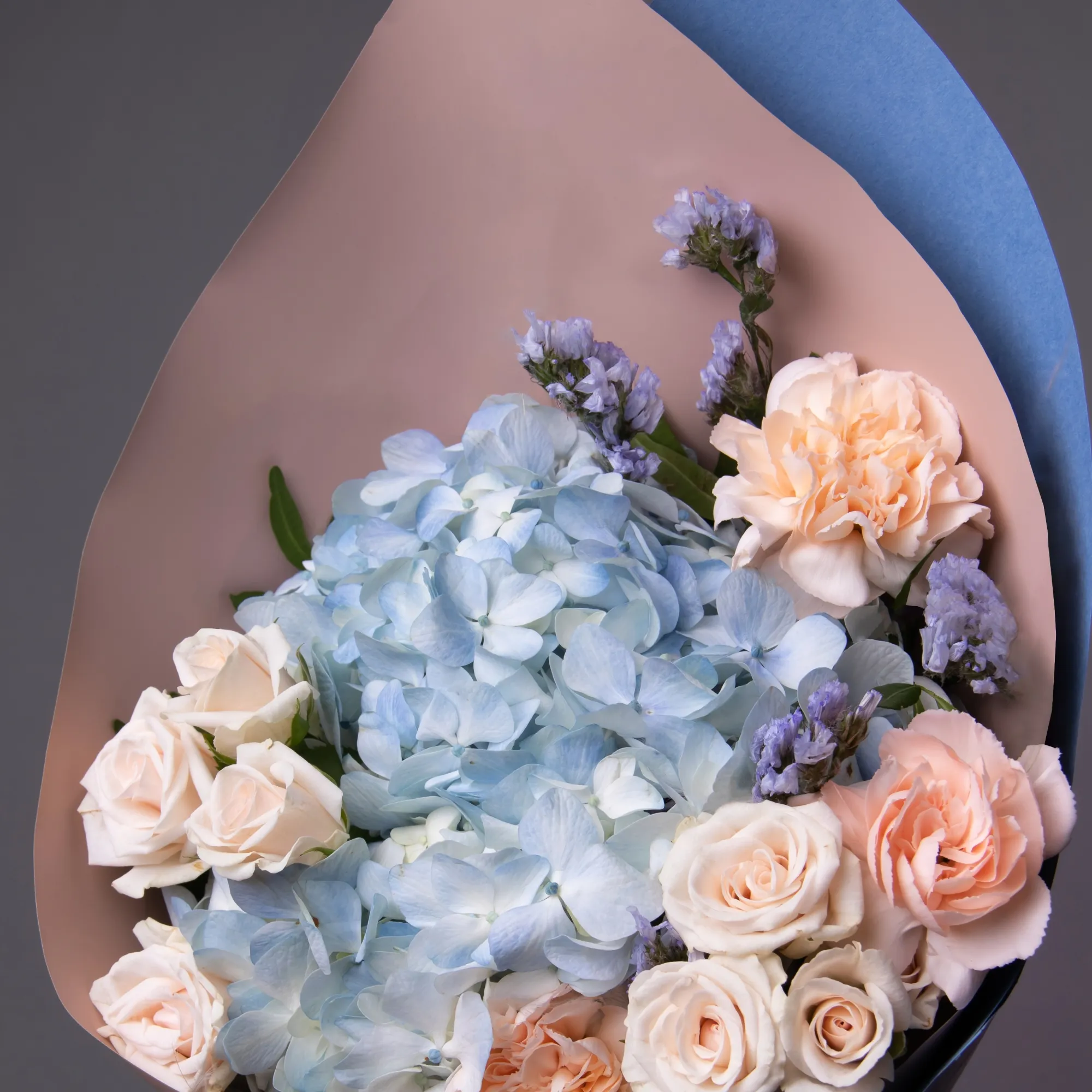 Букет из голубой гортензии и кустовых роз "Айскрим S"