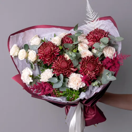 Гвоздика-5, Хризантема-5, Роза кустовая-3, Листья фисташки-5, Листья эвкалипта-3