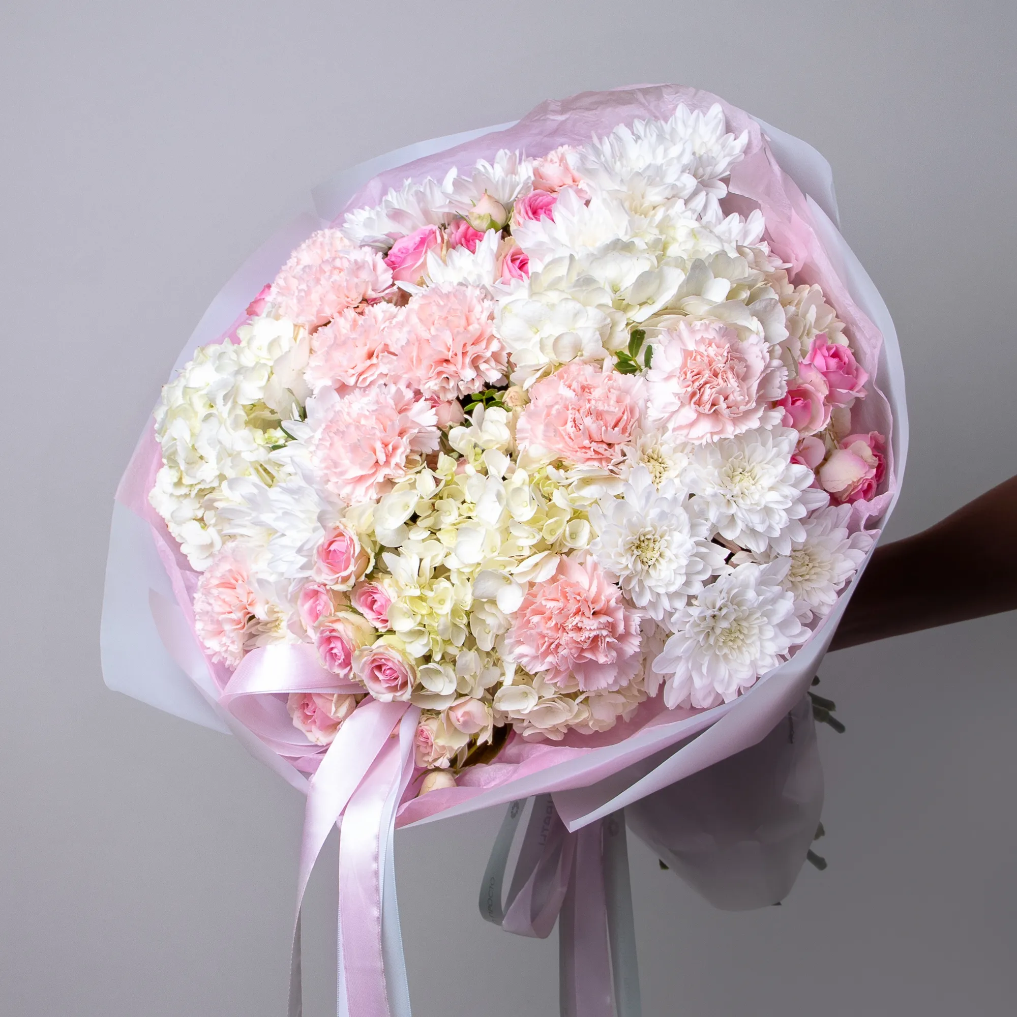 В составе букета "Белое счастье" XL кустовая роза "Динара", белая хризантема, белая гидрангия, белая гвоздика и листья фисташки.. Отлично подойдет в качестве подарка девушке, которая обожает нежные оттенки и воздушные текстуры. Идеален в роли подарка на свадьбу благодаря своей светлой гамме.