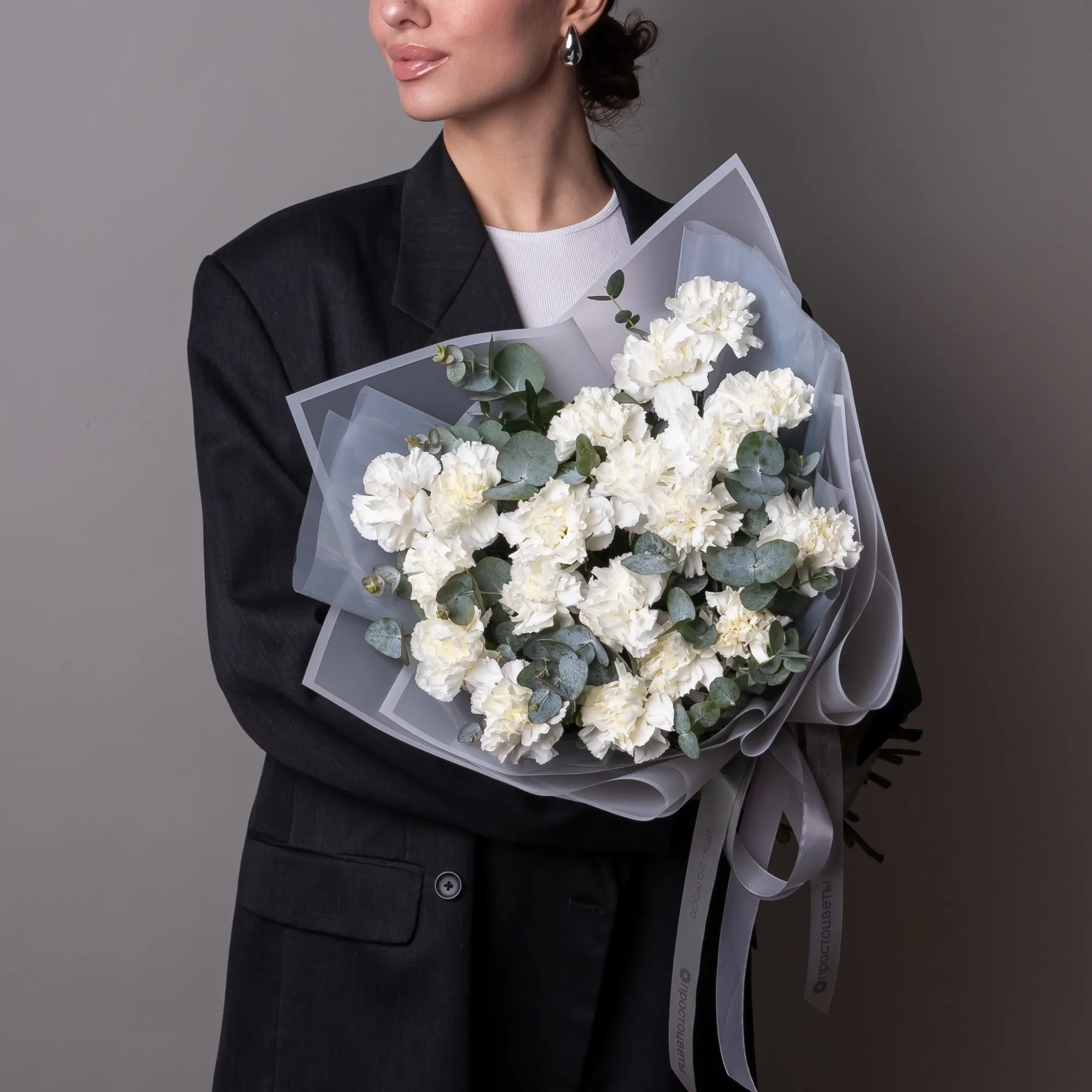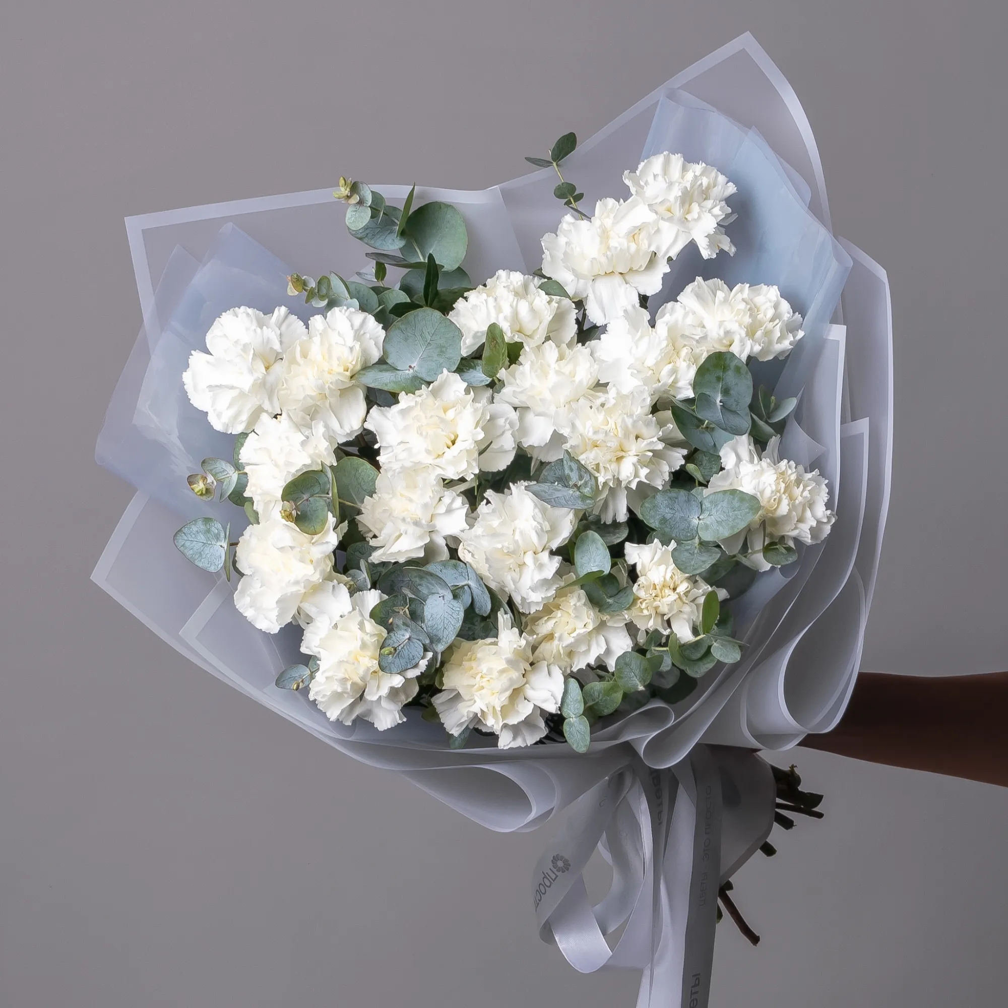 Монобукет из кружевной розовой гвоздики сорта "Лотус" и листьев эвкалипта. Дополнен лаконичной пыльно-розовой упаковкой и лентой.
