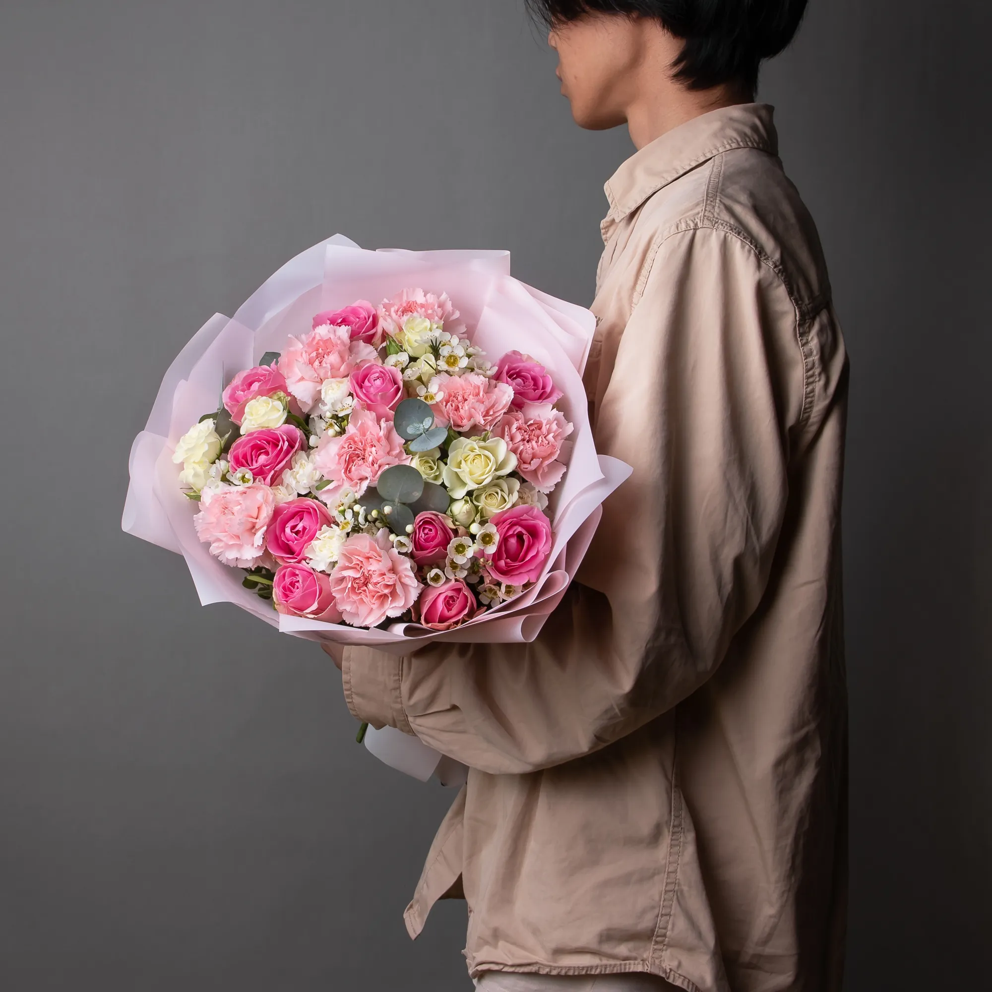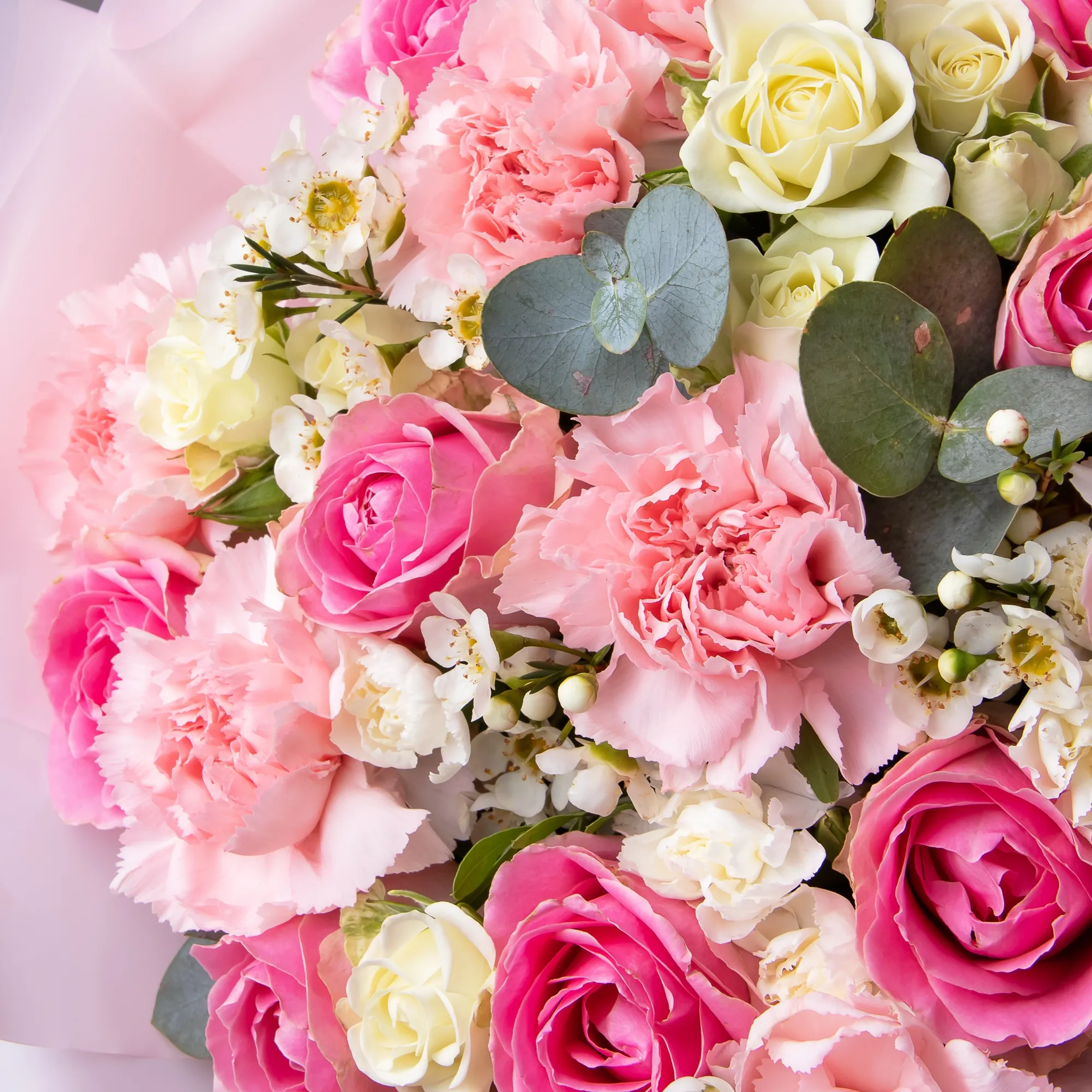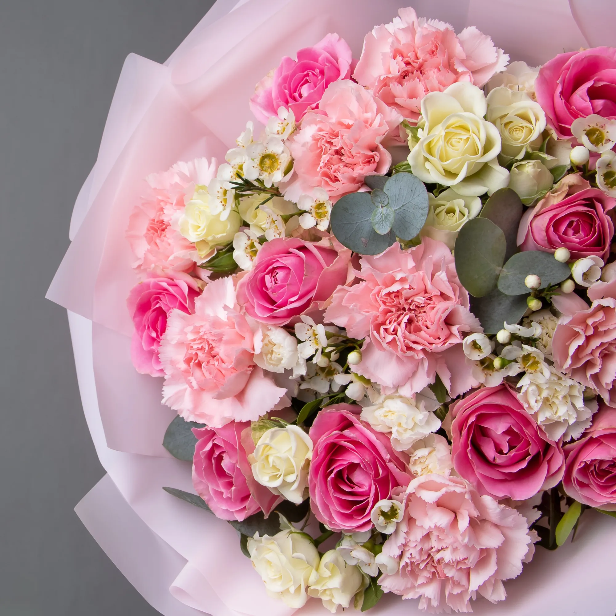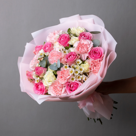 В составе букета "Безмятежность" в размере L роза "Вэм", роза кустовая "Сноу флейк", белый хамелациум, розовая и гвоздика. А также листья фисташки и эвкалипта. Сочетание крупных роз и гвоздик делает общую композицию объемной и выразительной. Букет, который придется по вкусу почти любой девушке.