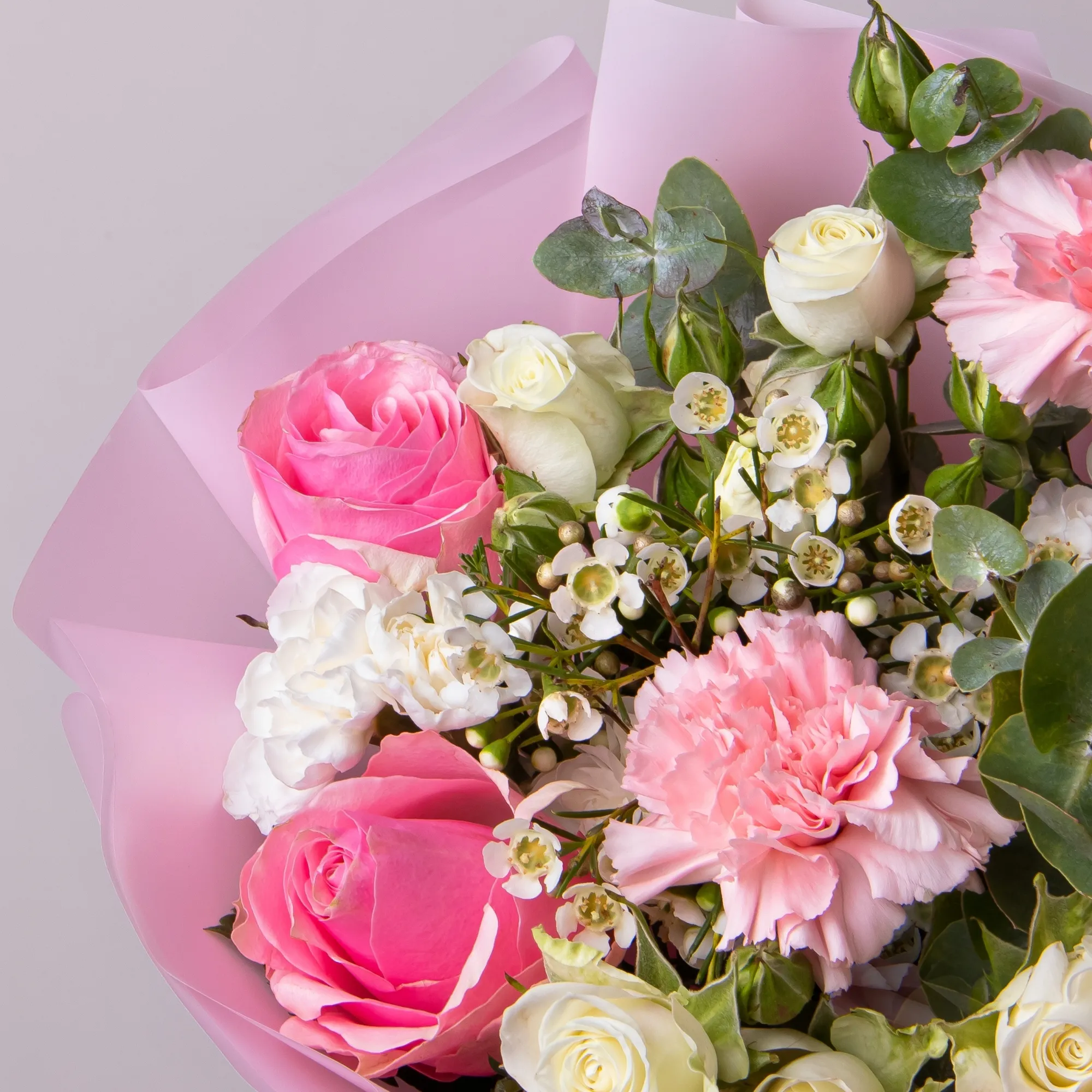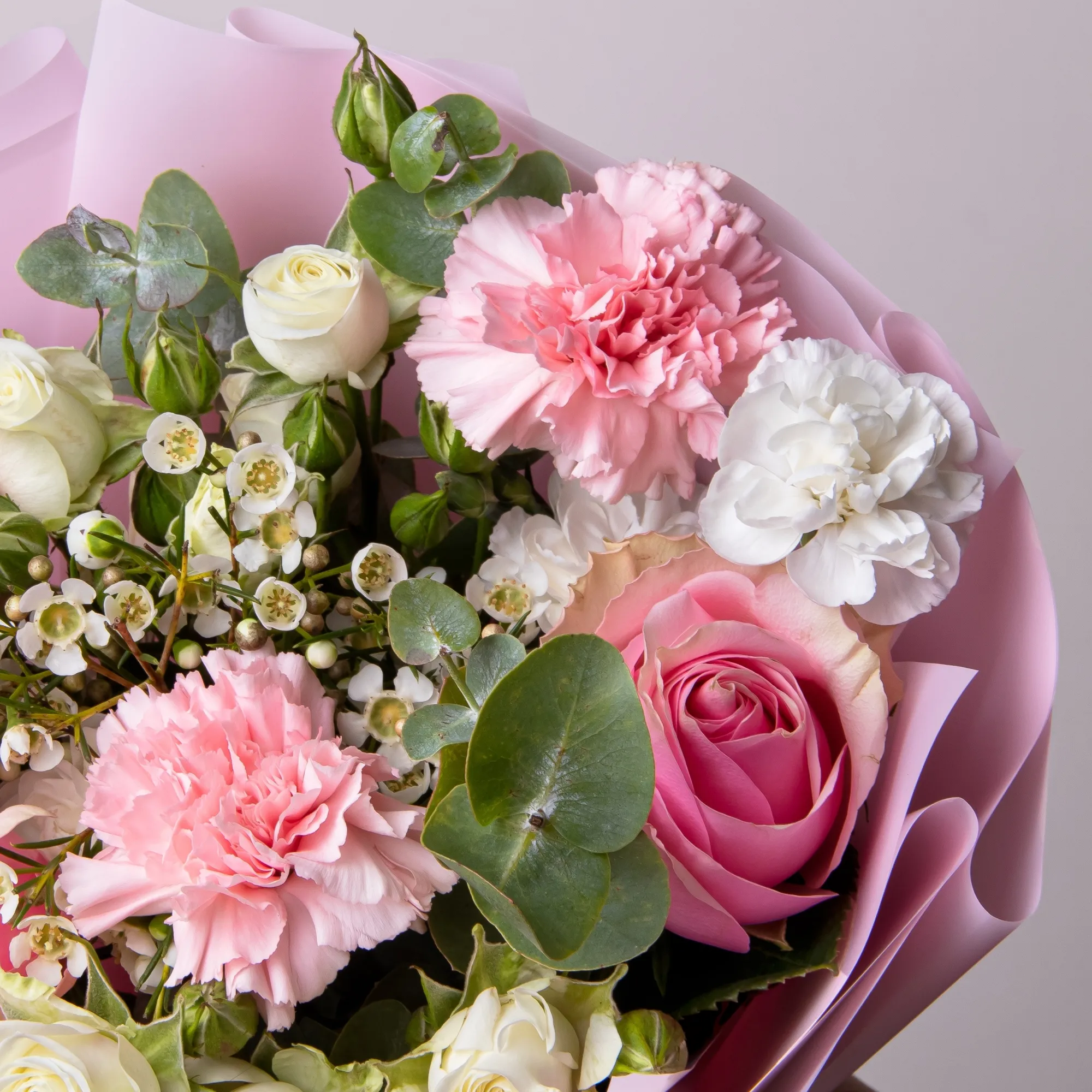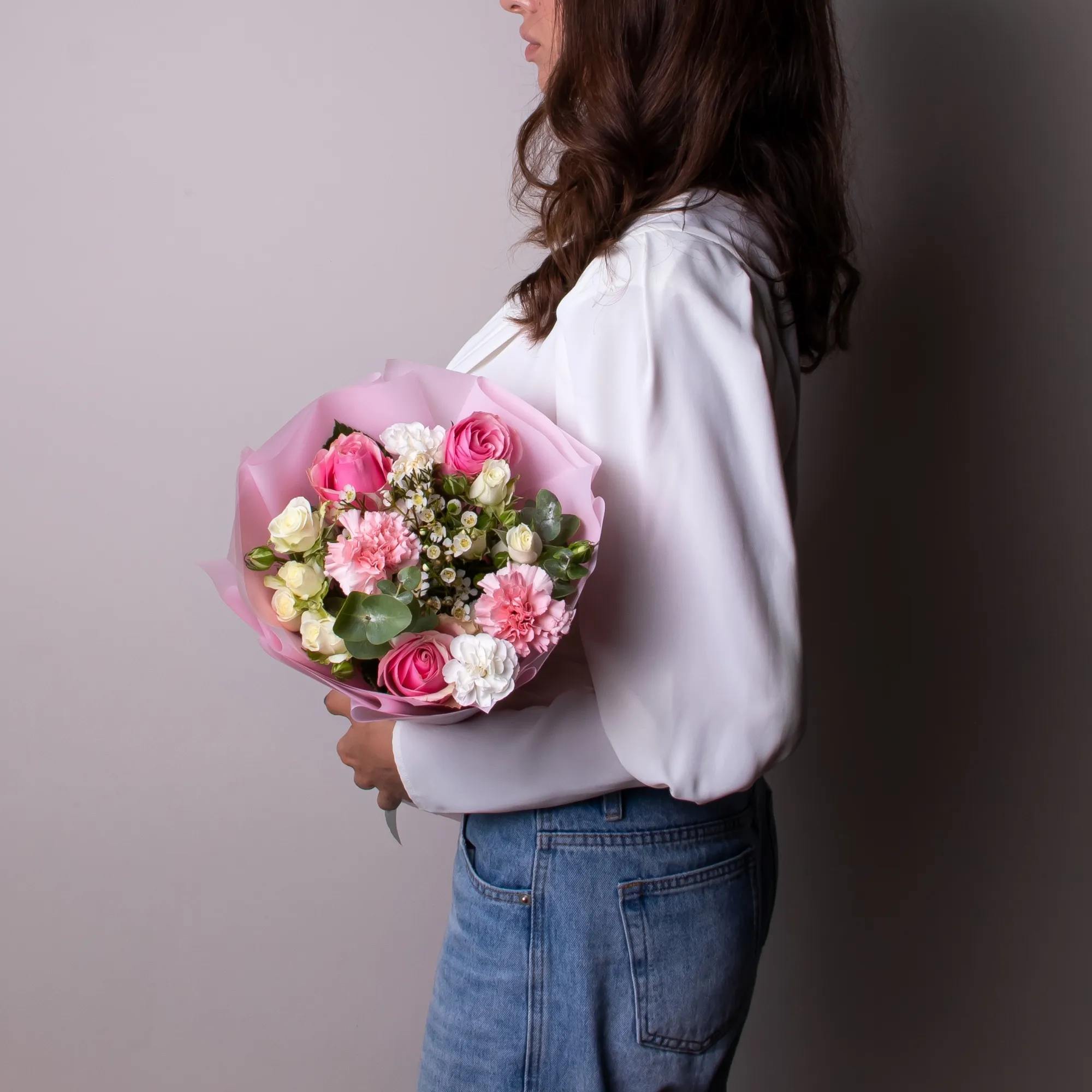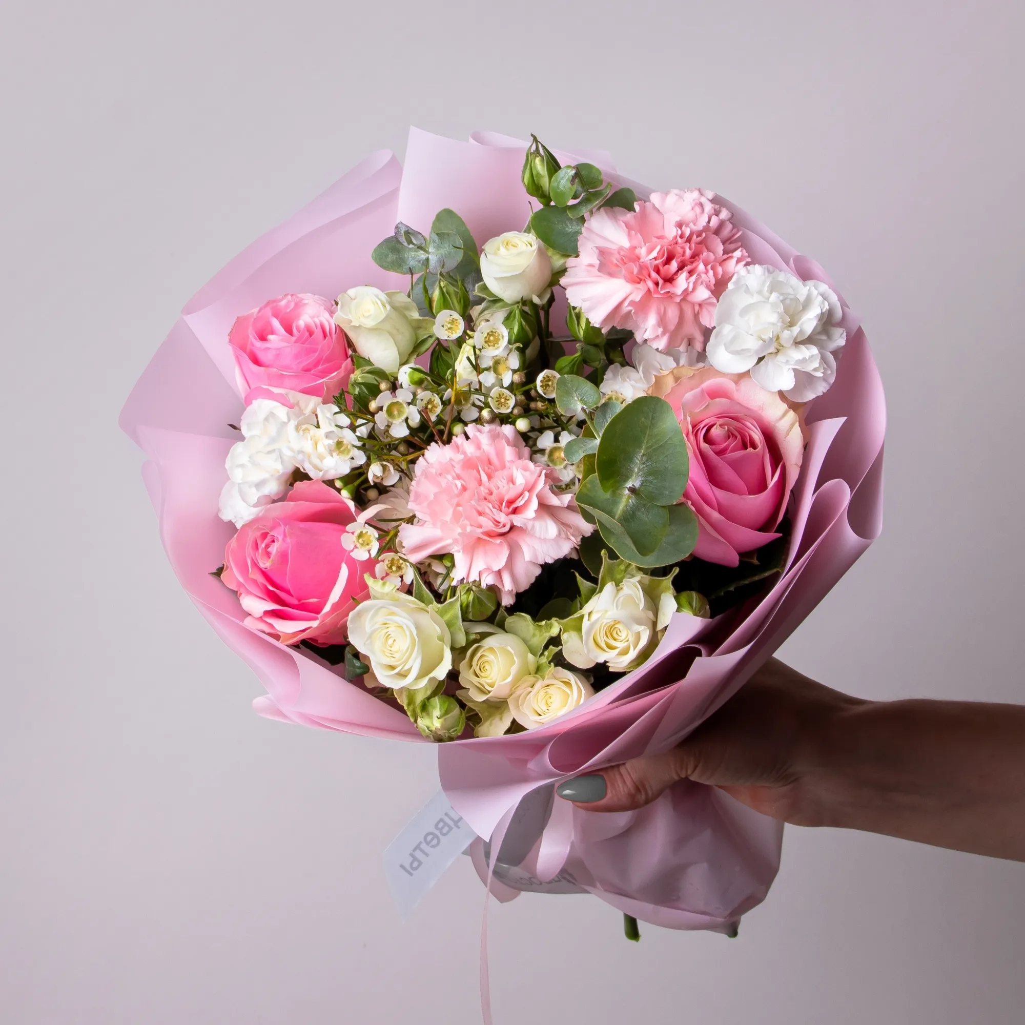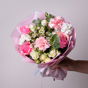 В составе букета "Безмятежность" в размере XS кустовая роза "Сноу Флейк", розовая роза сорта "Селеб", розовая гвоздика, белый хамелациум. А также листья фисташки и эвкалипта. Небольшой букетик-комплимент поможет признаться в нежных чувствах.