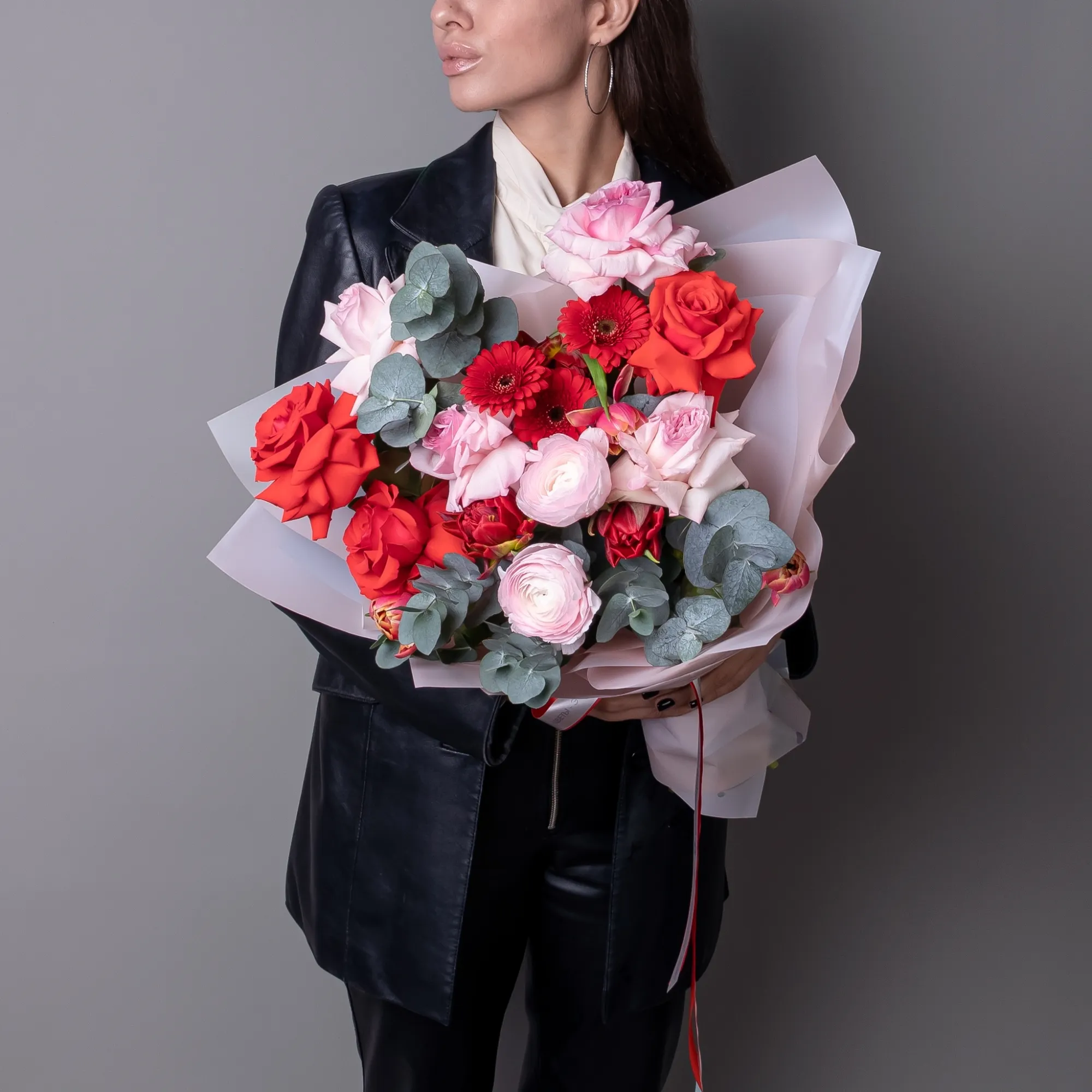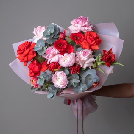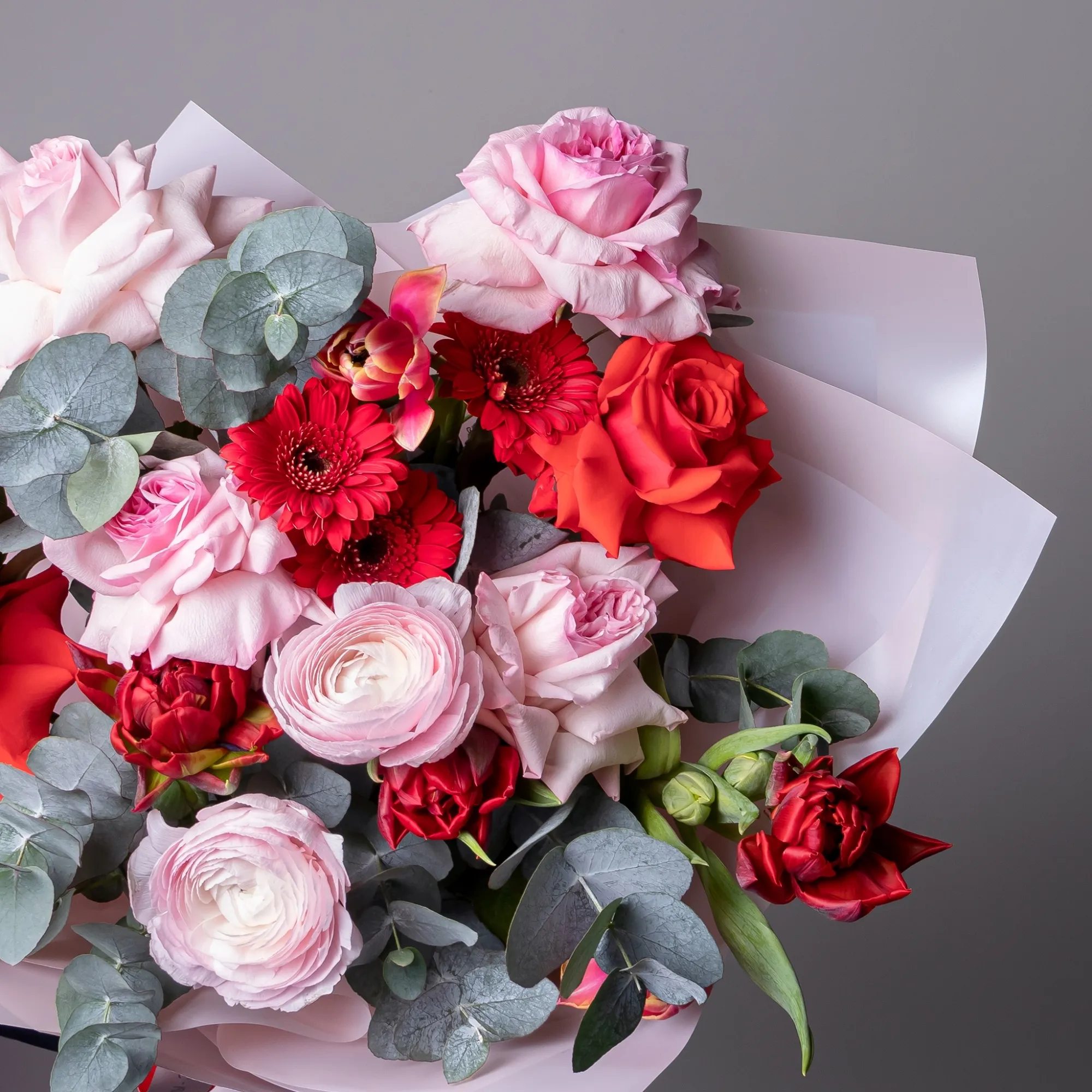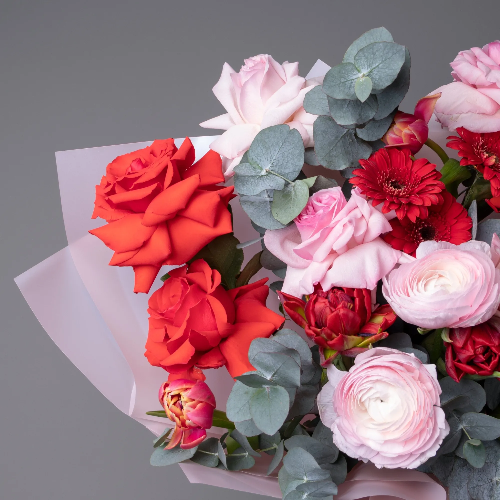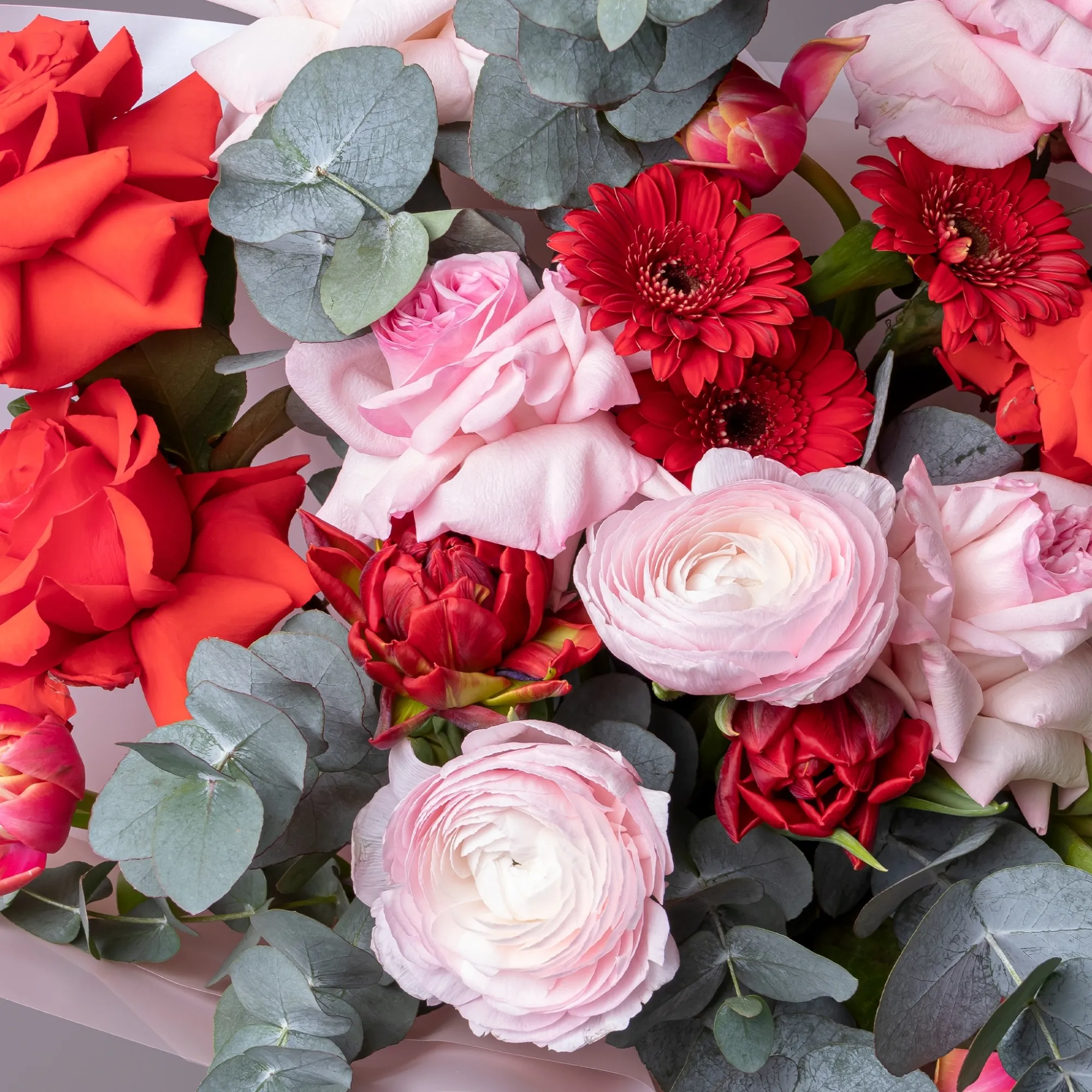 Роза-3, Тюльпан-6, Гермини-3, Ранункулюс-2, Роза пионовидная-3, Листья эвкалипта-3
