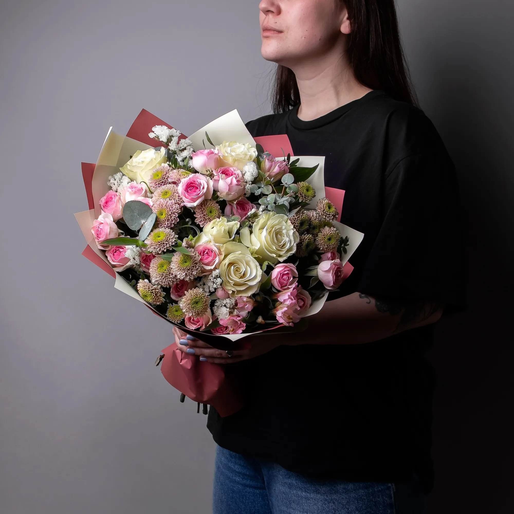 К сожалению, мы не можем гарантировать точную копию букета. Наши цветы могут отличаться от указанных на фотографии, ведь они приезжают к нам из разных уголков мира.