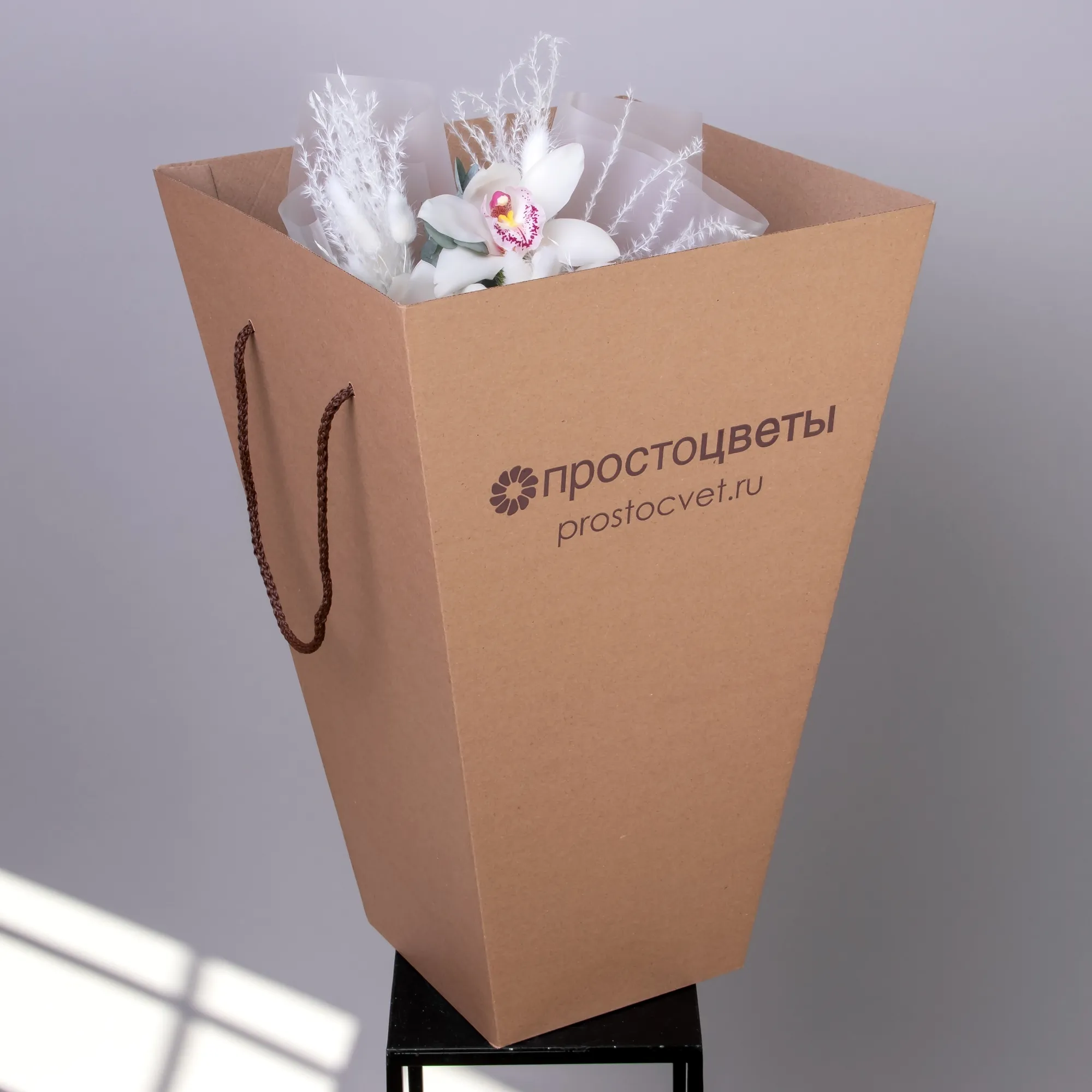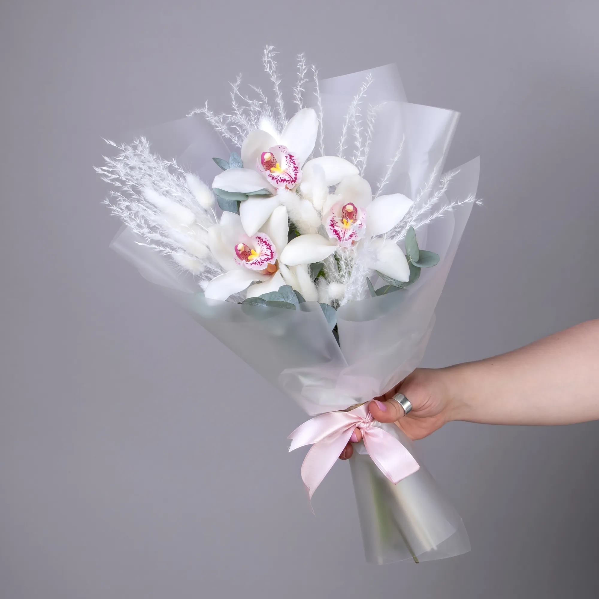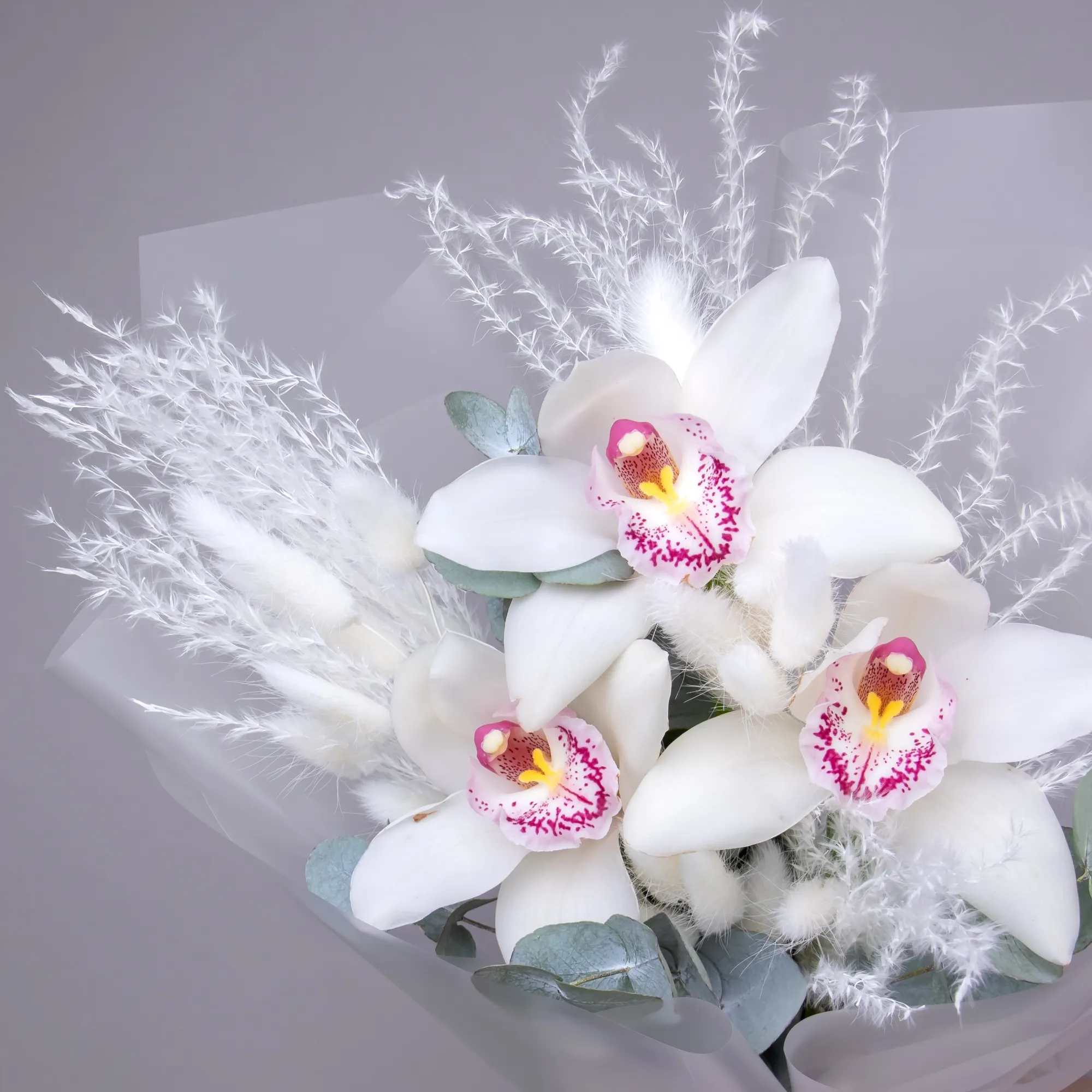 Небольшой букет из белого цимбидиума, эулалии и лагуруса. Дополнен прозрачной пленкой.
