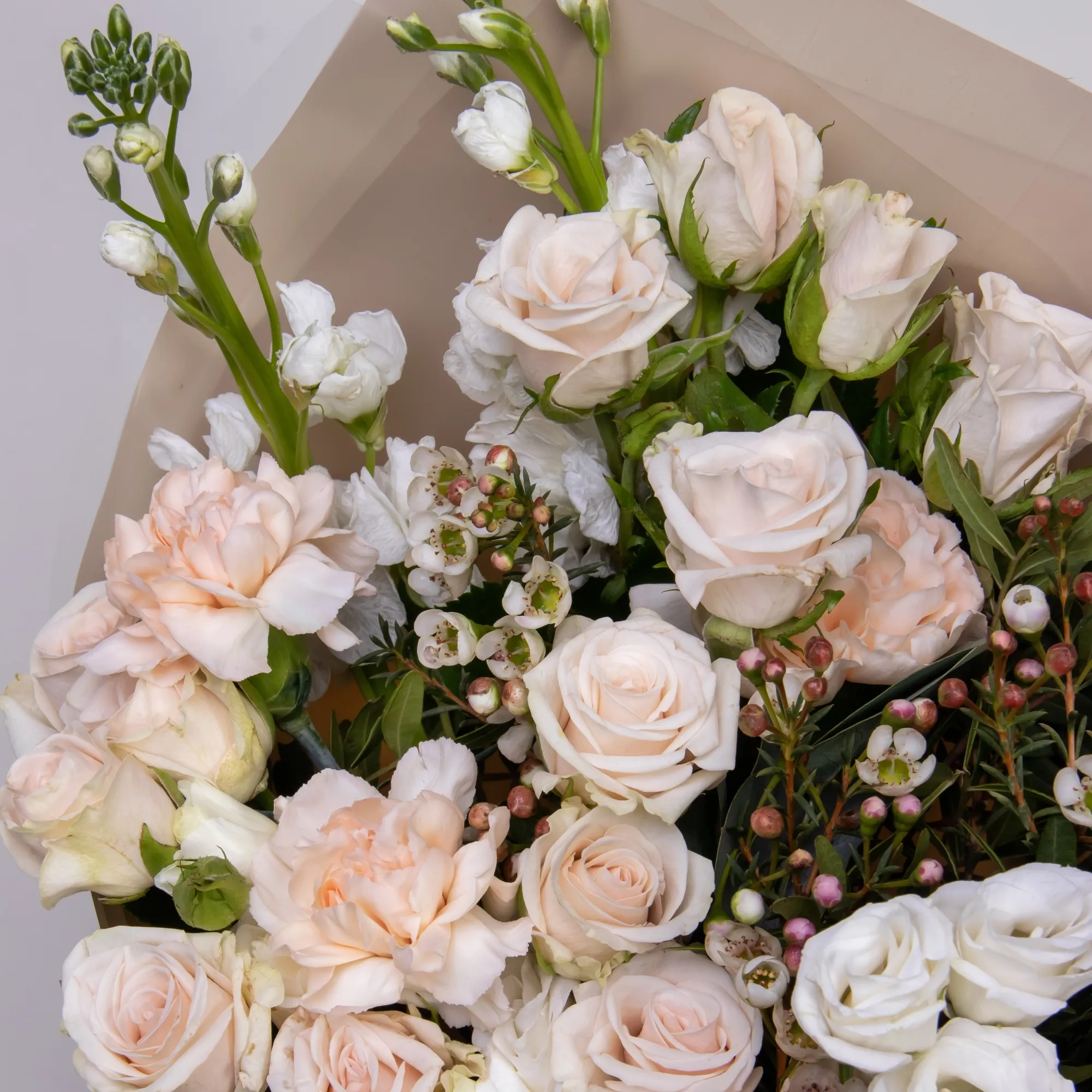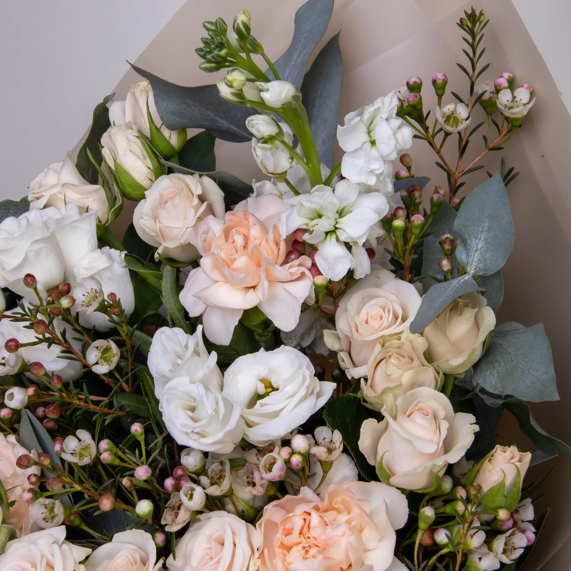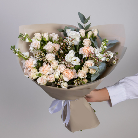 Нежный и утонченный букет в бежевых тонах. В составе кустовая роза, белый лизиантус, белая маттиола, диантус, хамелациум, а также листья фисташки и эвкалипта.