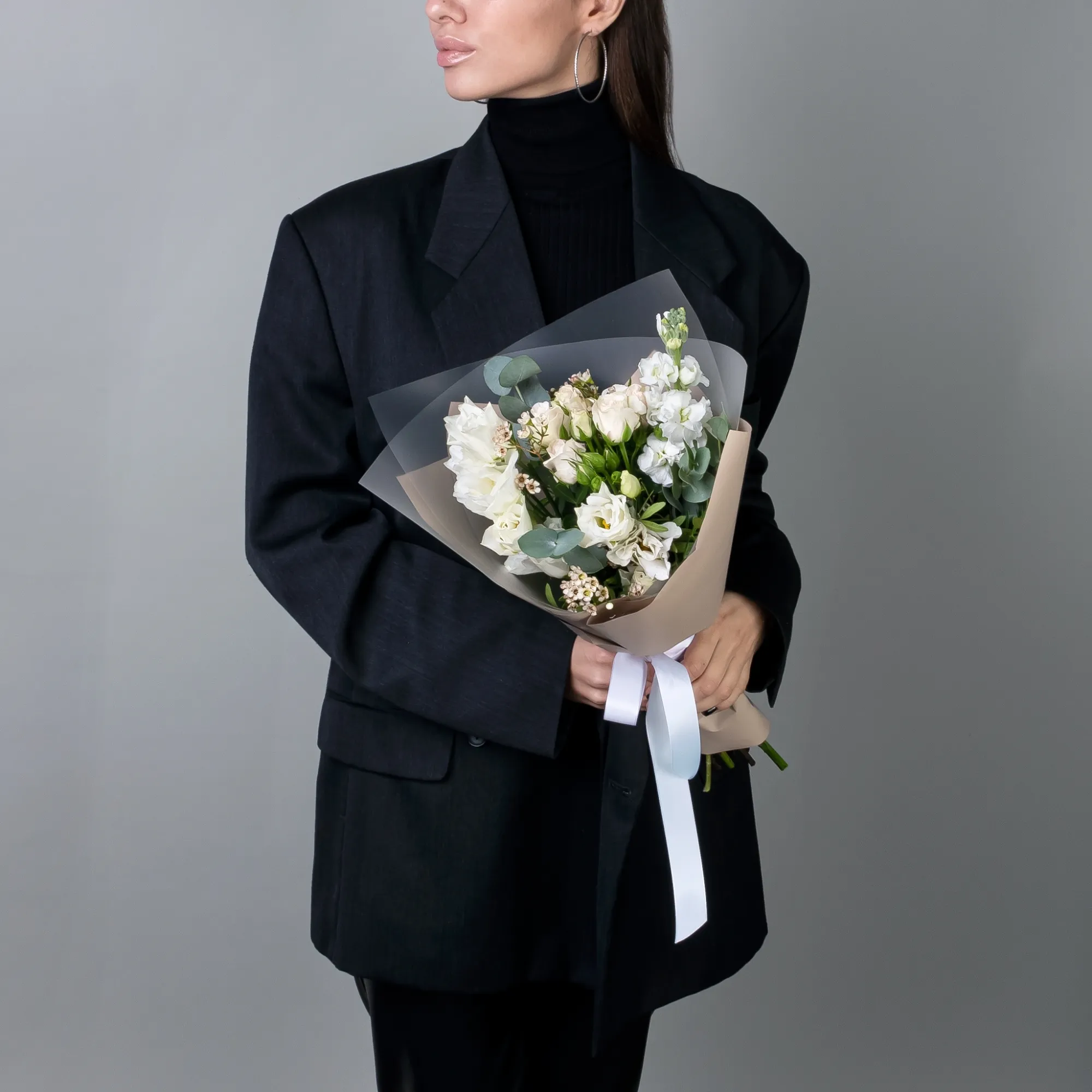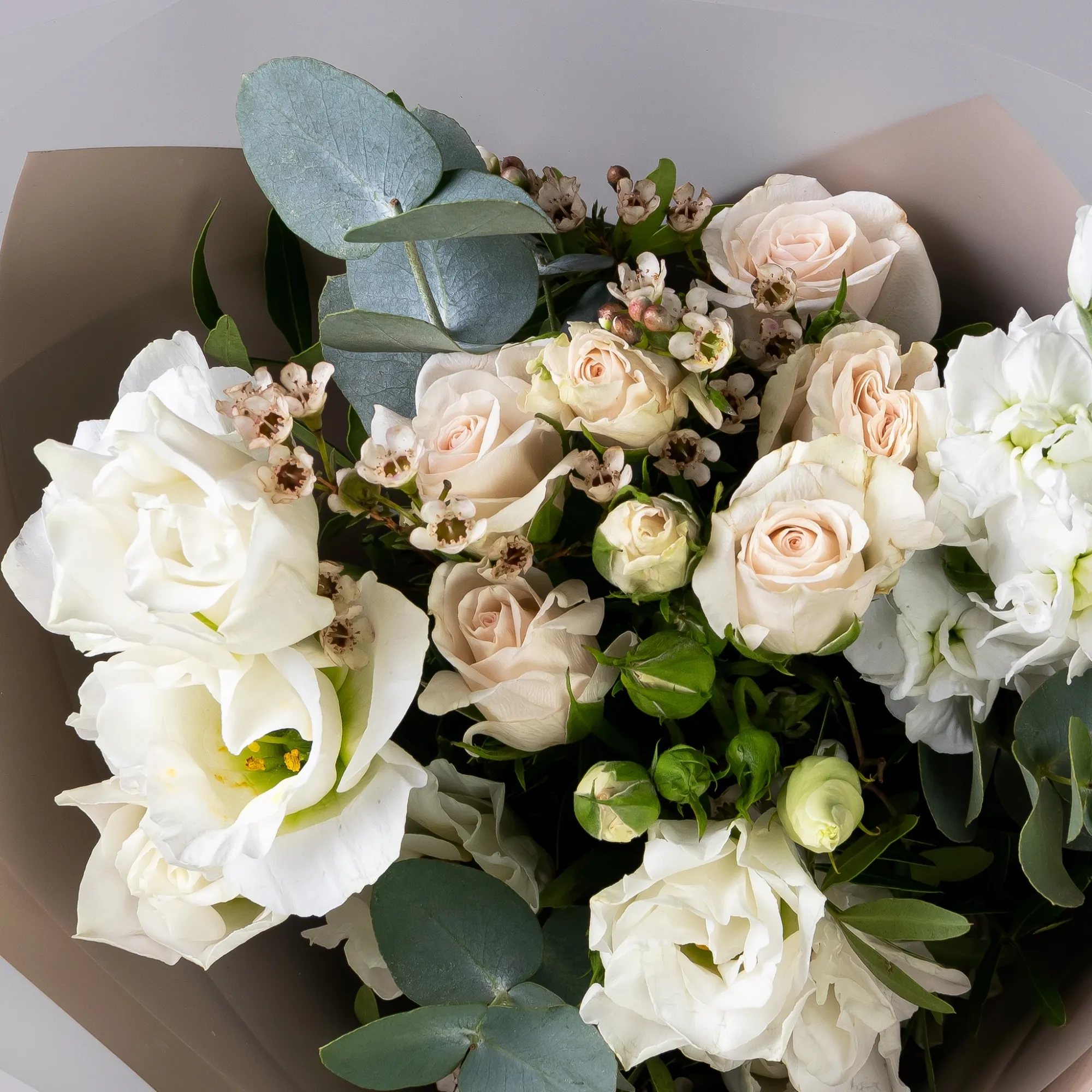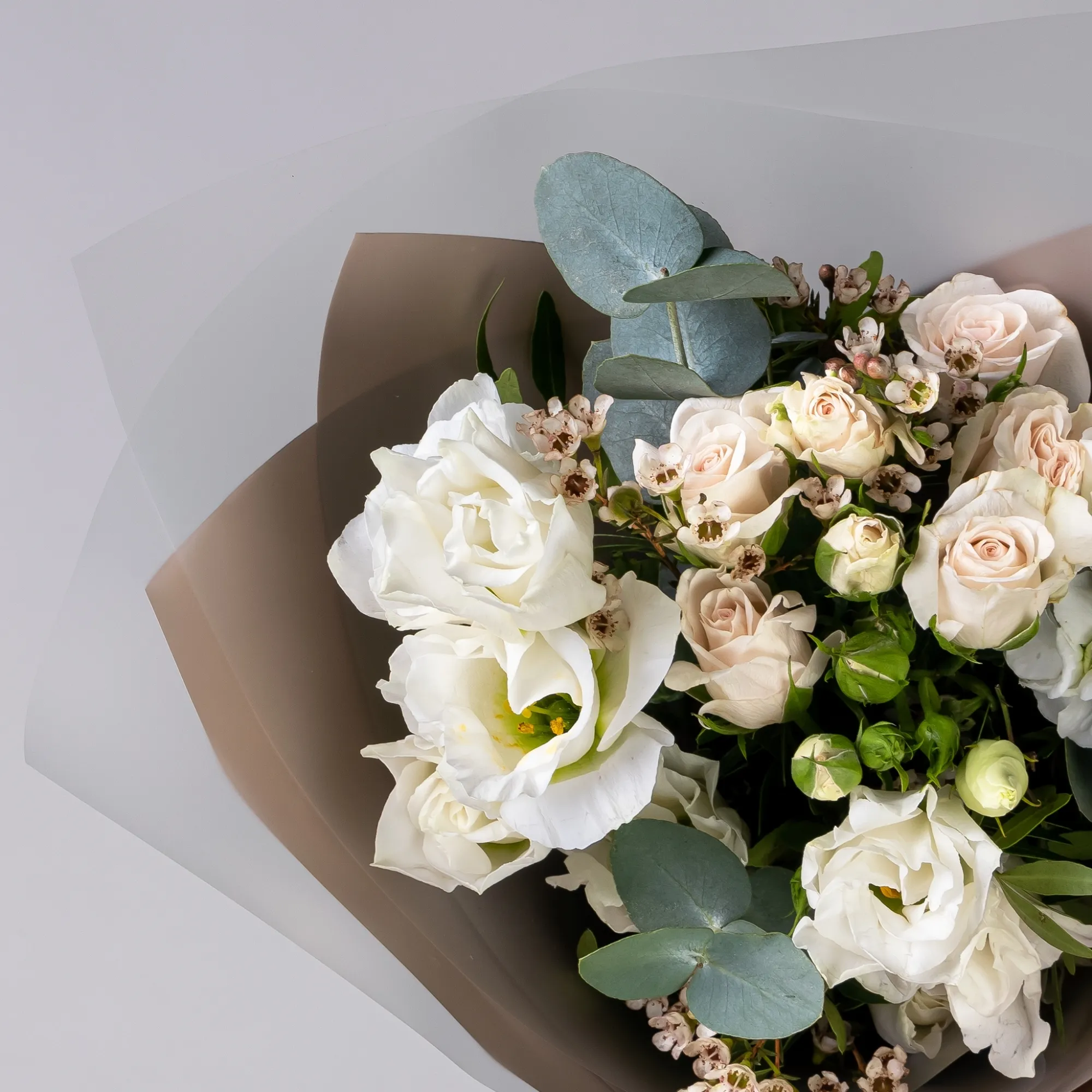 Нежный и утонченный букет в бежевых тонах. В составе кустовая роза, белый лизиантус, белая маттиола, хамелациум, а также листья фисташки и эвкалипта.