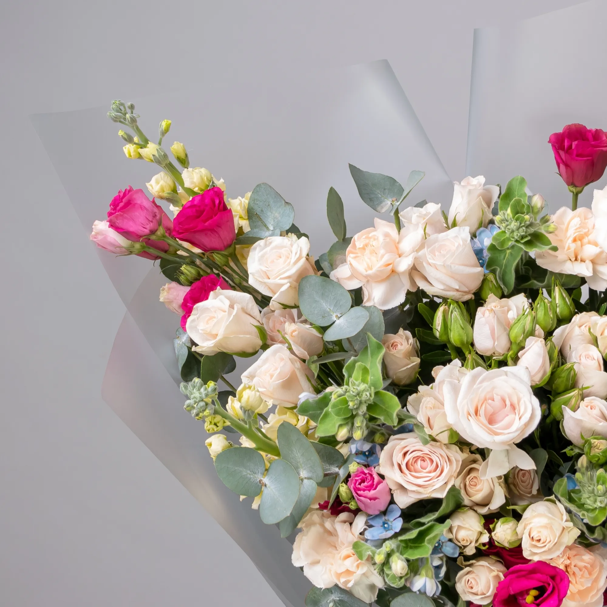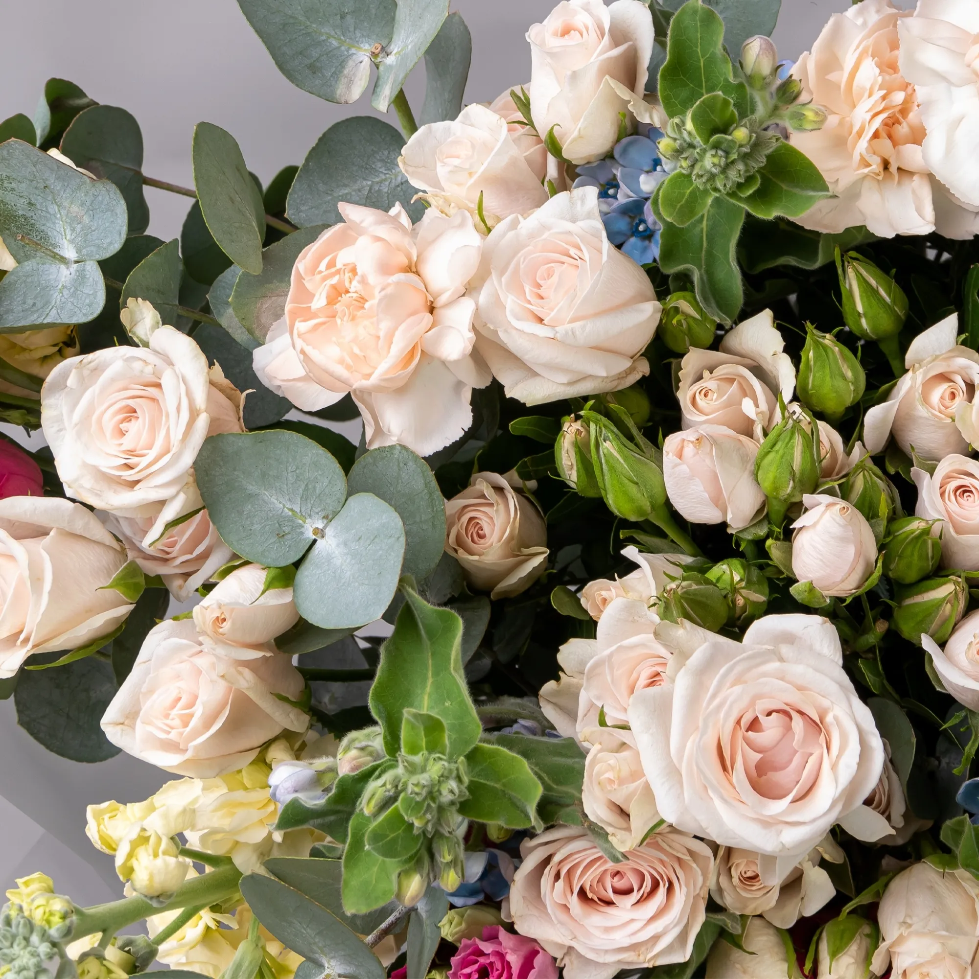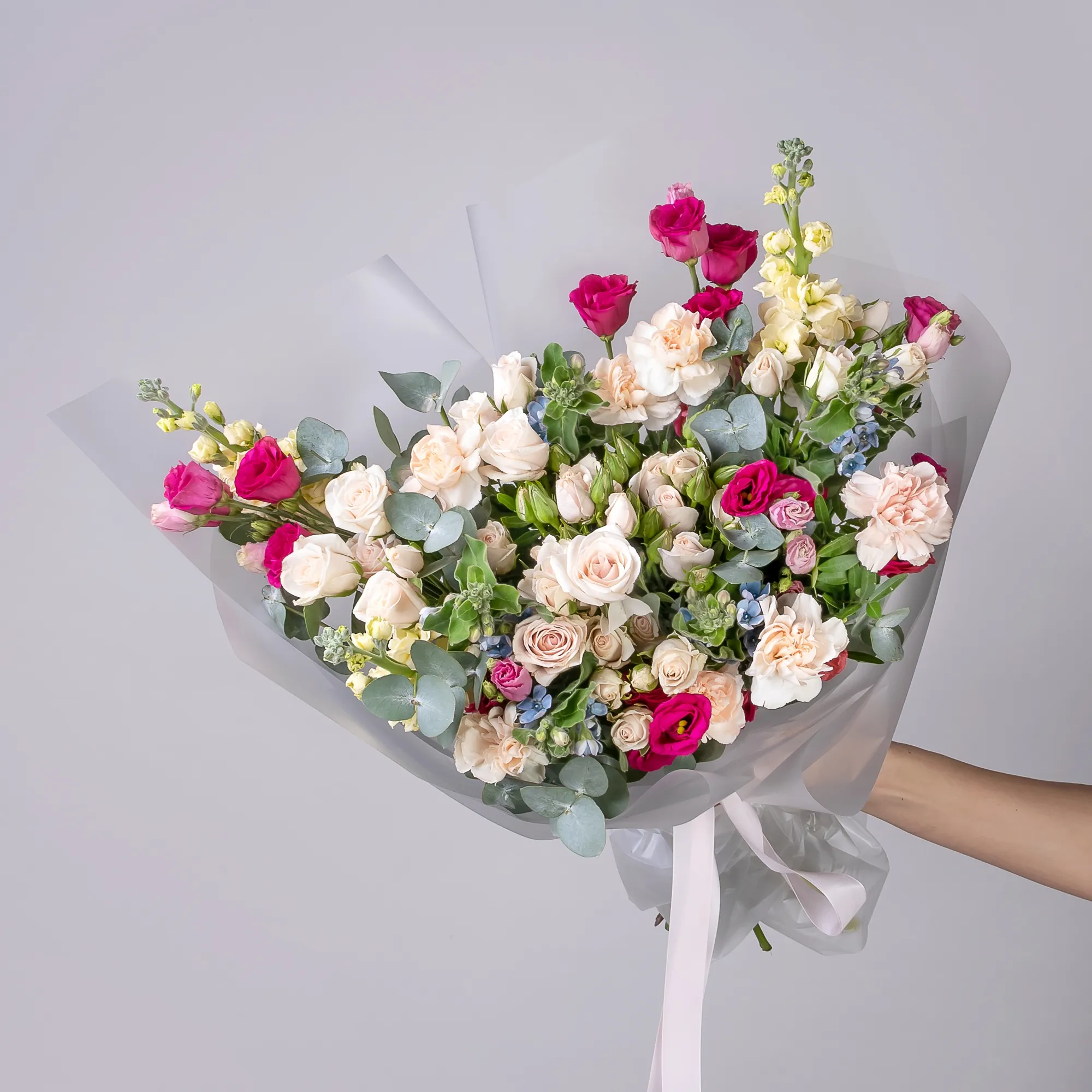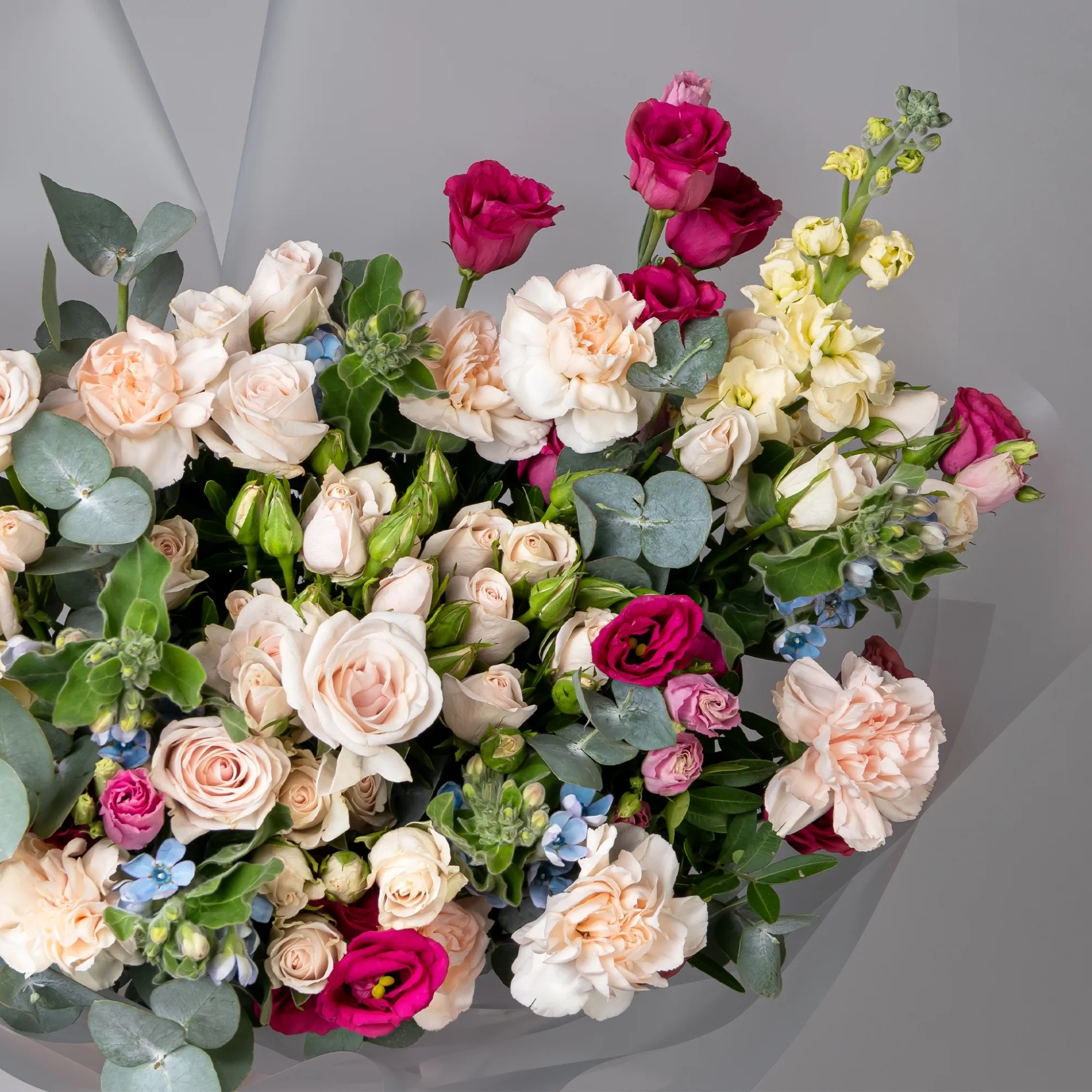 Букет из кустовой розы, насыщенного розового лизиантуса, кремовой маттиолы, диантуса, оксипеталума, а также листьев эвкалипта и фисташки.