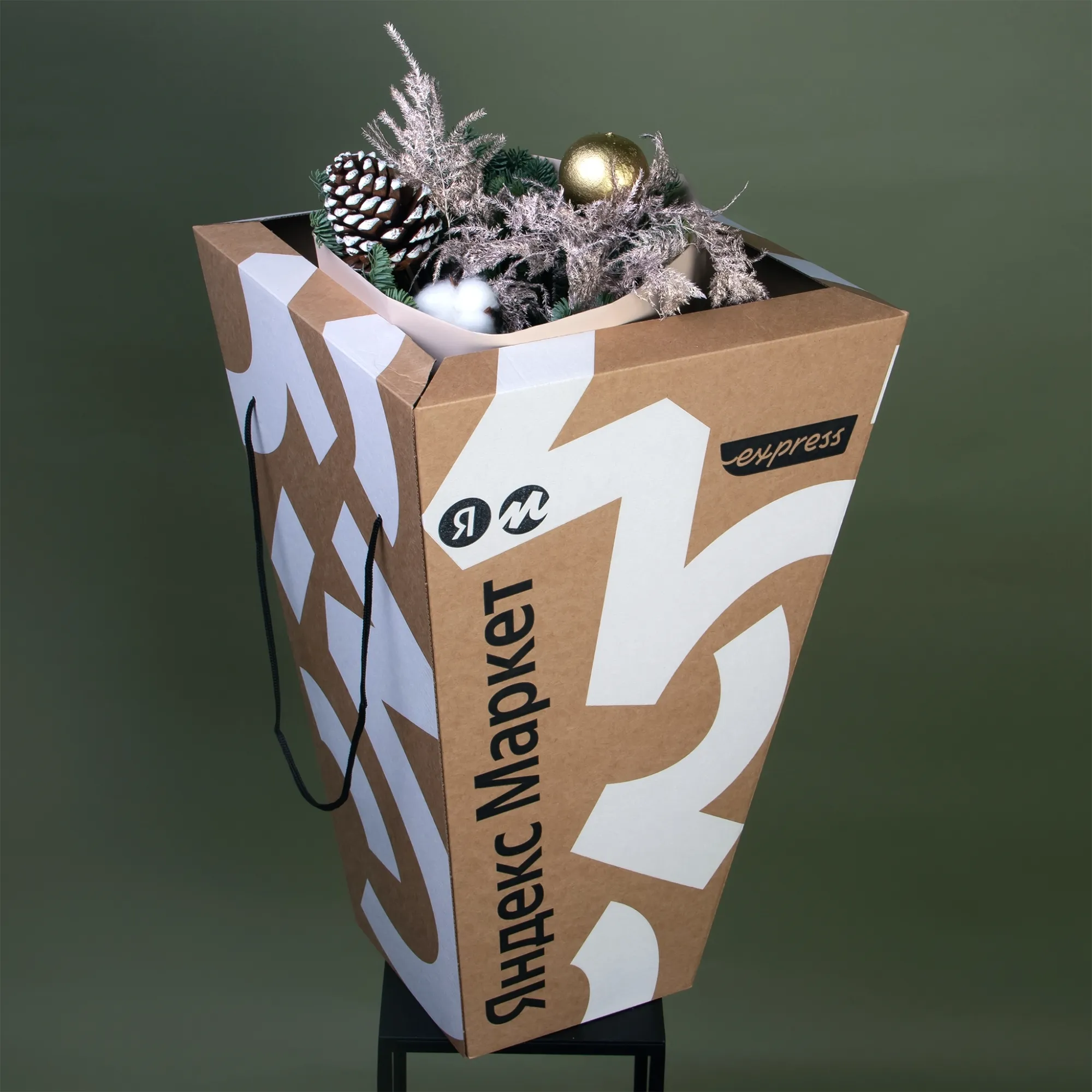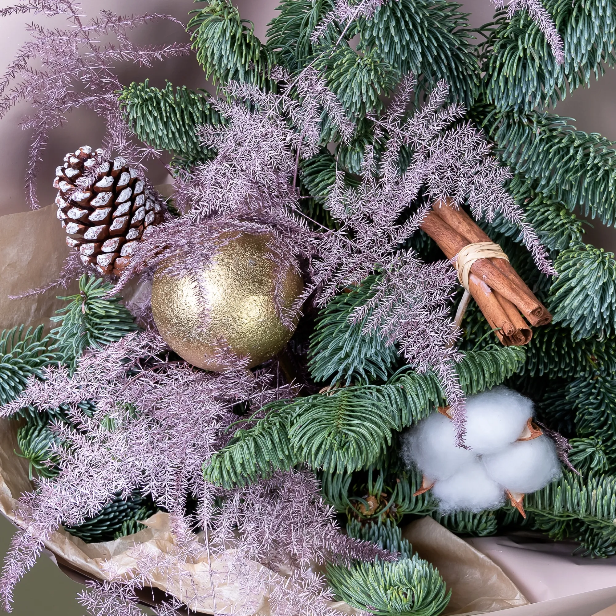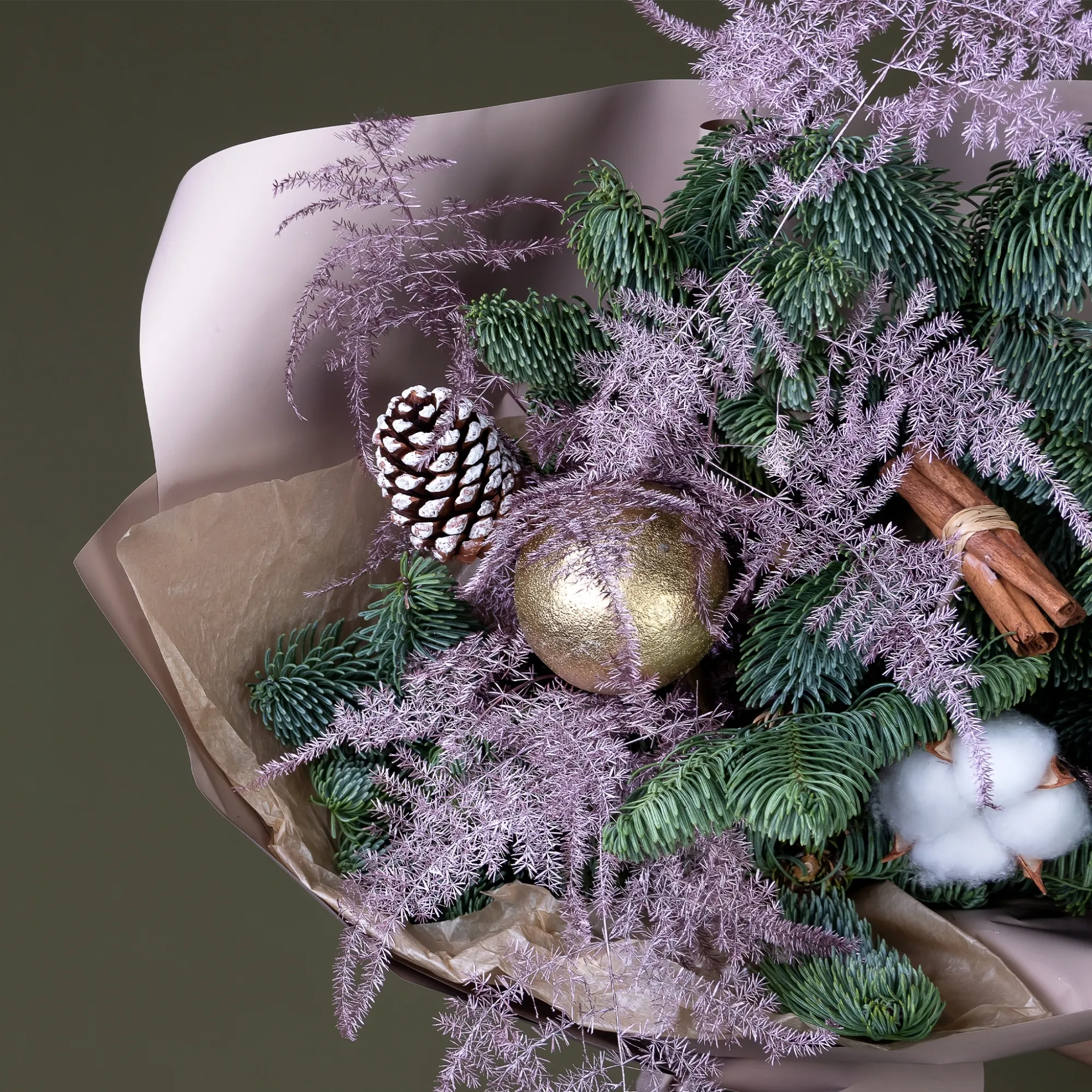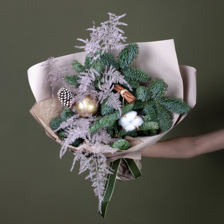 Новогодний праздничный букет из стойких цветочных ингредиентов. В составе зеленый нобилис (пихта), белый хлопок, листья аспарагуса, игрушки «новогодний шар» и «шишка».