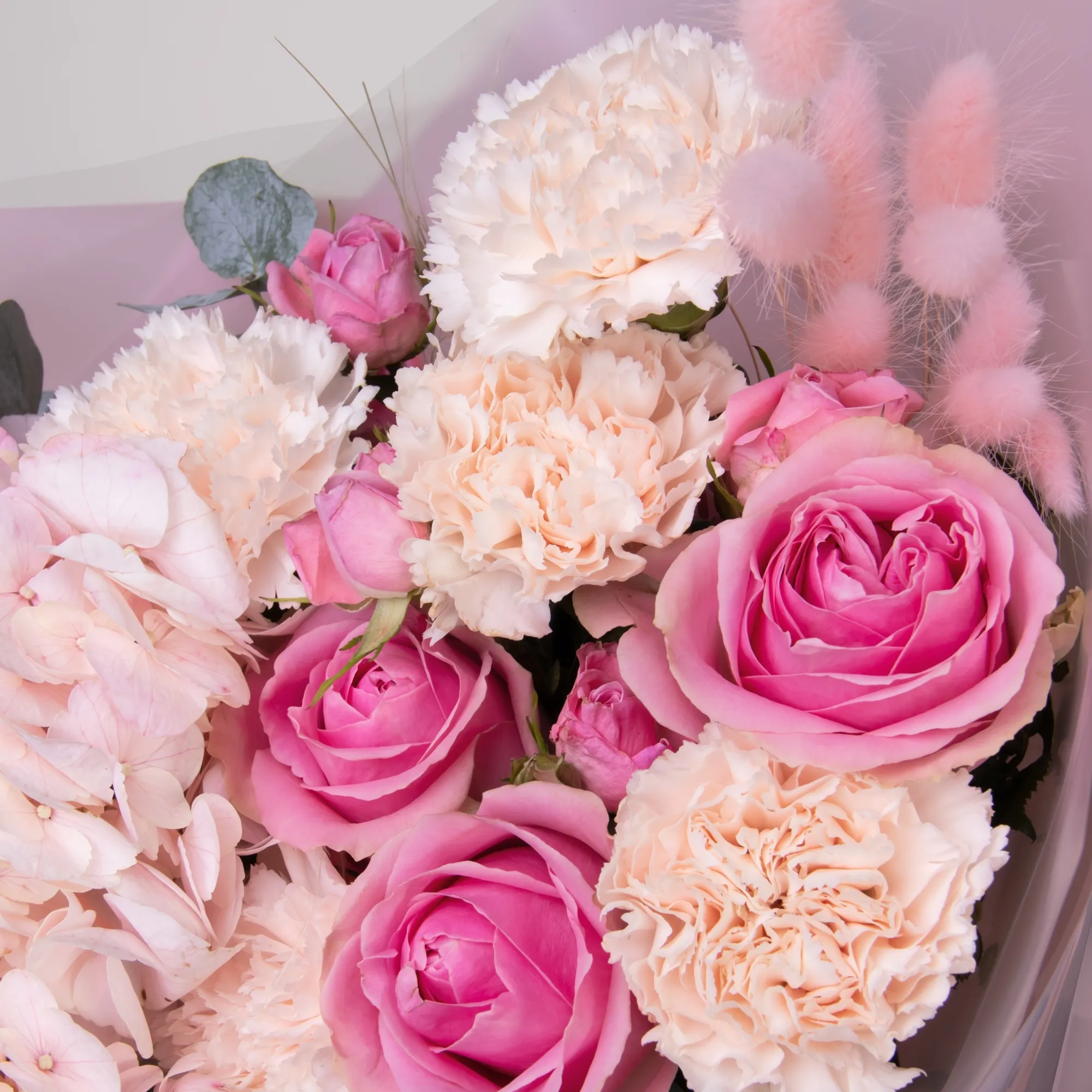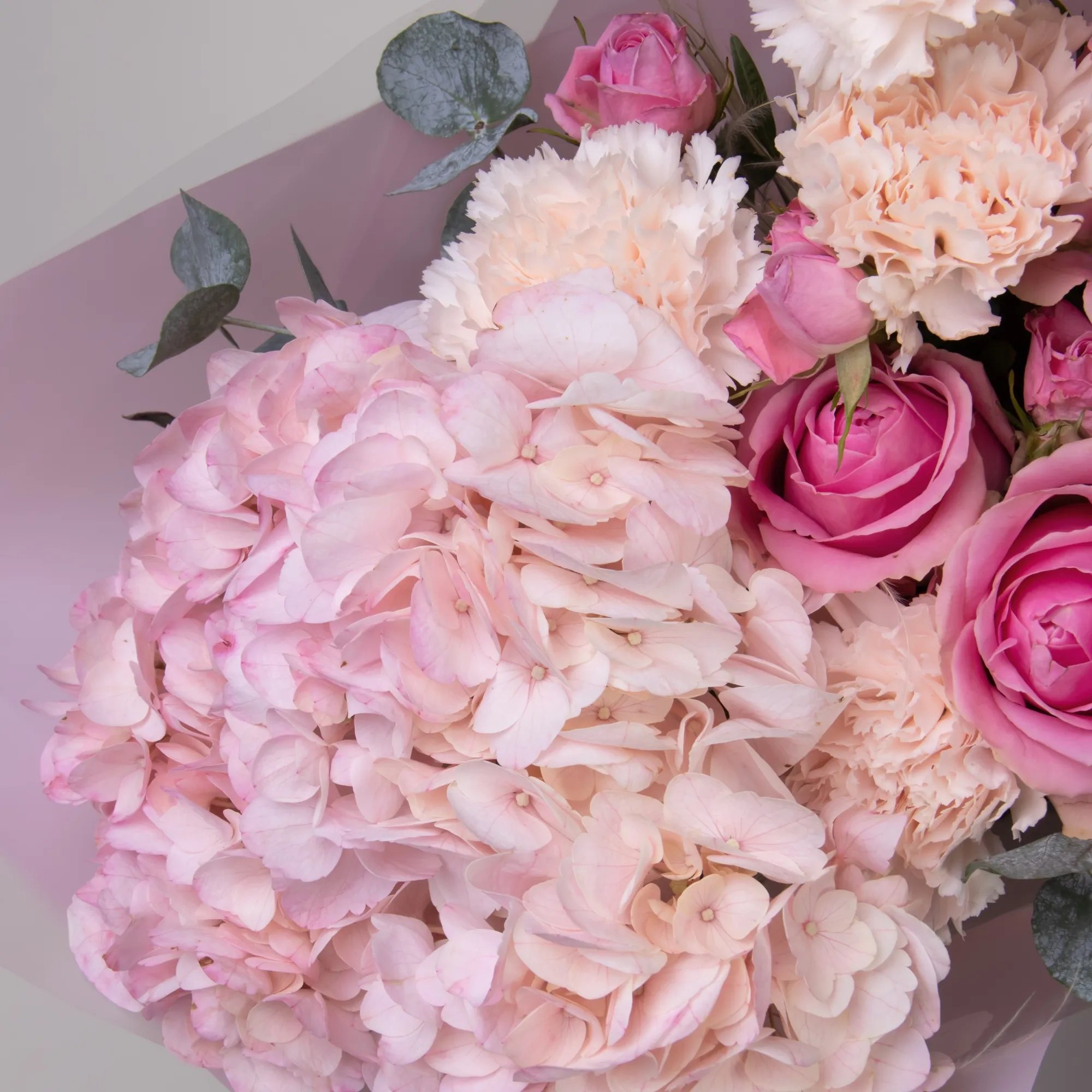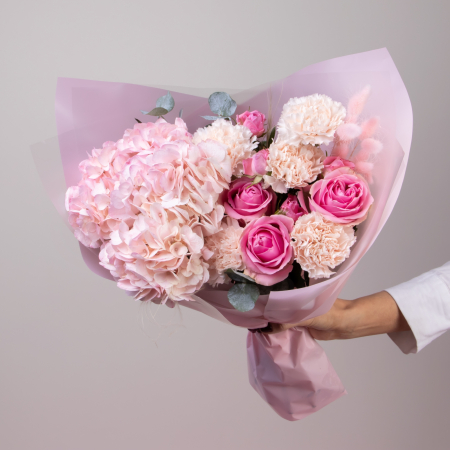 Букет в нежно-розовой гамме с яркими акцентами. В составе розовая гортензия, роза сорта «Вэм», кустовая роза, диантус, розовый лагурус, а также листья фисташки и эвкалипта.