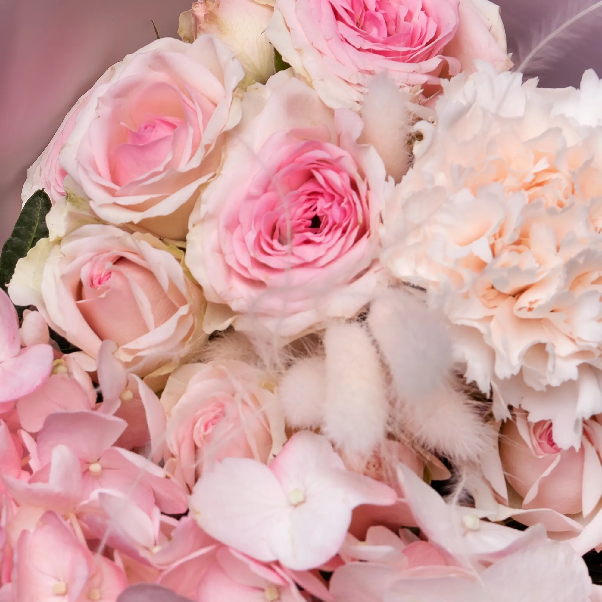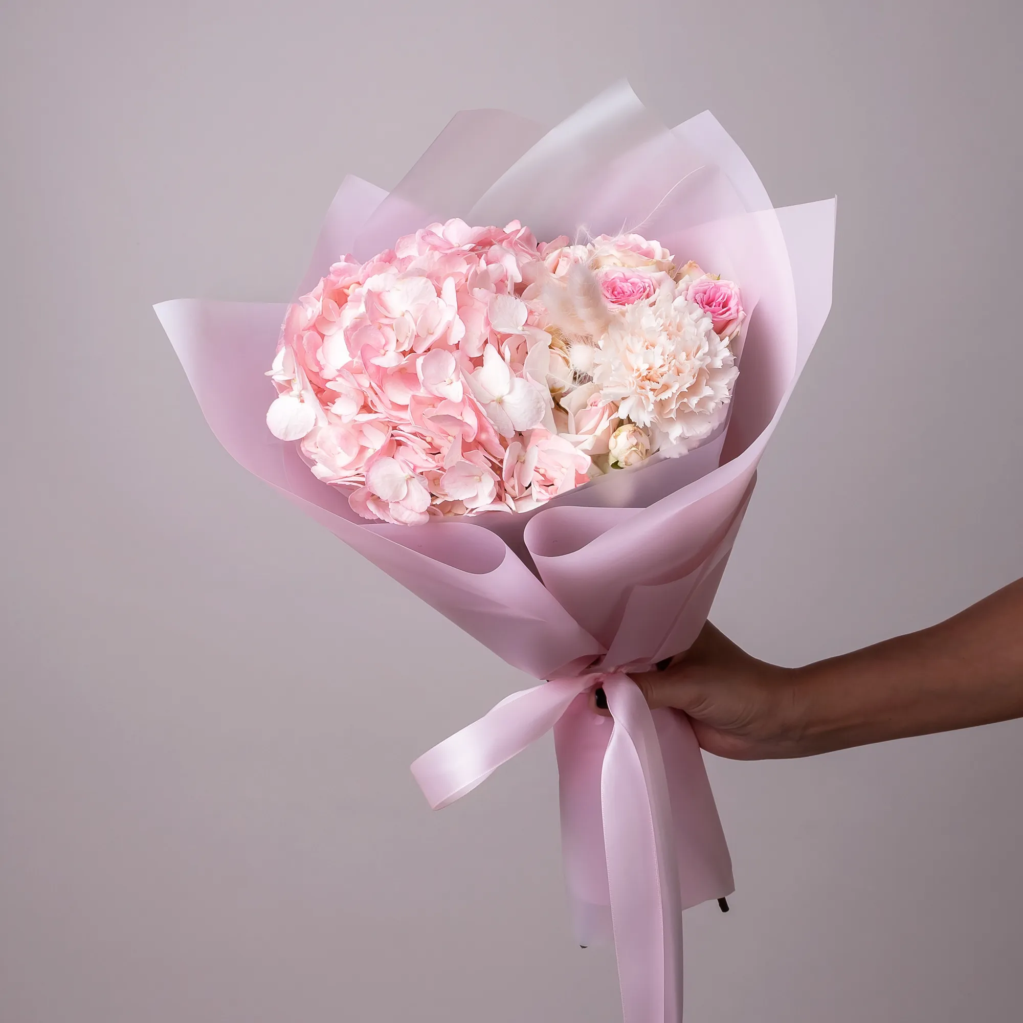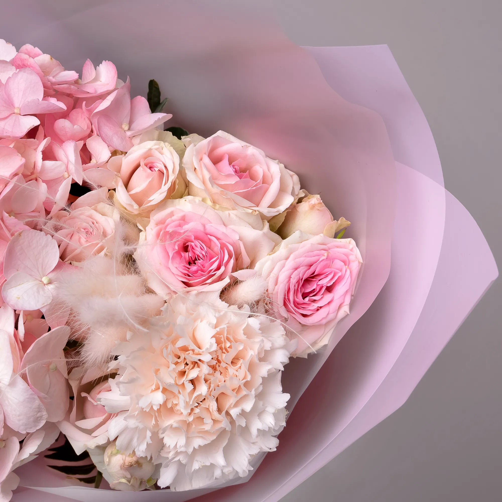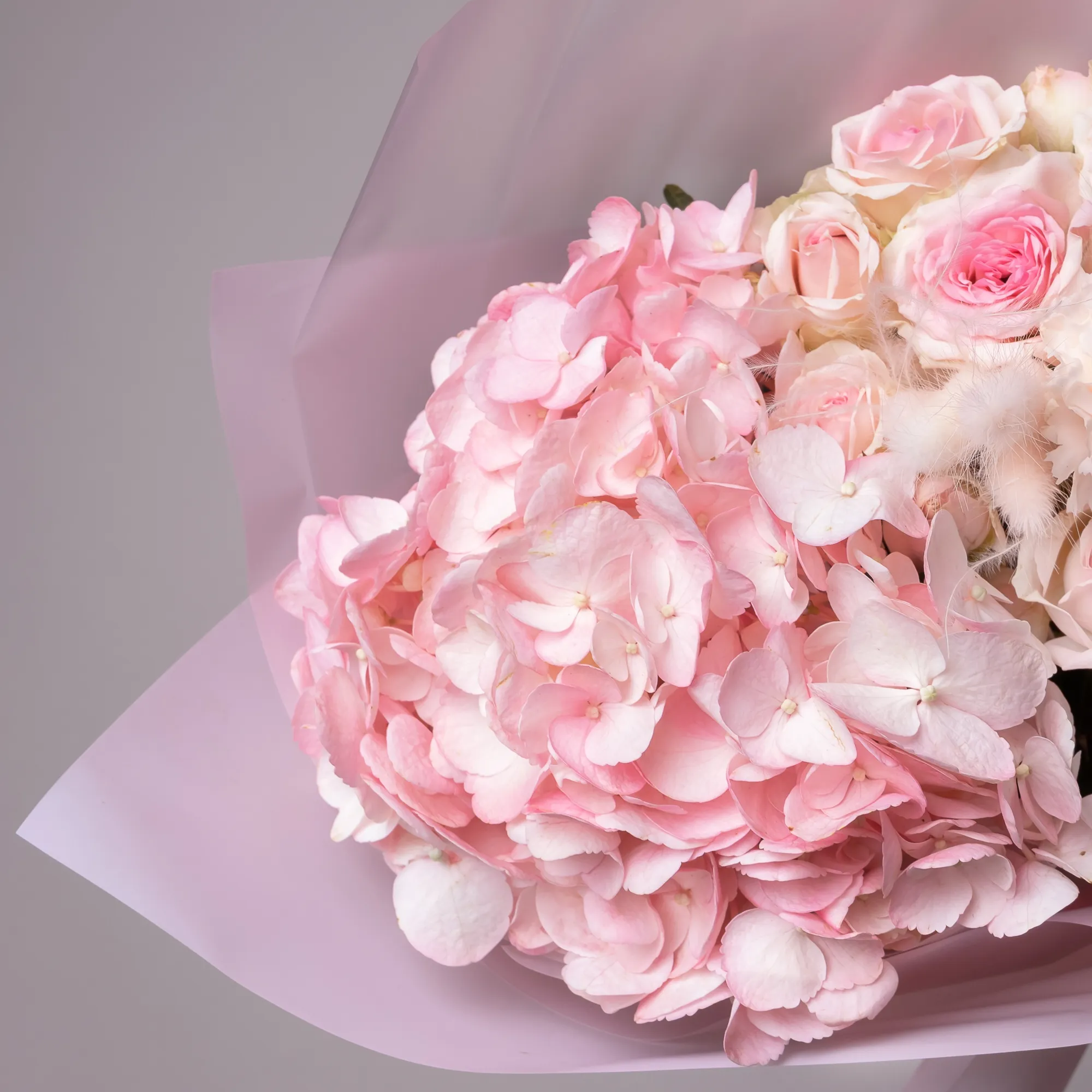 Букет состоит из 8 различных видов цветов, включая розовую гортензию, розу сорта «Вэм», кустовую розу, диантус, розовый лагурус, листья эвкалипта и фисташки.