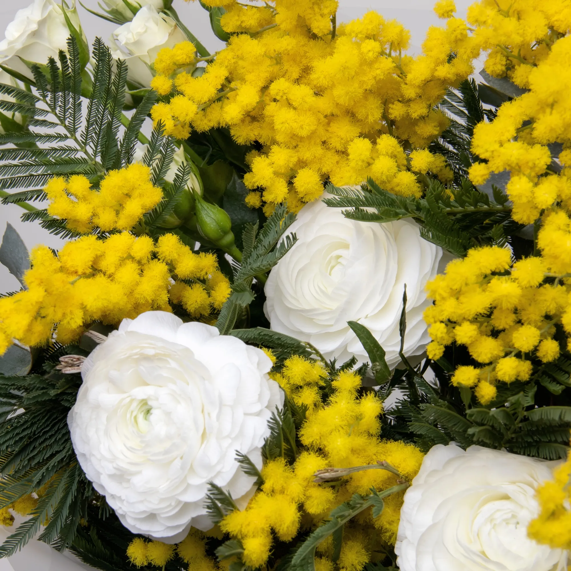 Мимоза, Роза, Ранункулюс, Листья эвкалипта