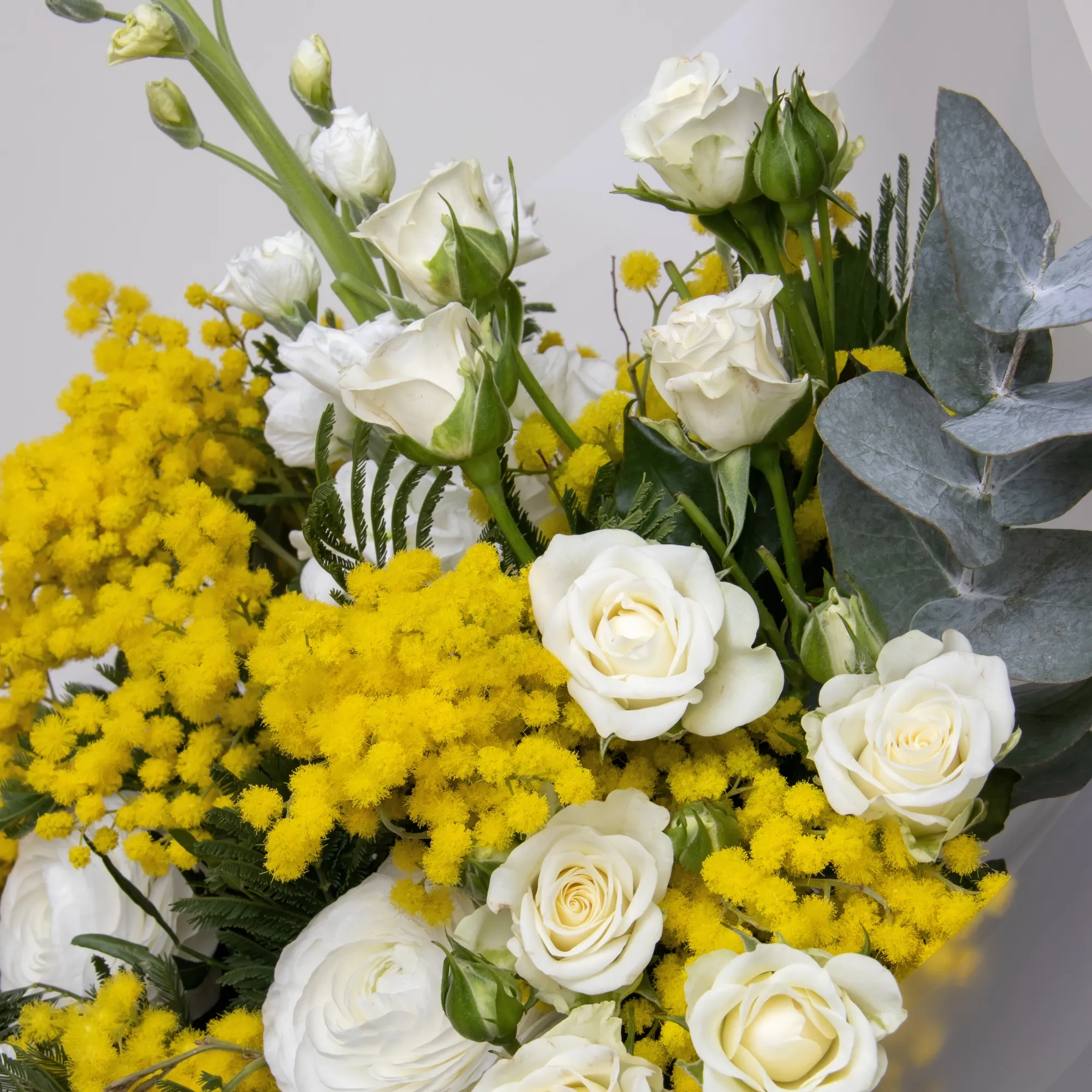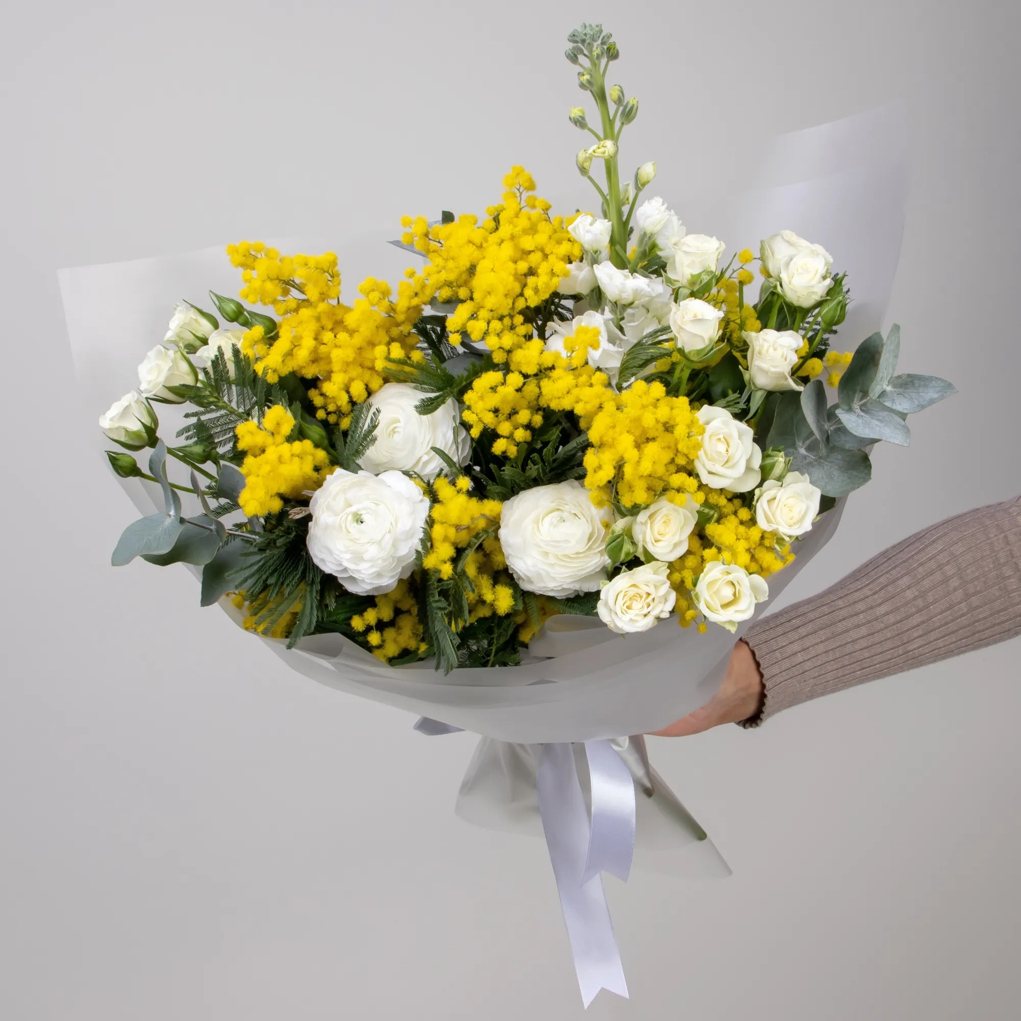 Букет "Прага" состоит из пушистой желтой мимозы, белого ранункулуса, белой кустовой розы, ароматной белой маттиолы и листьев эвкалипта.