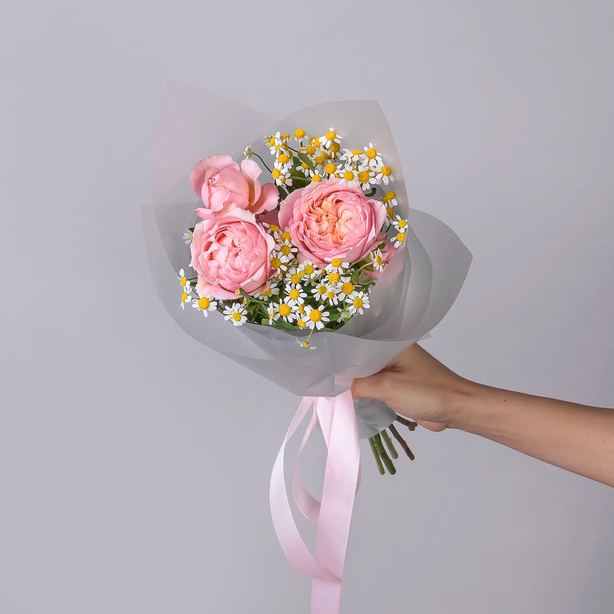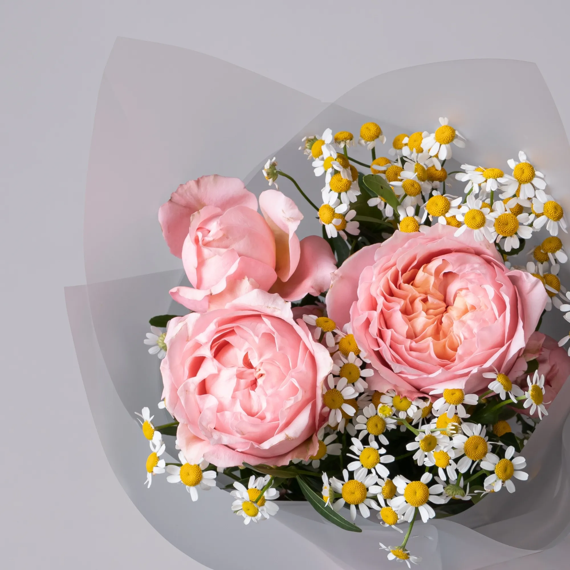 Нежный дуобукет из утонченной кустовой розы "Джульетта" и матрикарии. Дополнен прозрачной пленкой.