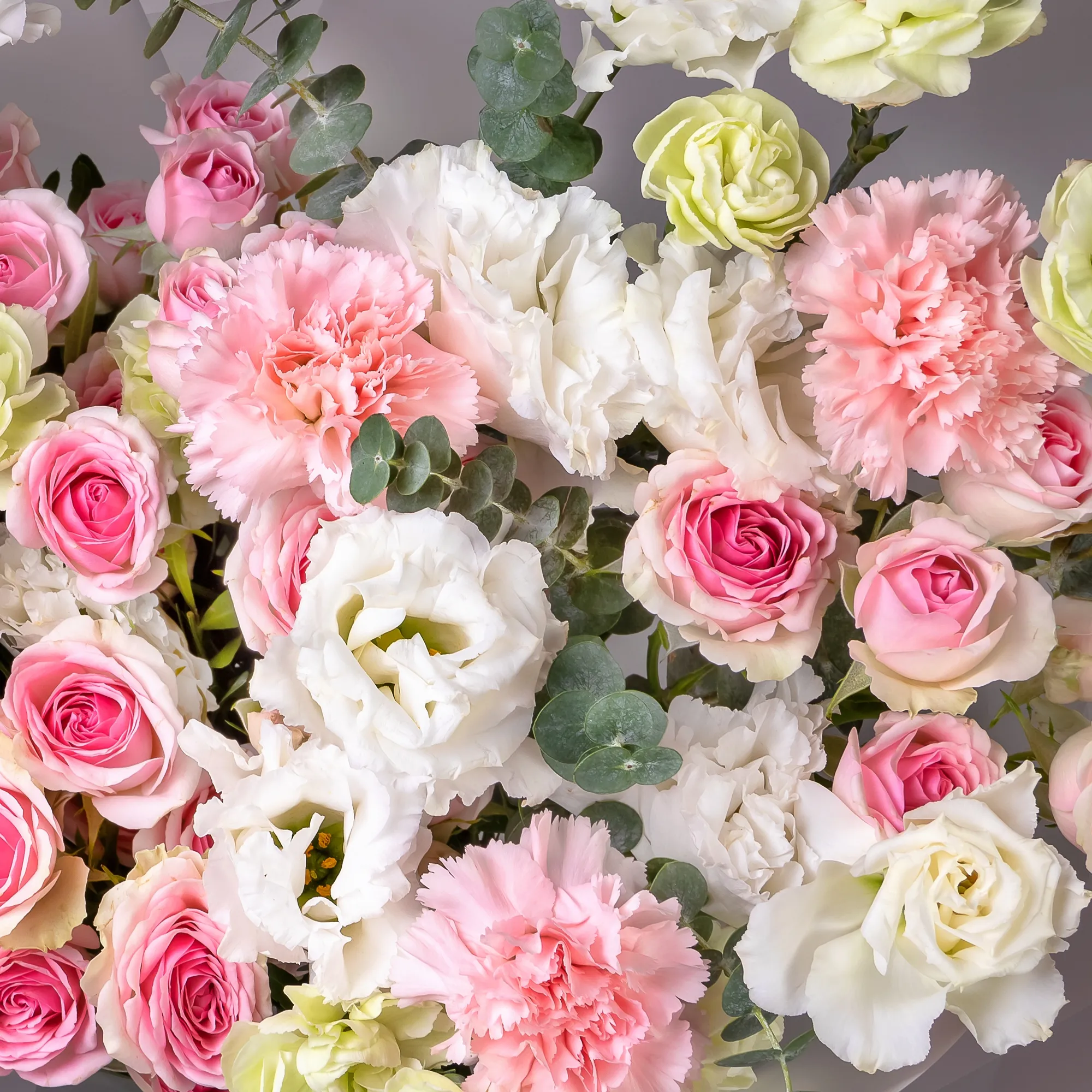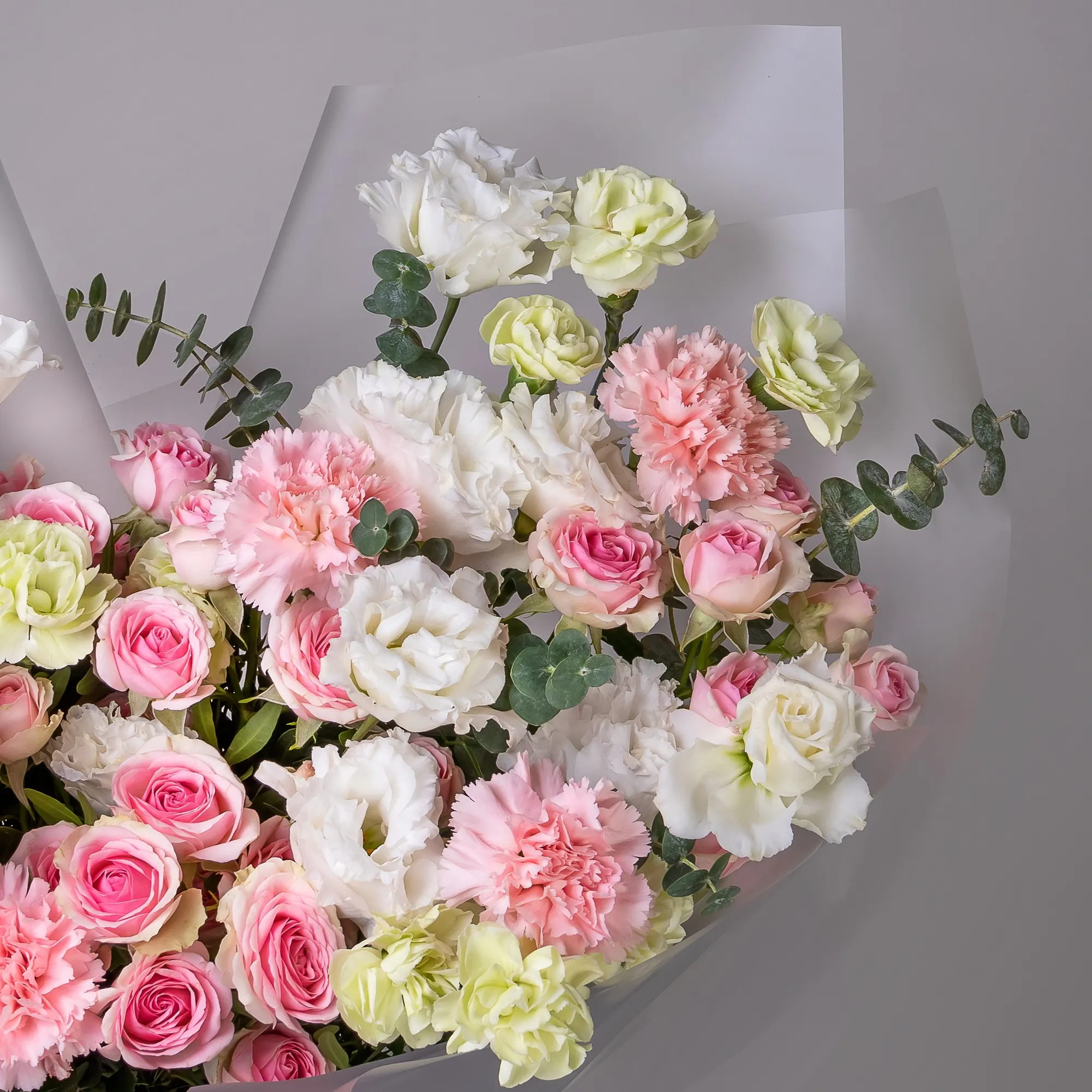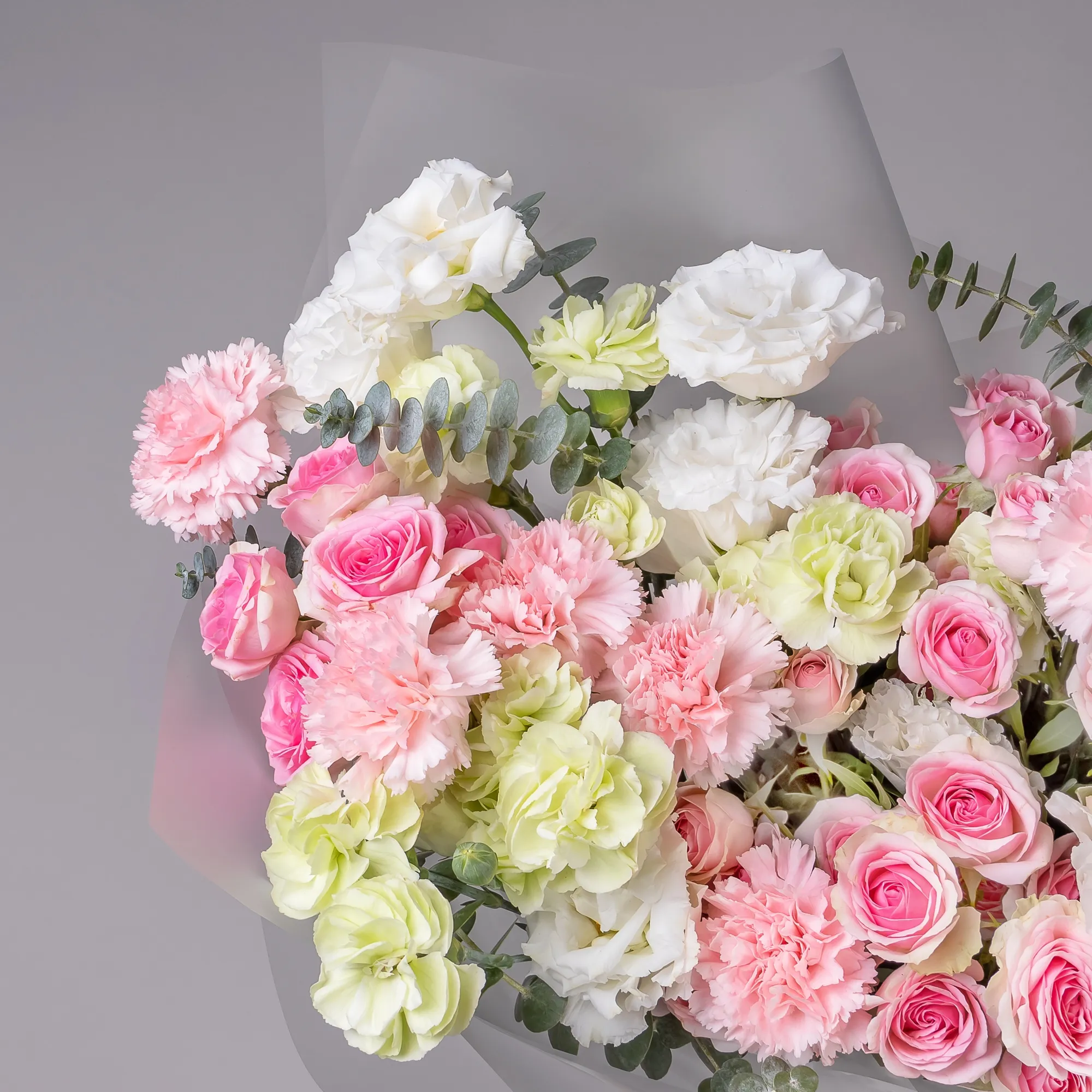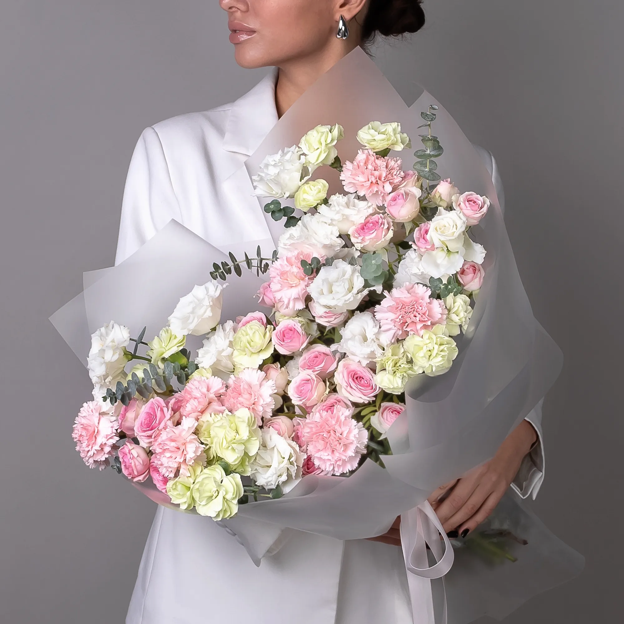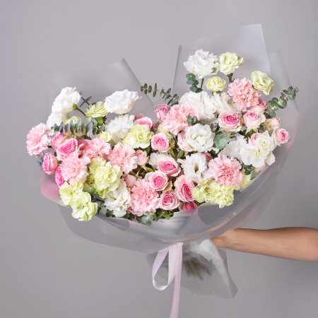 Нежный букет из розовой кустовой розы, белого лизиантуса, розового и салатового диантуса, стифы, а также листьев фисташки и эвкалипта.