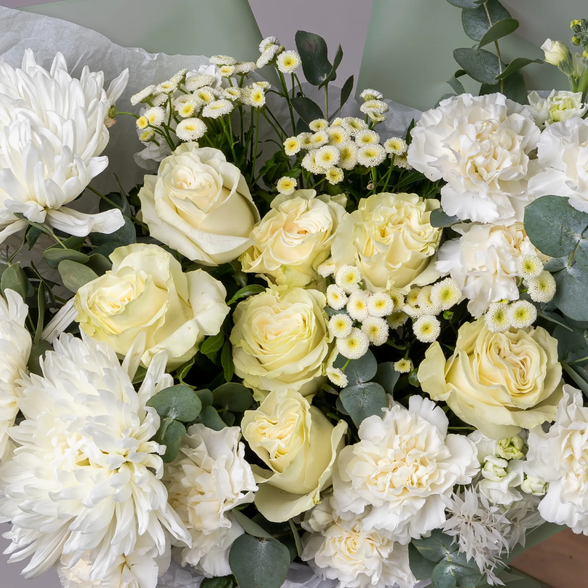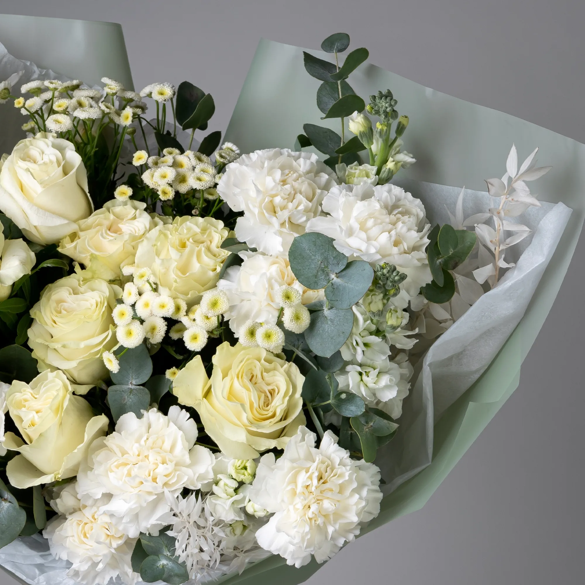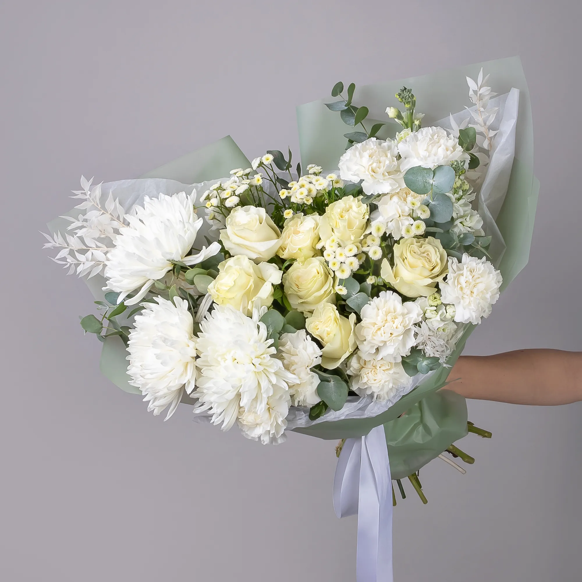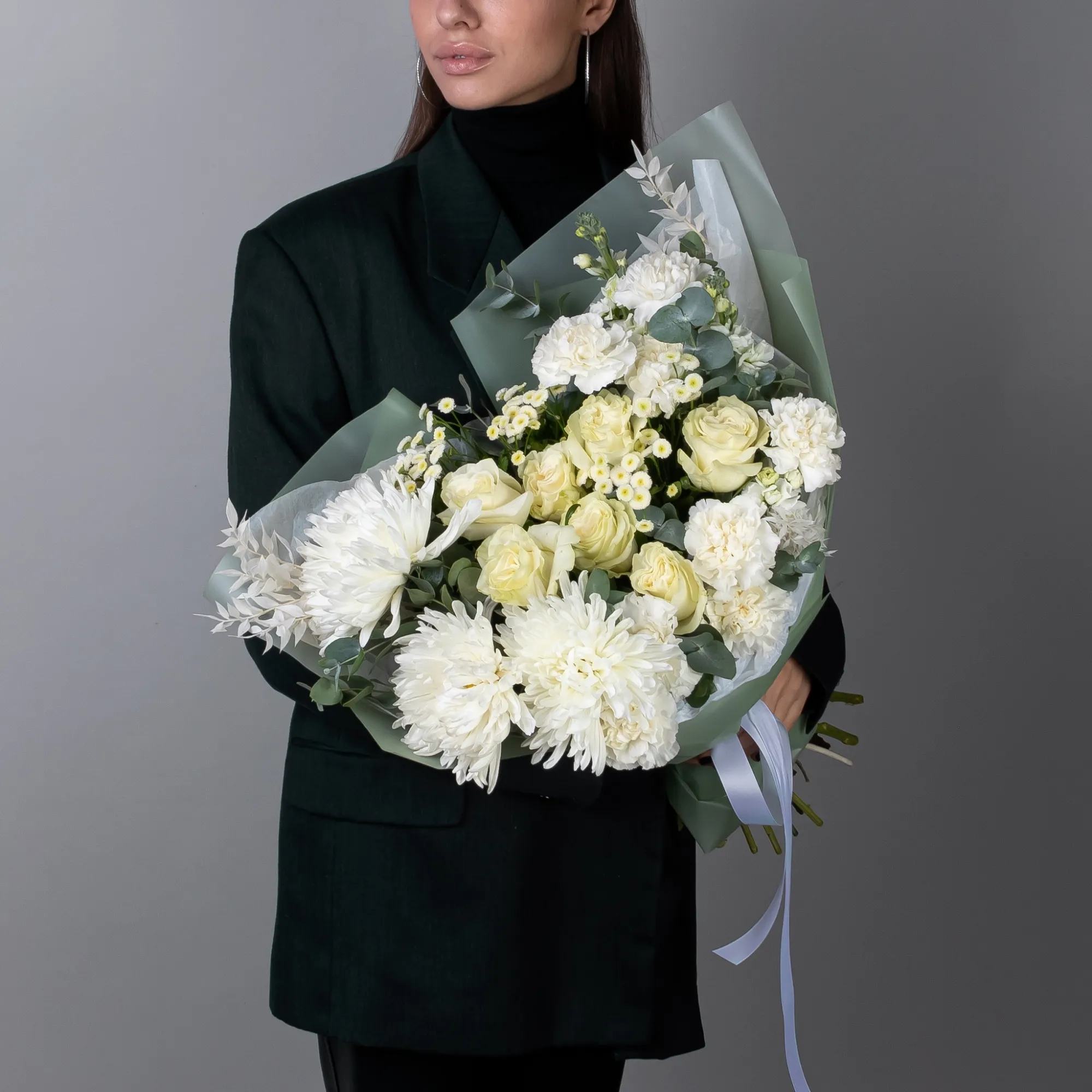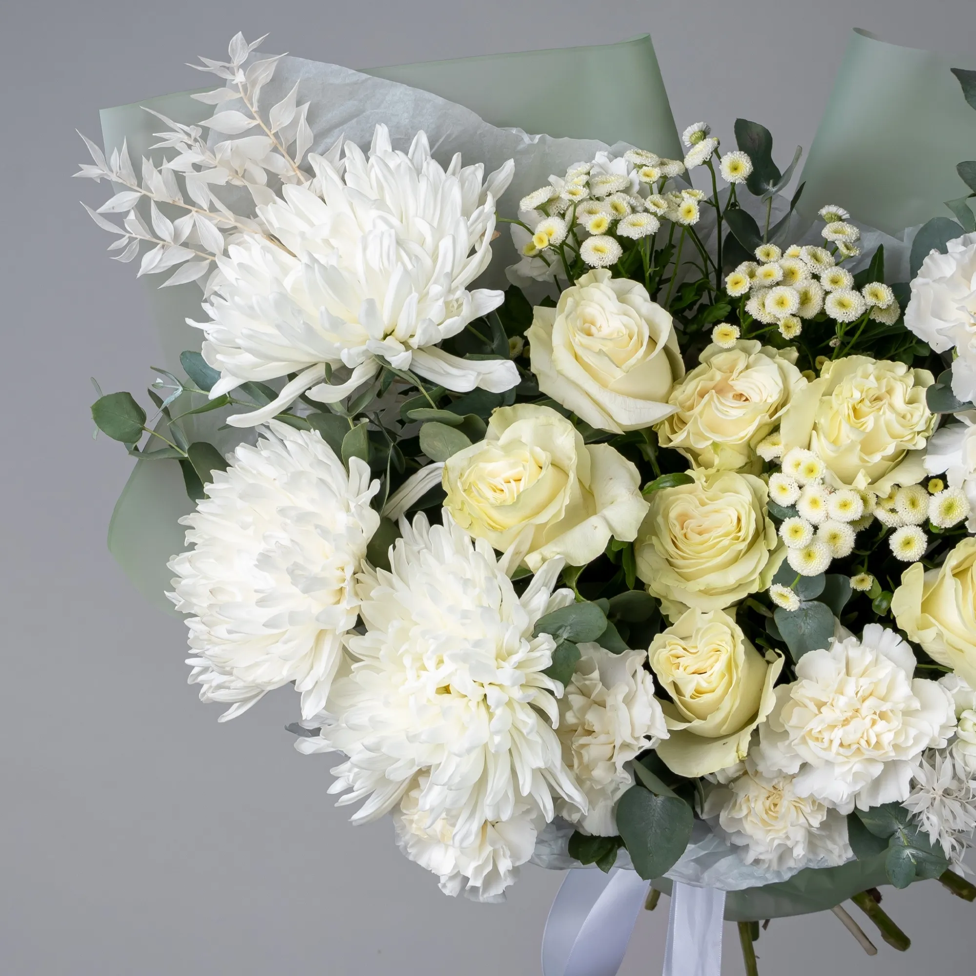 Букет в белых тонах. В составе белая хризантема сорта «Антонов», роза сорта «Мондиал», белый диантус, ароматная белая маттиола, матрикария, паникум, крашеные листья рускуса, а также листья эвкалипта и фисташки.