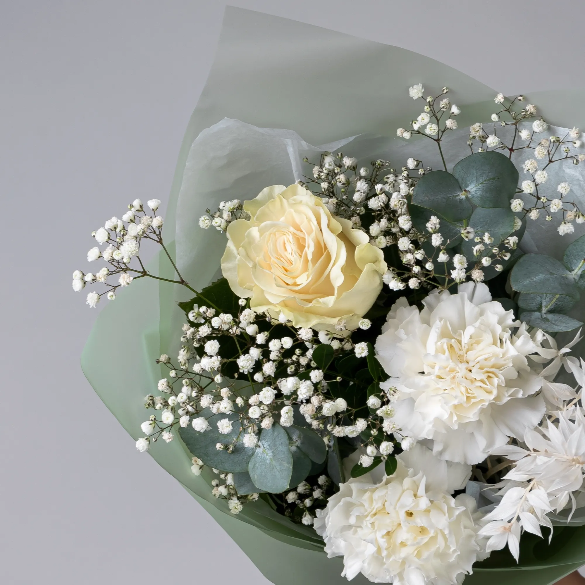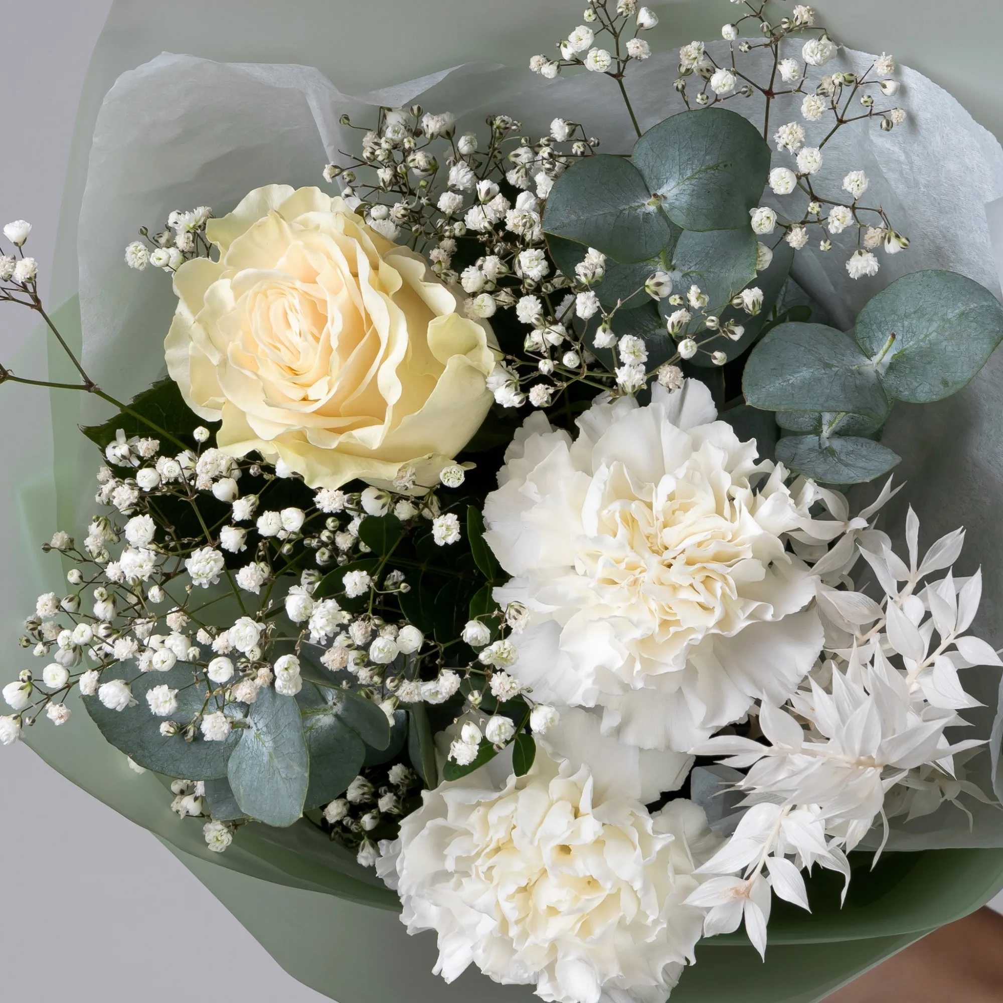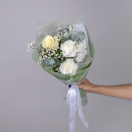 Гвоздика, Роза, Гипсофила, Листья рускус, Листья фисташки, Листья эвкалипта