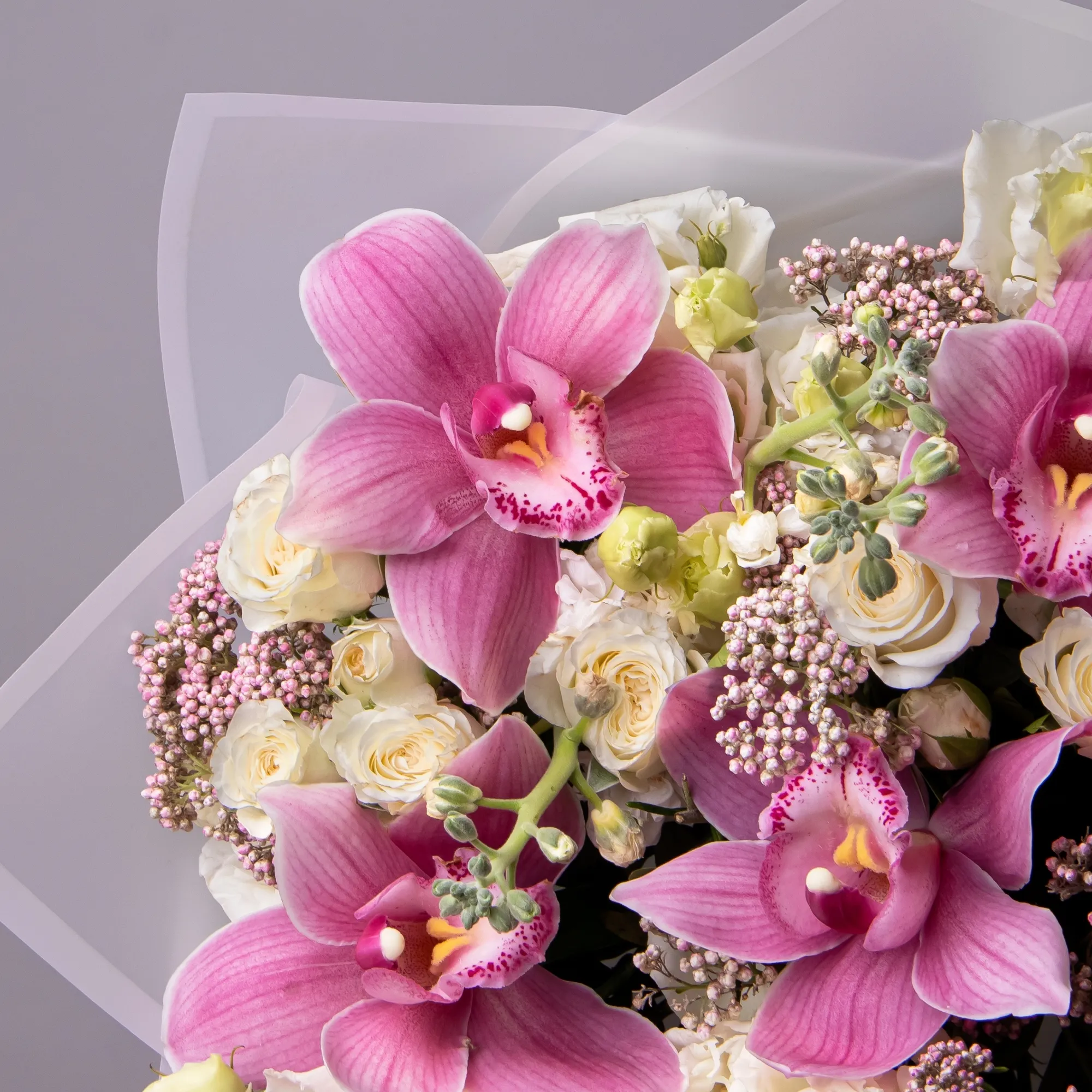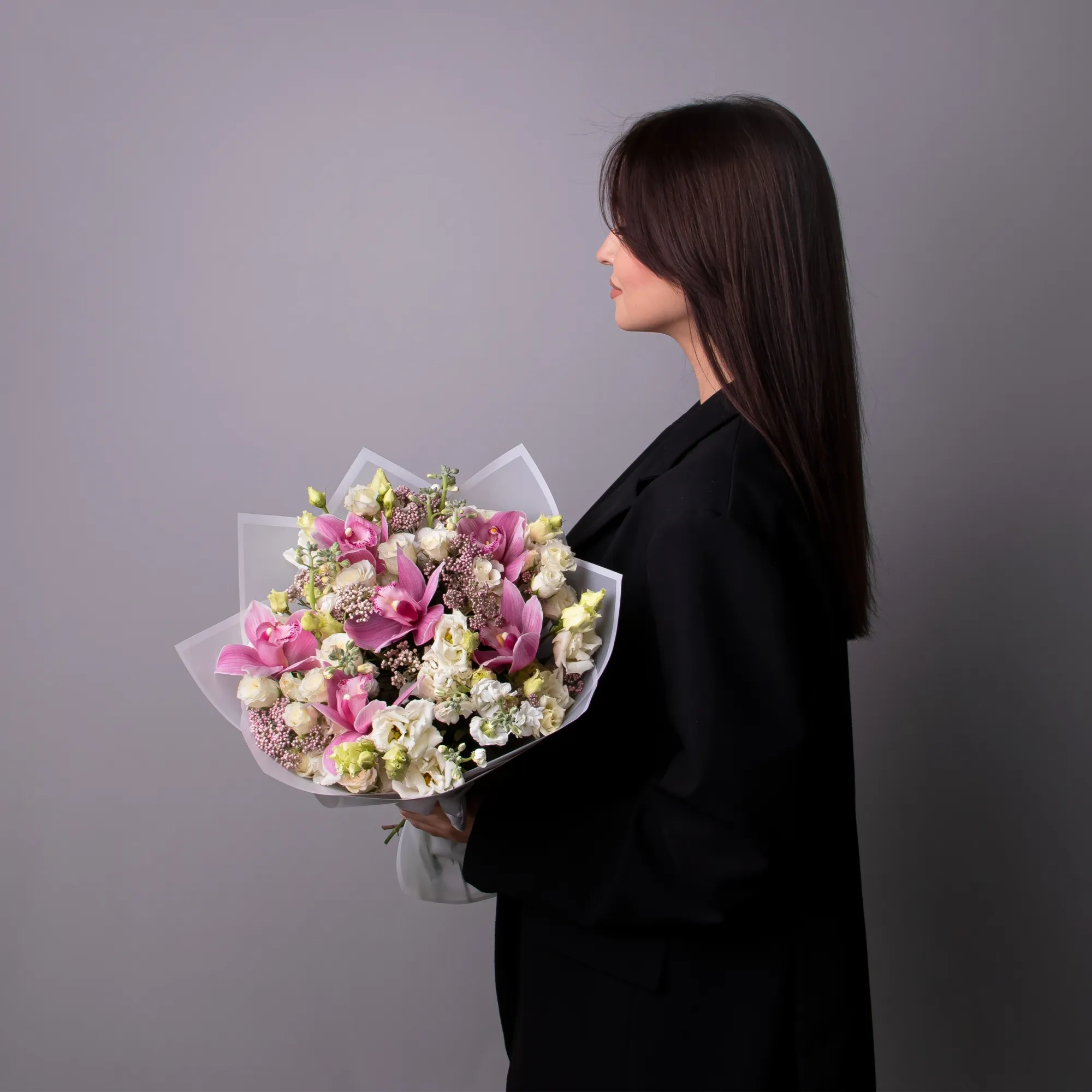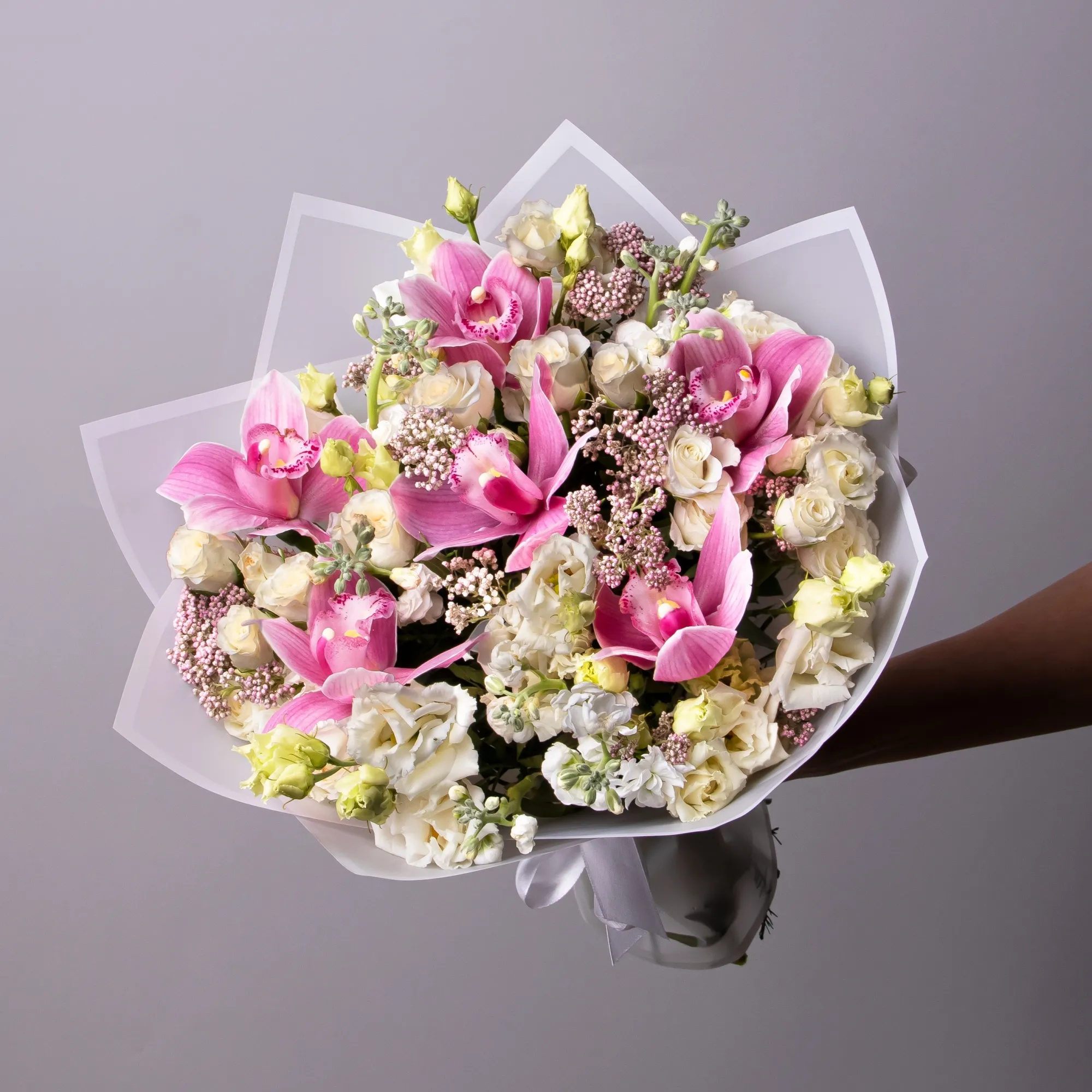 Букет живых цветов с эустомой и орхидеями "Обаяние"