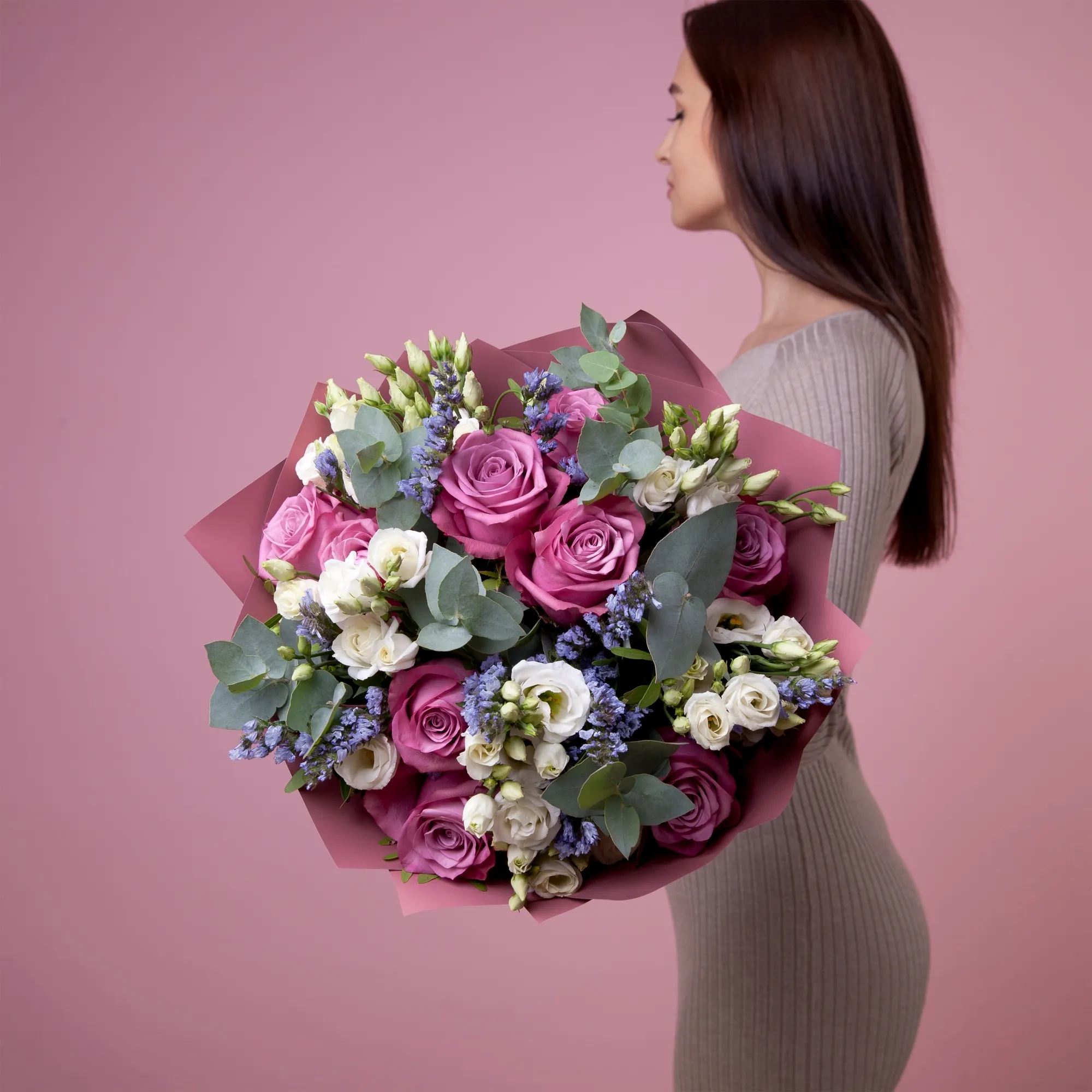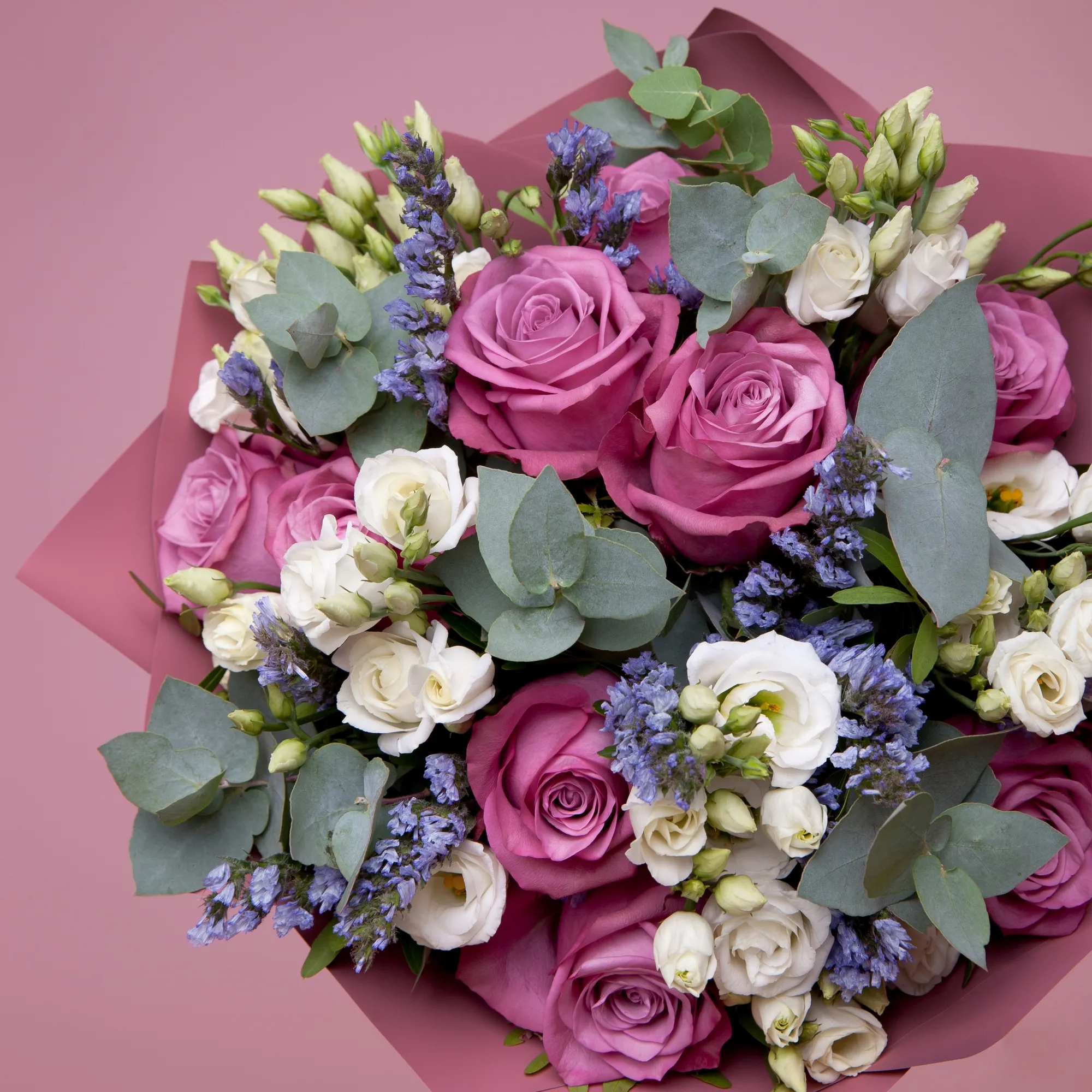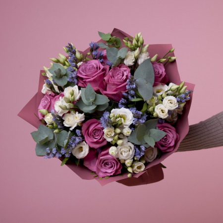 В составе букета "Черничный пирог L" роза "Муди блюз", белый лизиантус, сиреневая статица, дополнен листьями фисташки и эвкалипта. Этот букет идеально подойдёт для следующих случаев: *День рождения близкого человека - нежные оттенки сиреневого и белого в букете создают атмосферу уюта и тепла, а необычное сочетание цветов напомнит о любимых десертах, такой букет станет приятным сюрпризом для тех, кто ценит элегантность и оригинальность в подарках. *Поздравление с повышением или успехом- стильный и современный дизайн букета подчеркнет статусность момента, а его изысканная цветовая гамма будет уместна как в офисе, так и дома, такой букет станет достойным дополнением к поздравлениям с достижениями и новыми возможностями. Закажите букет с доставкой или заберите самовывозом. И помните, что цветы - это просто.