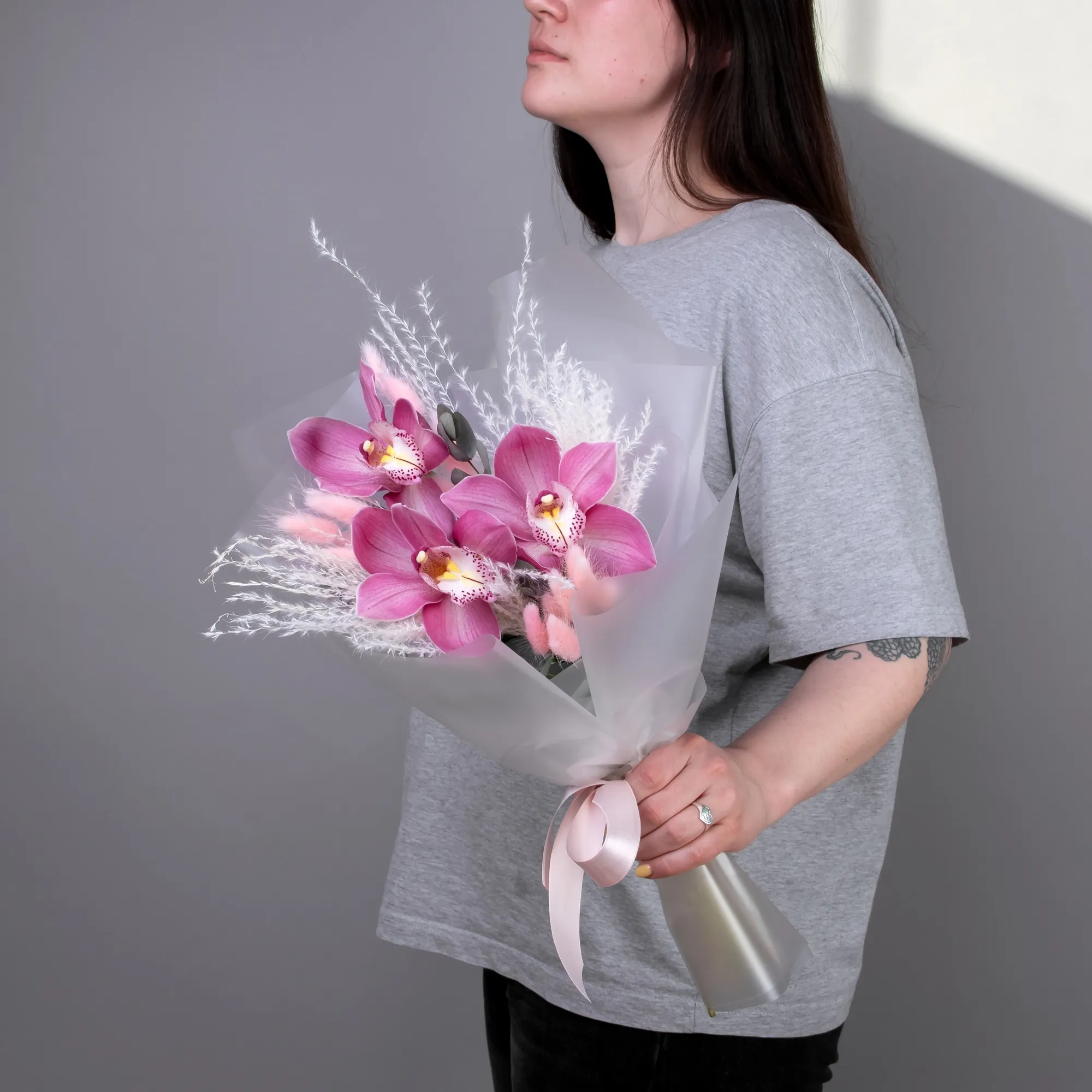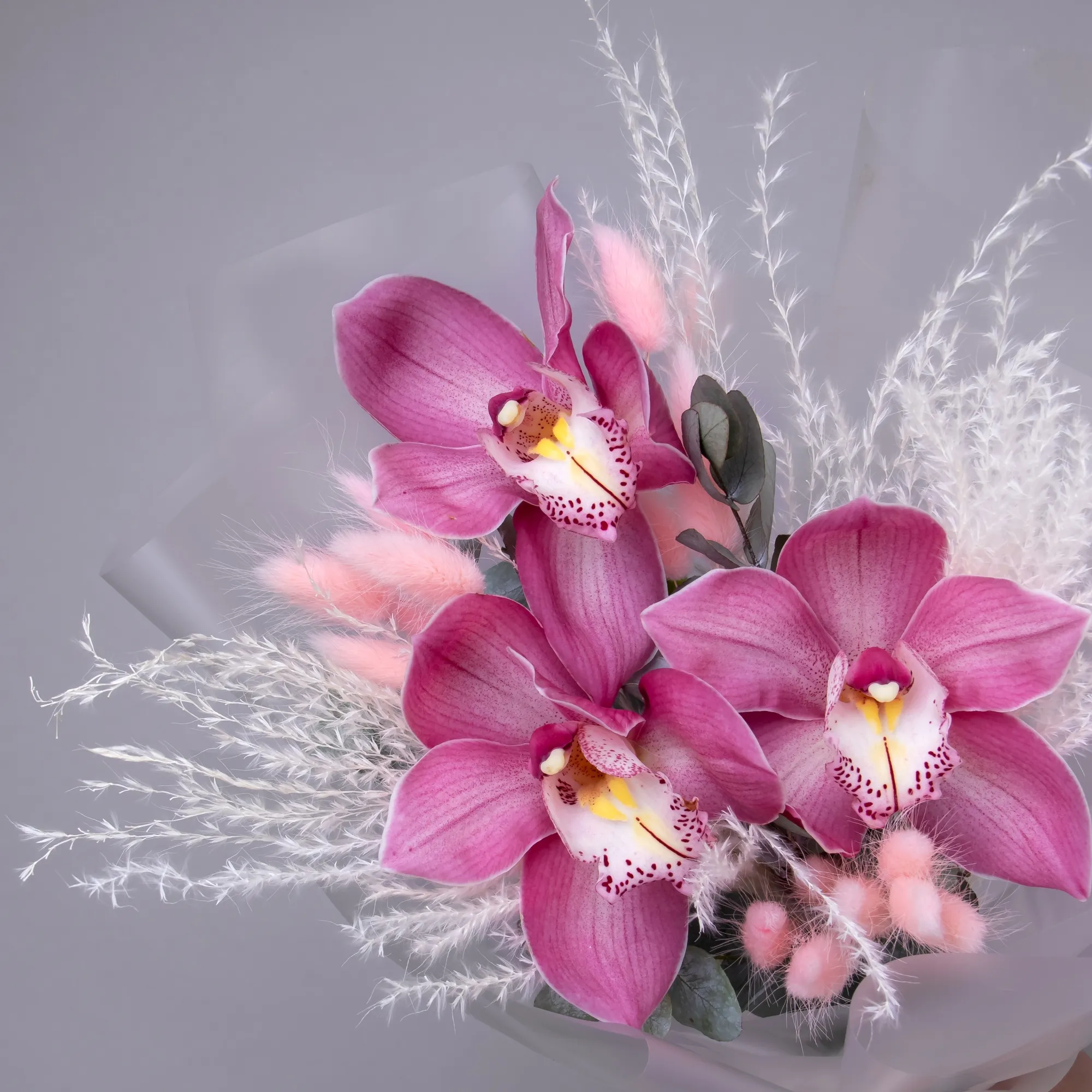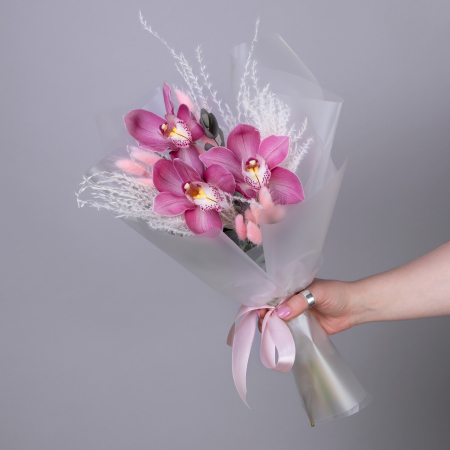 Небольшой букетик-комплимент с розовым цимбидиумом (орхидеей), эулалией и лагурусом. Дополнени прозрачной пленкой.
