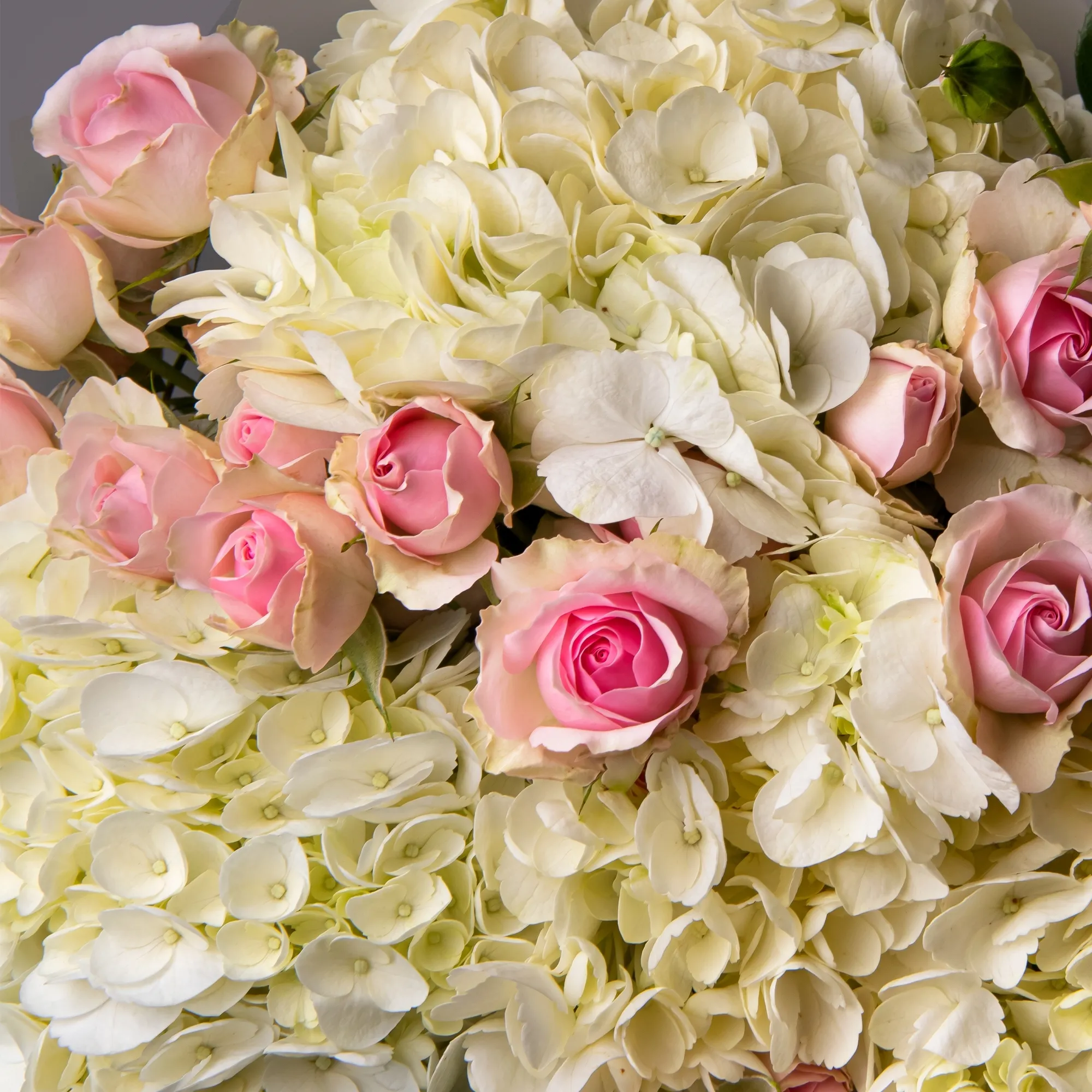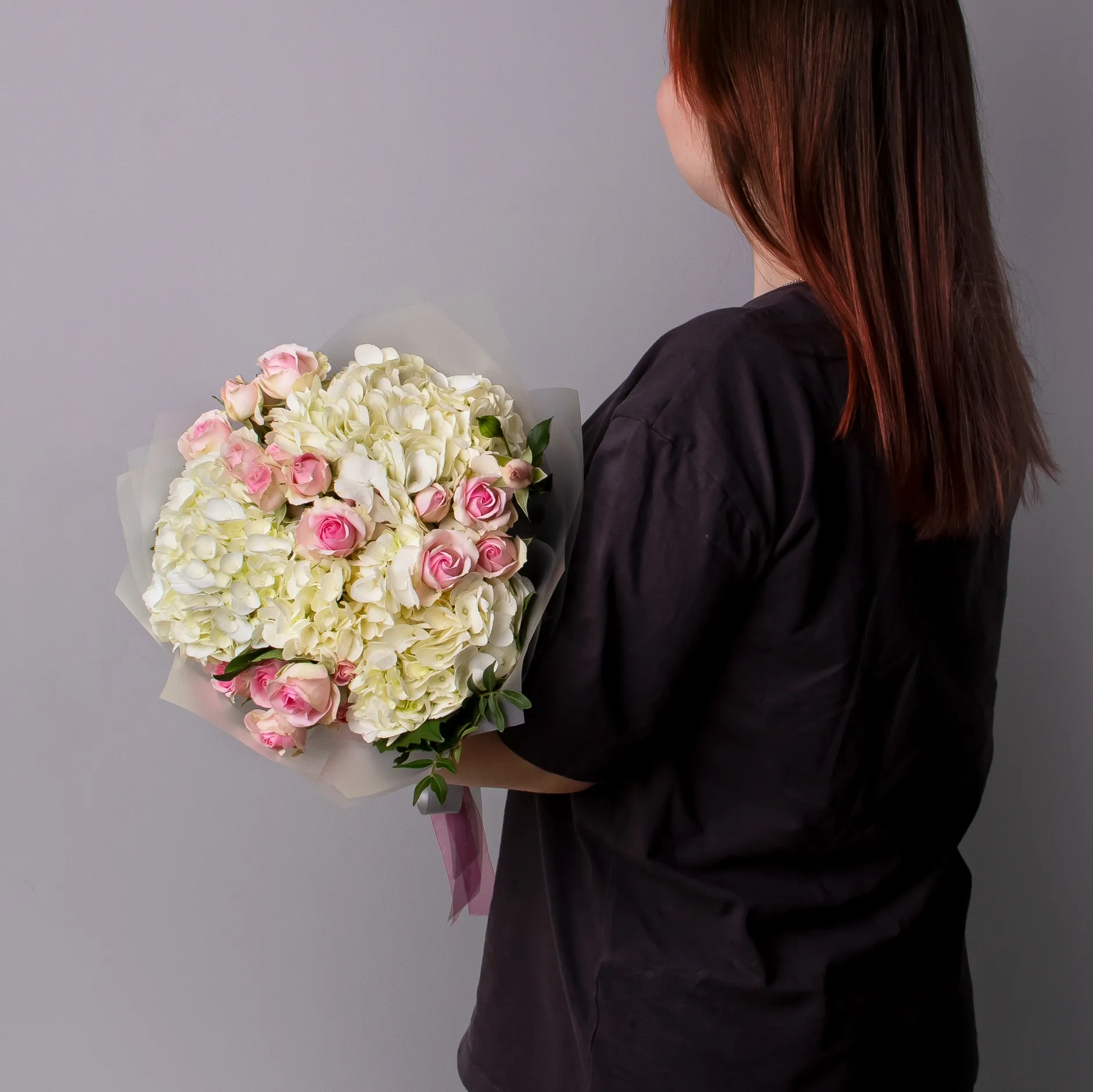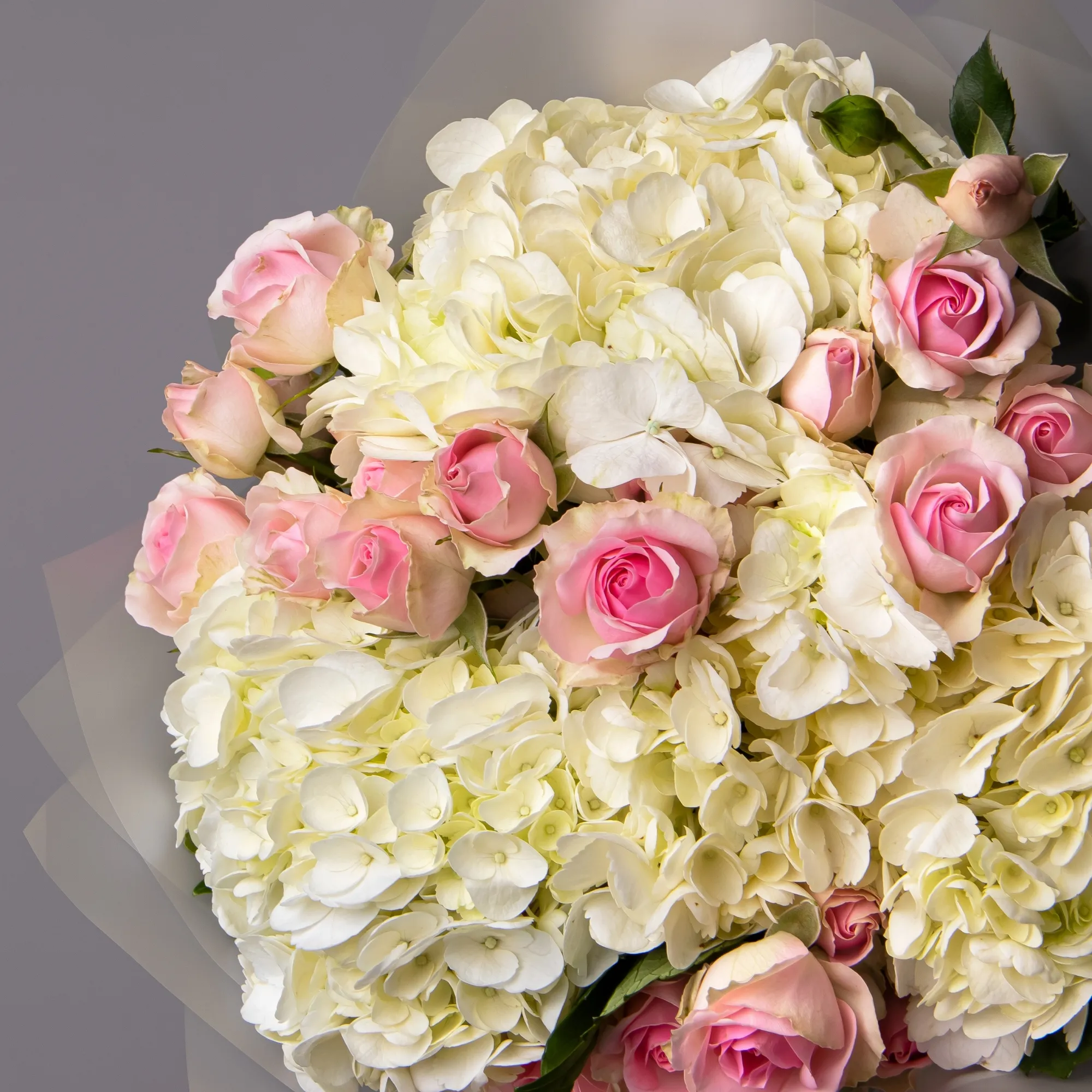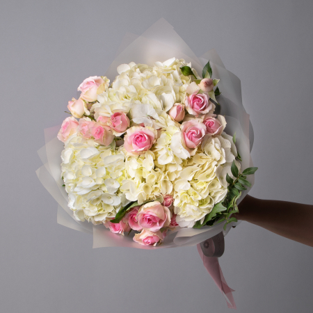 Дуобукет из белой гортензии и кустовой розы