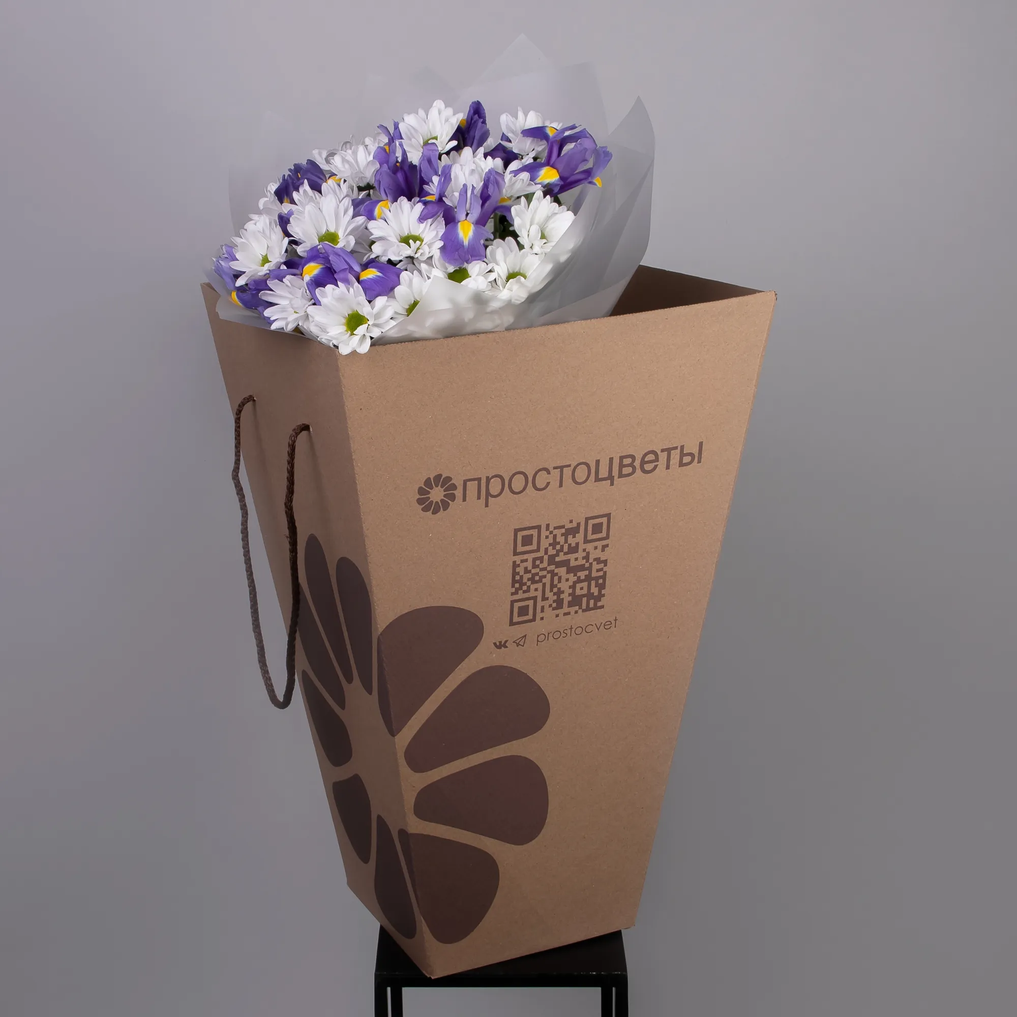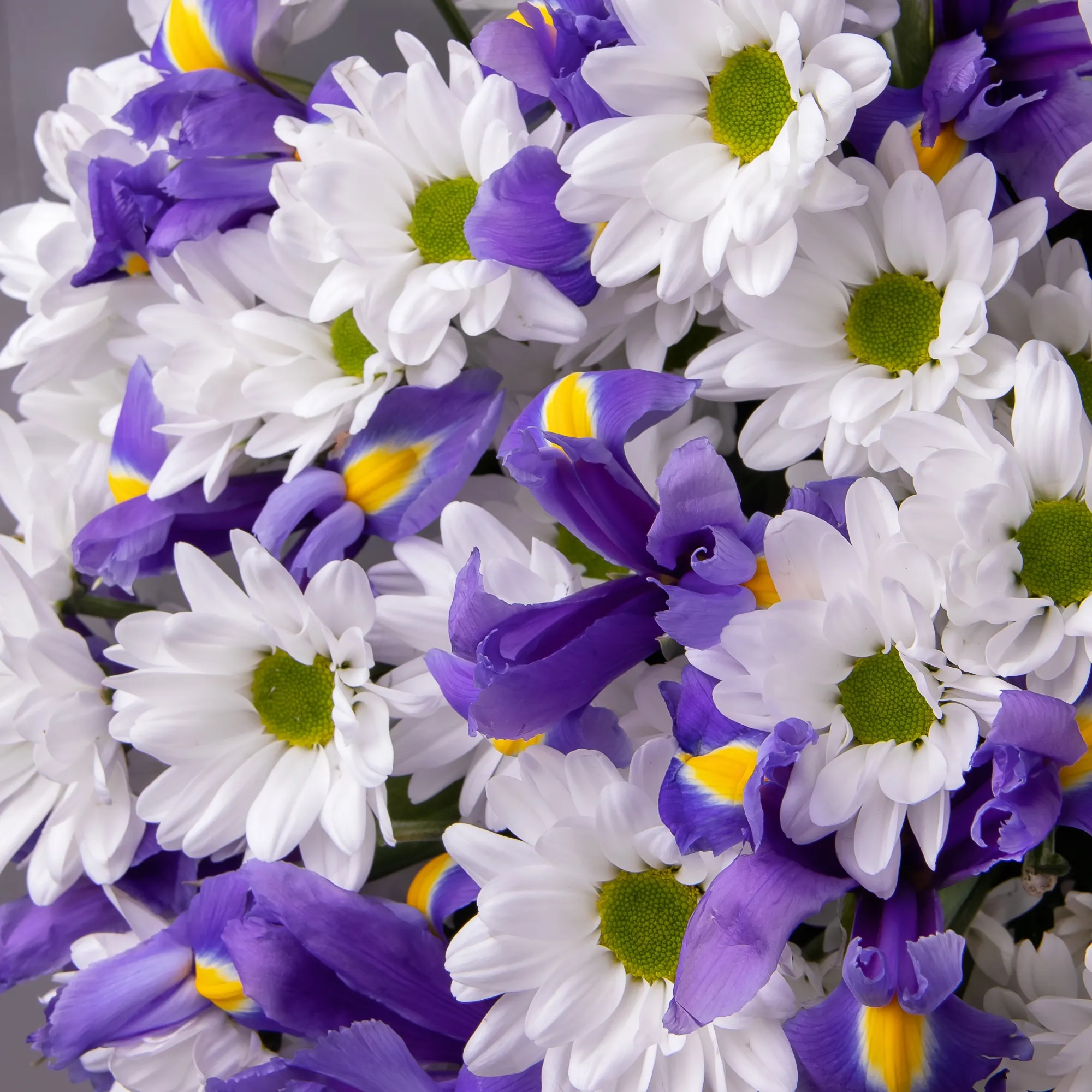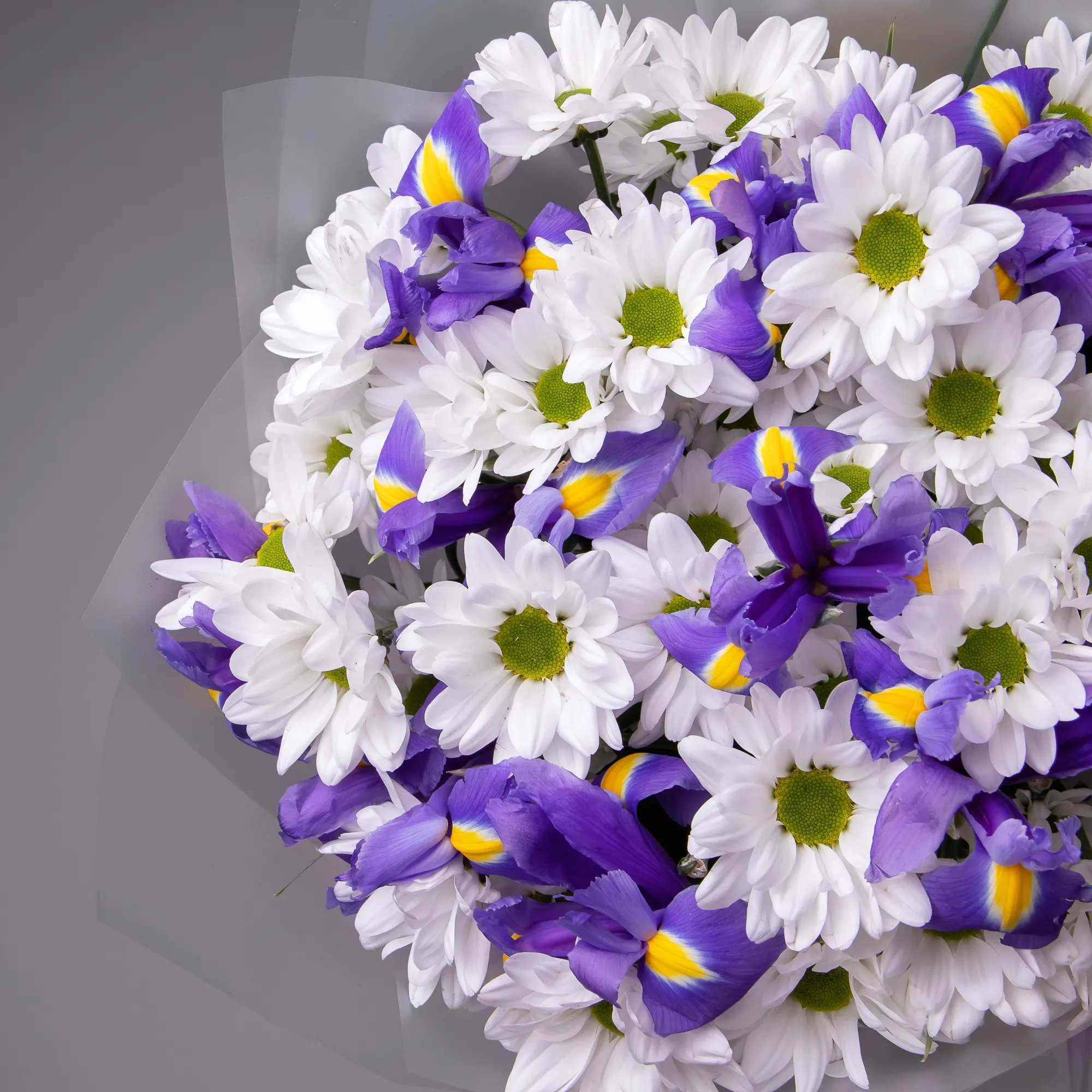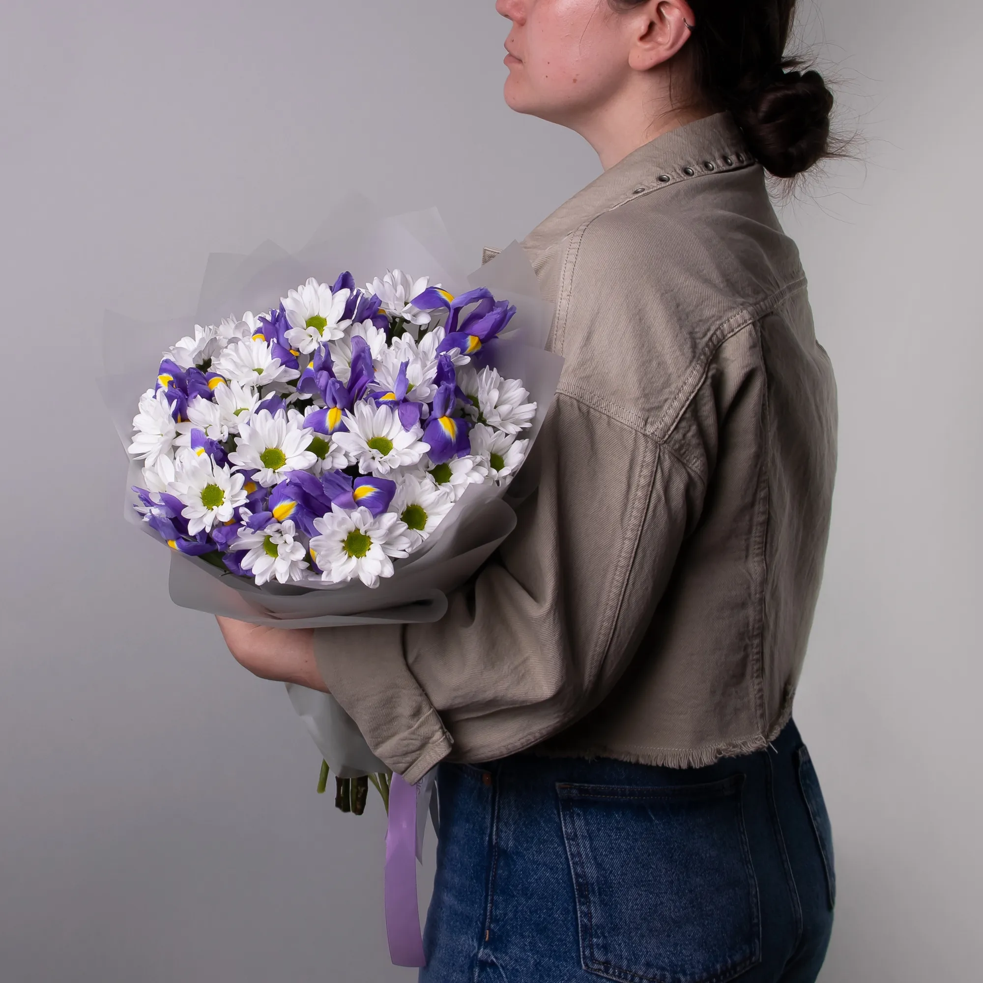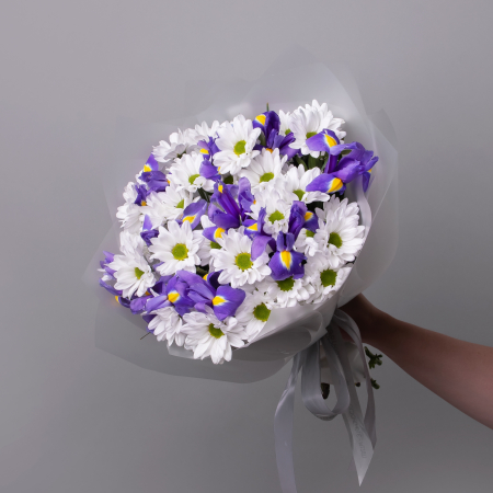 Дуобукет из белой кустовой хризантемы и синего ириса