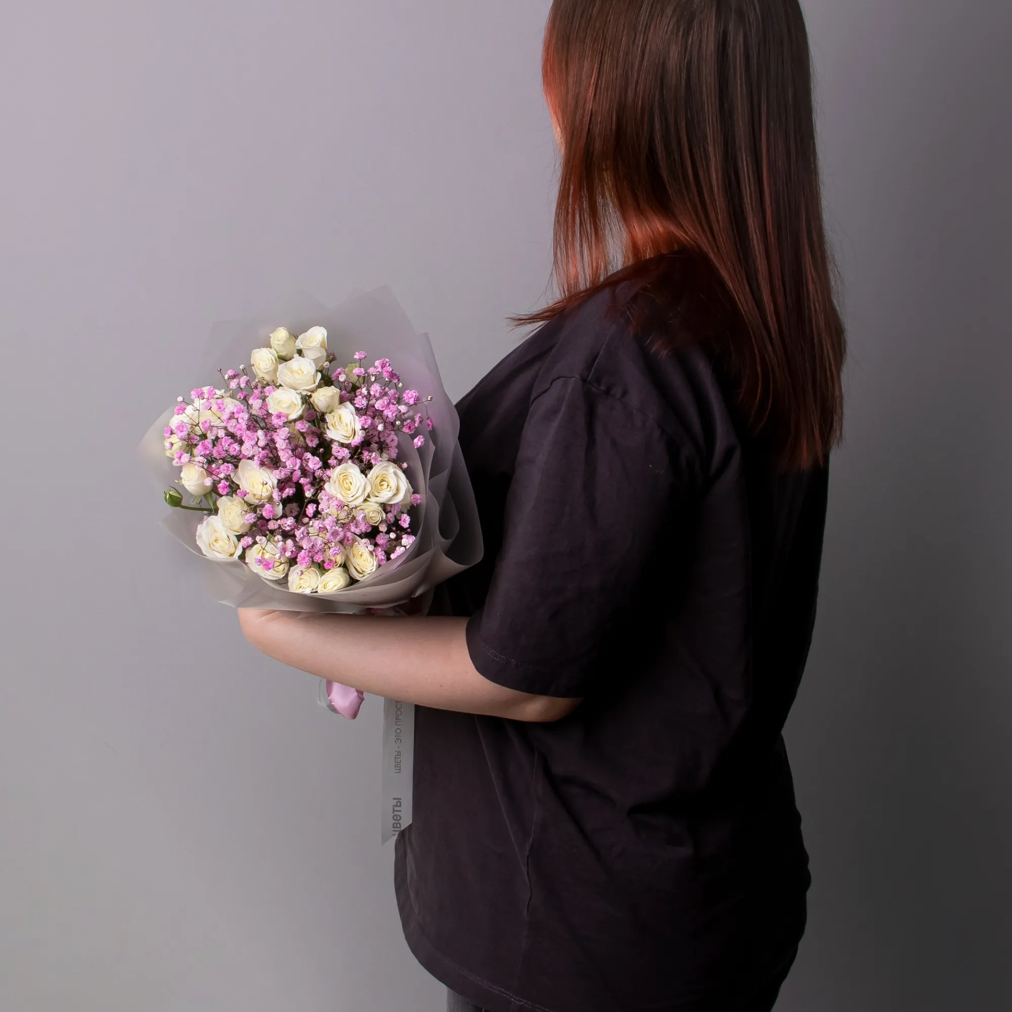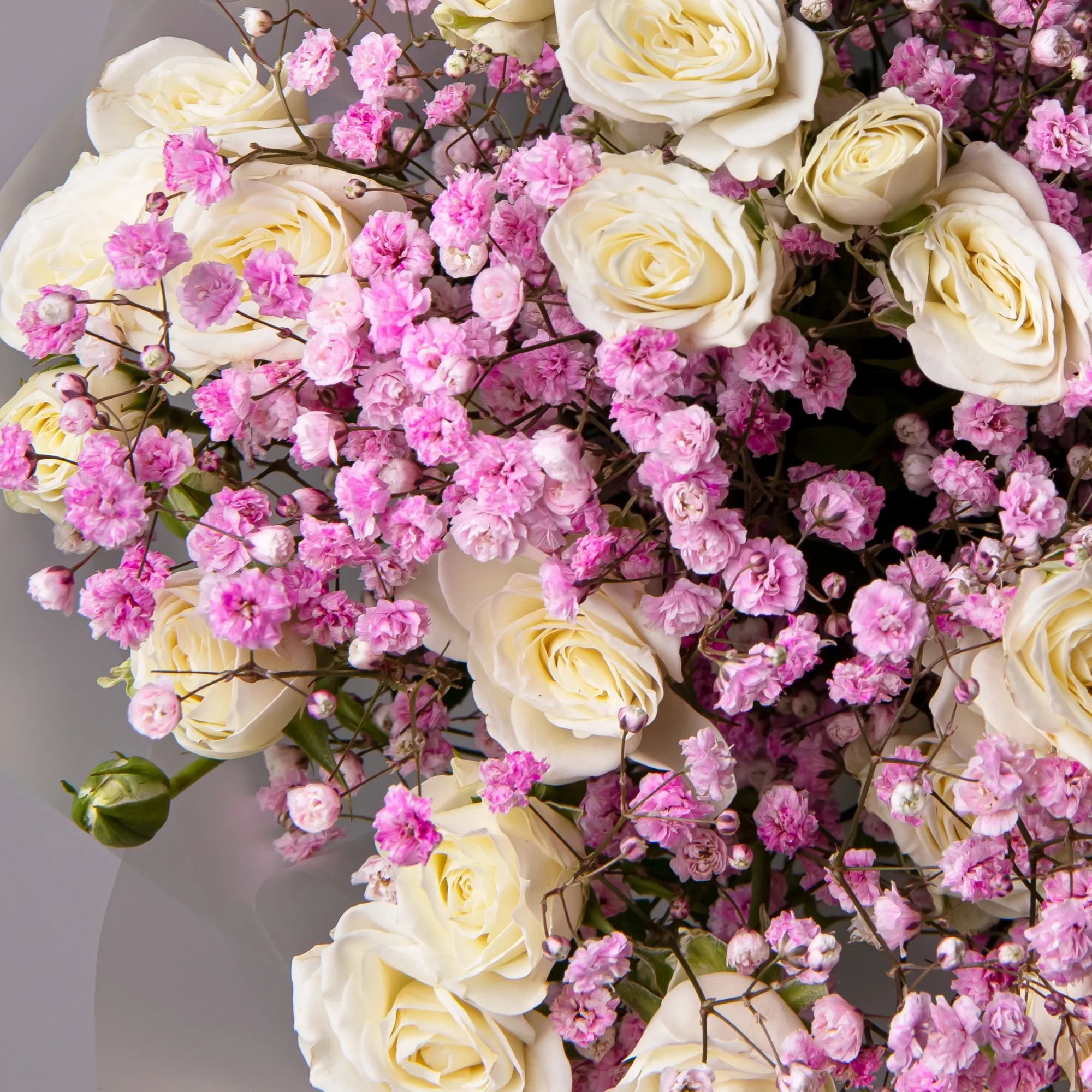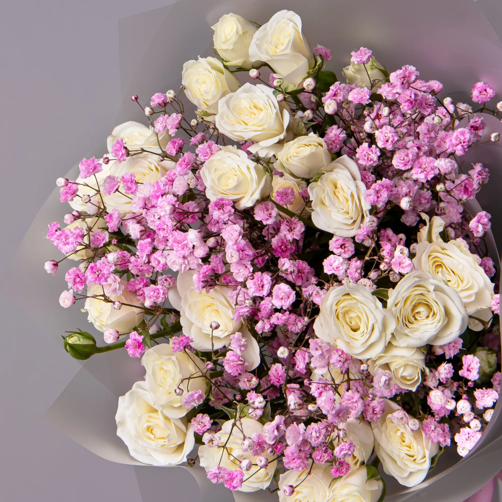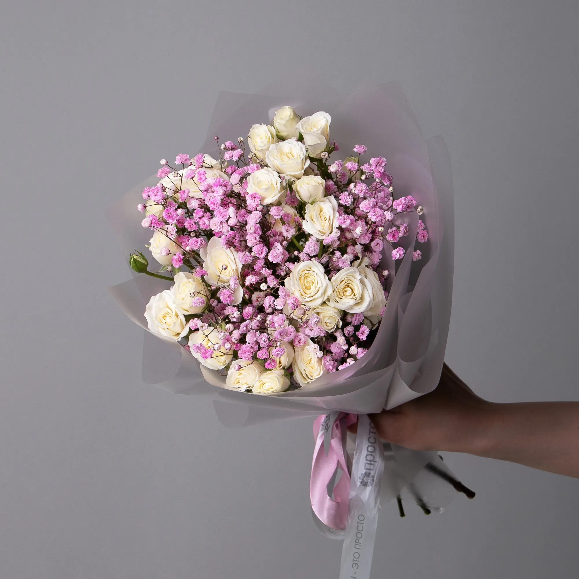 Дуобукет из розовой гипсофилы и белой кустовой розы