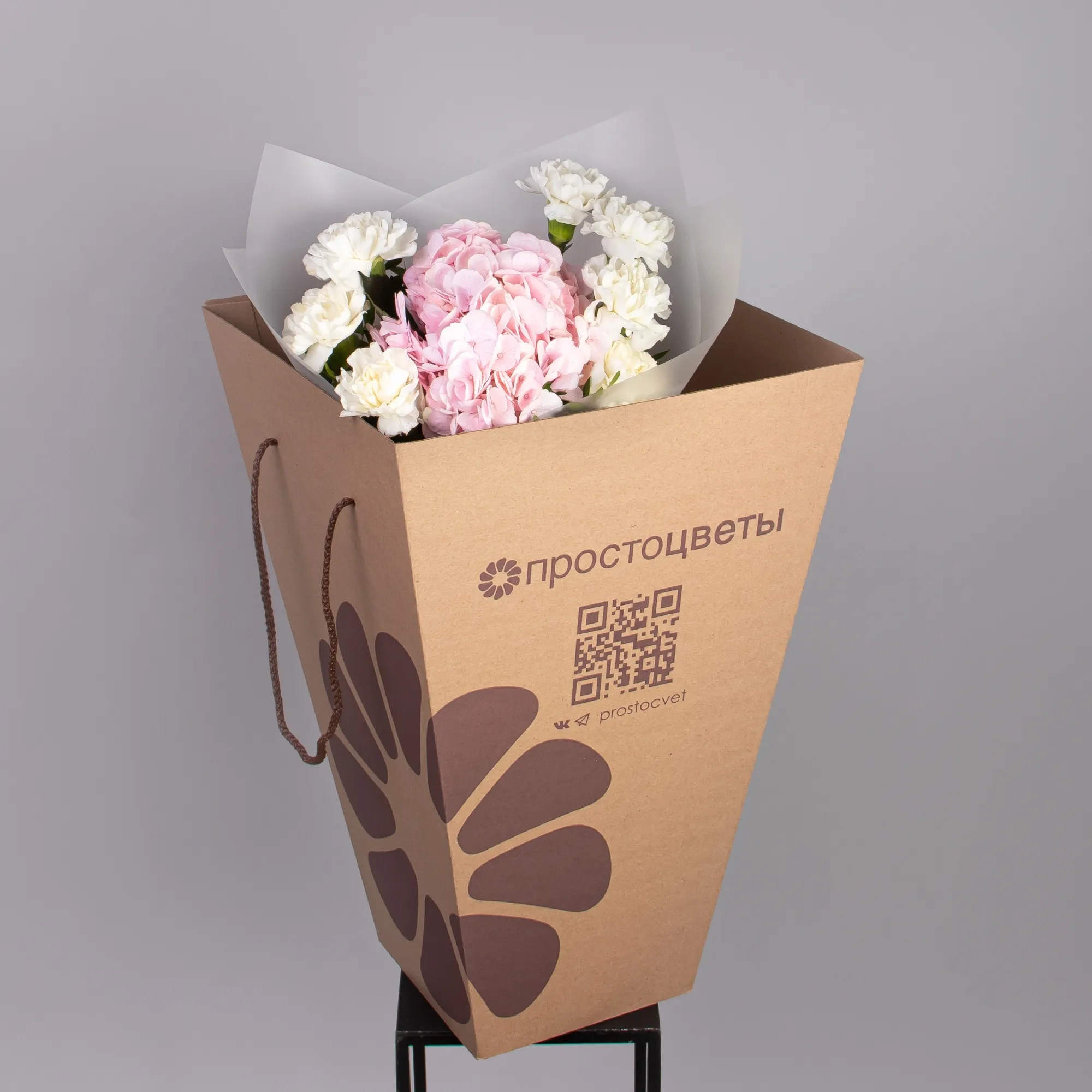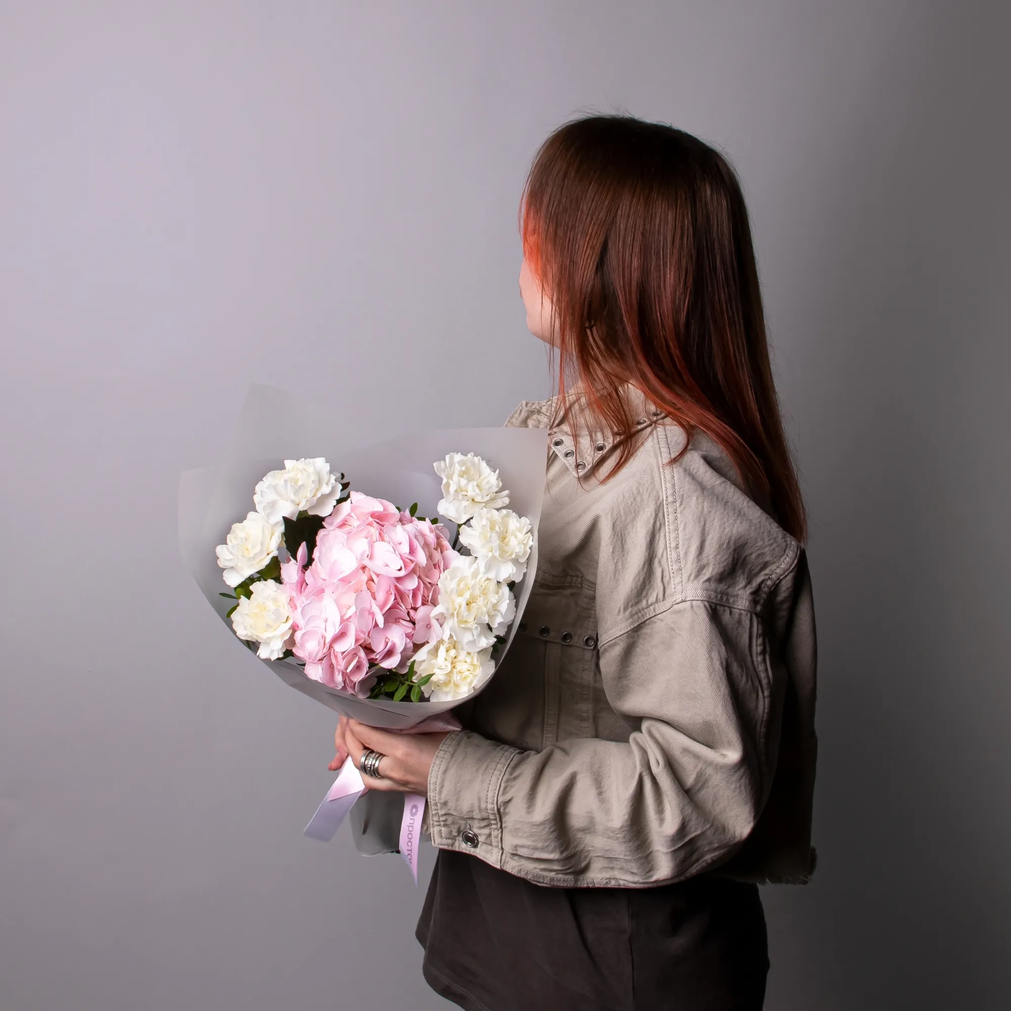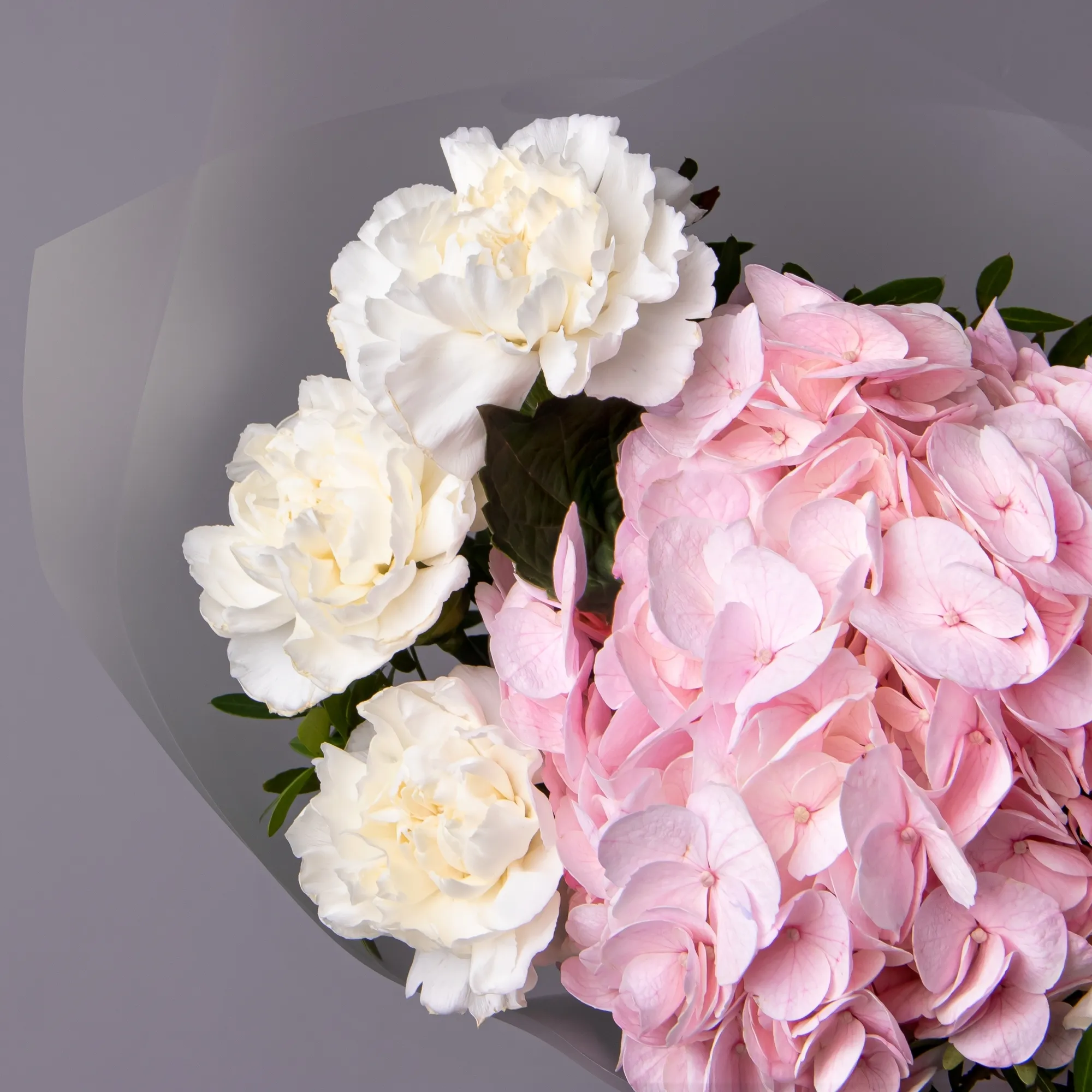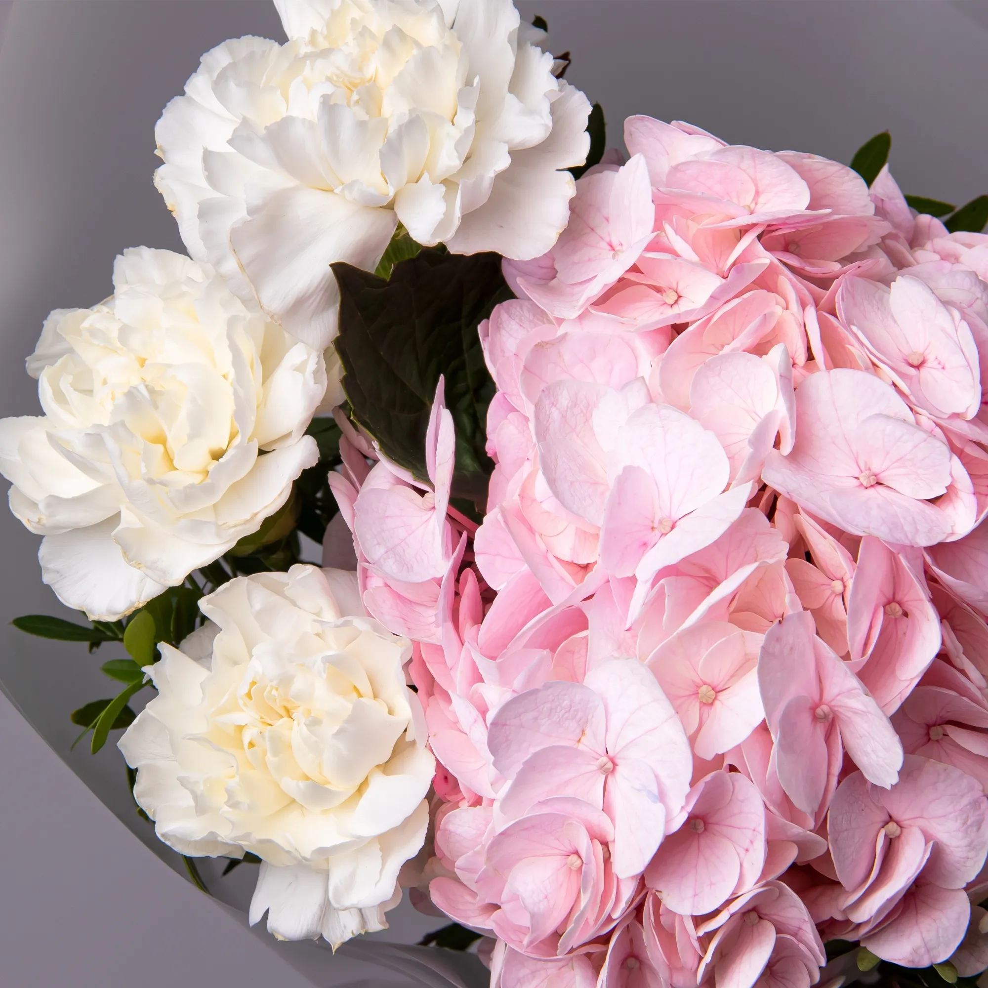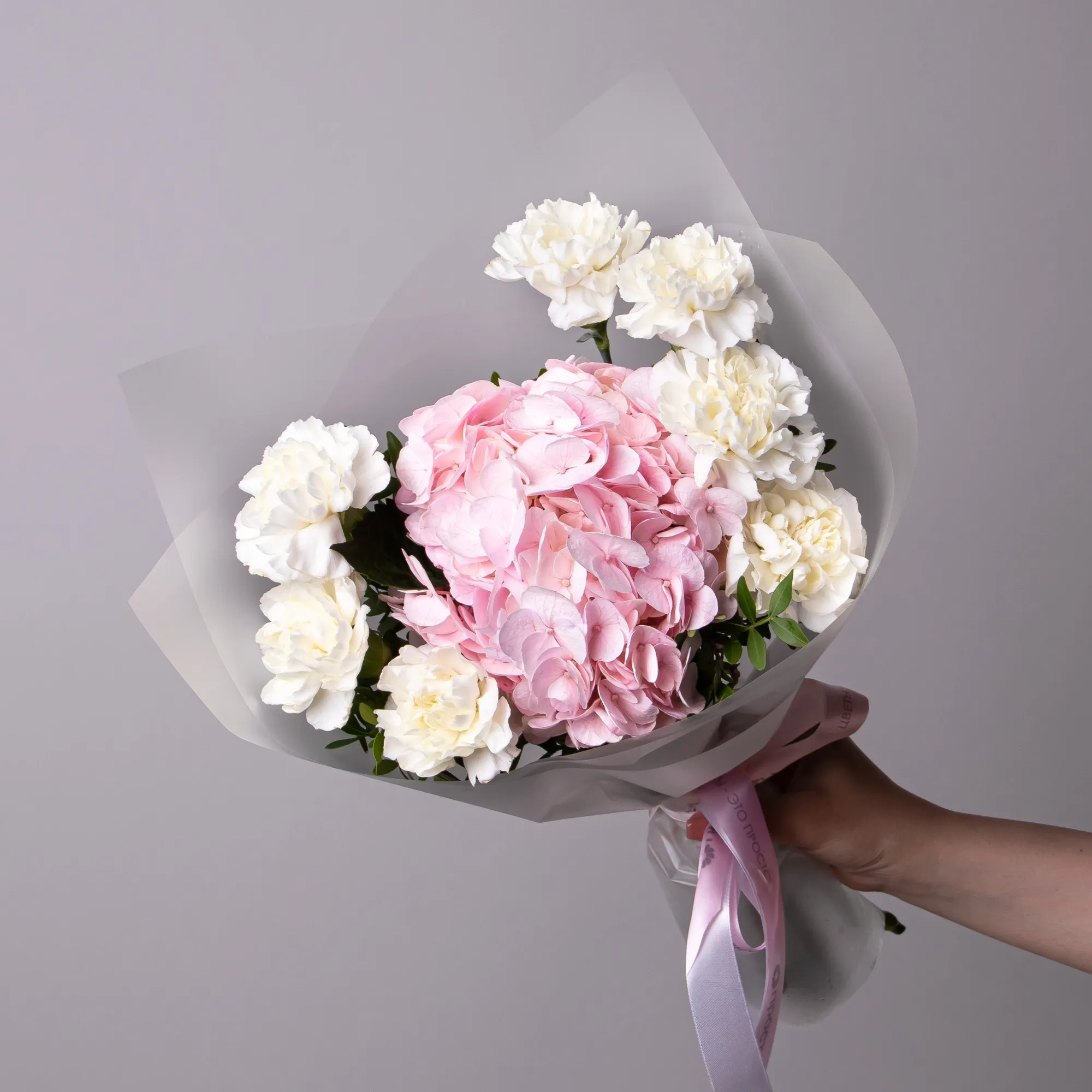 Дуобукет из розовой гортензии и белых диантусов