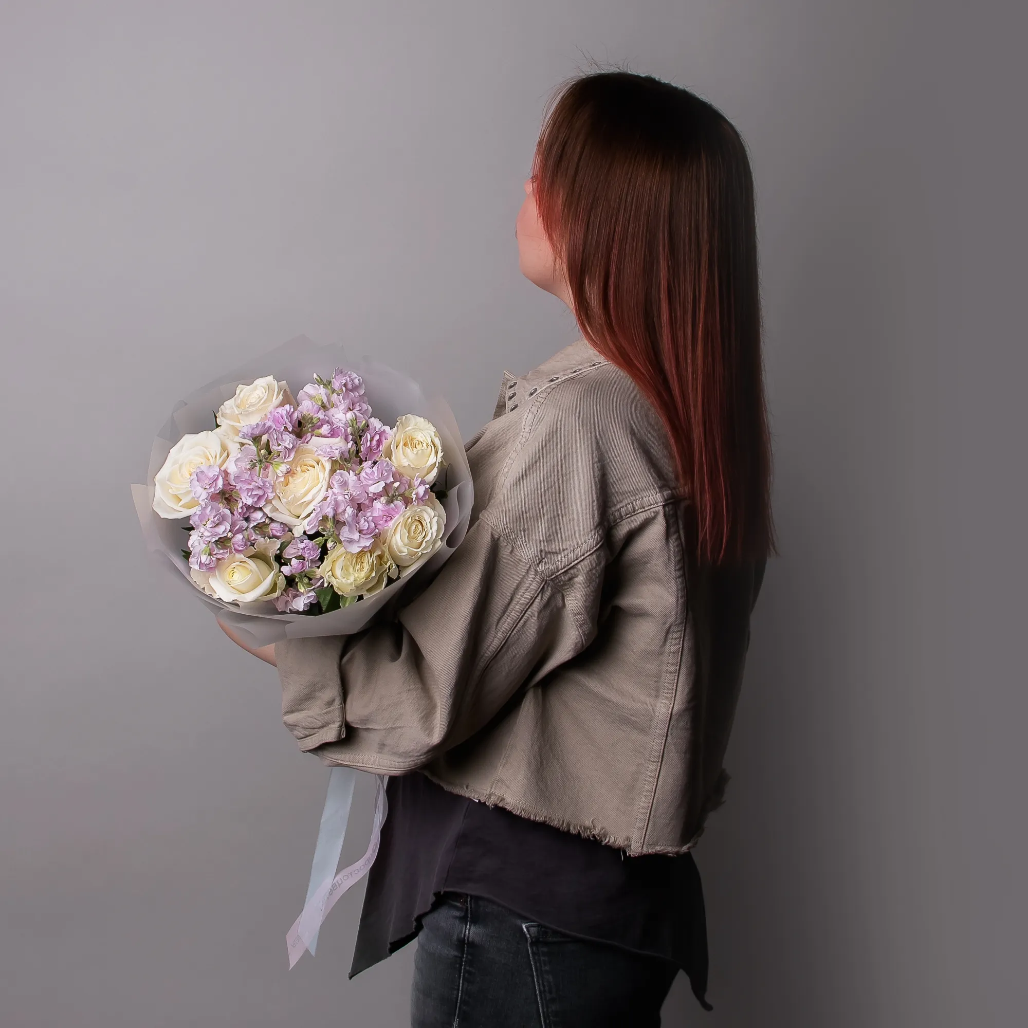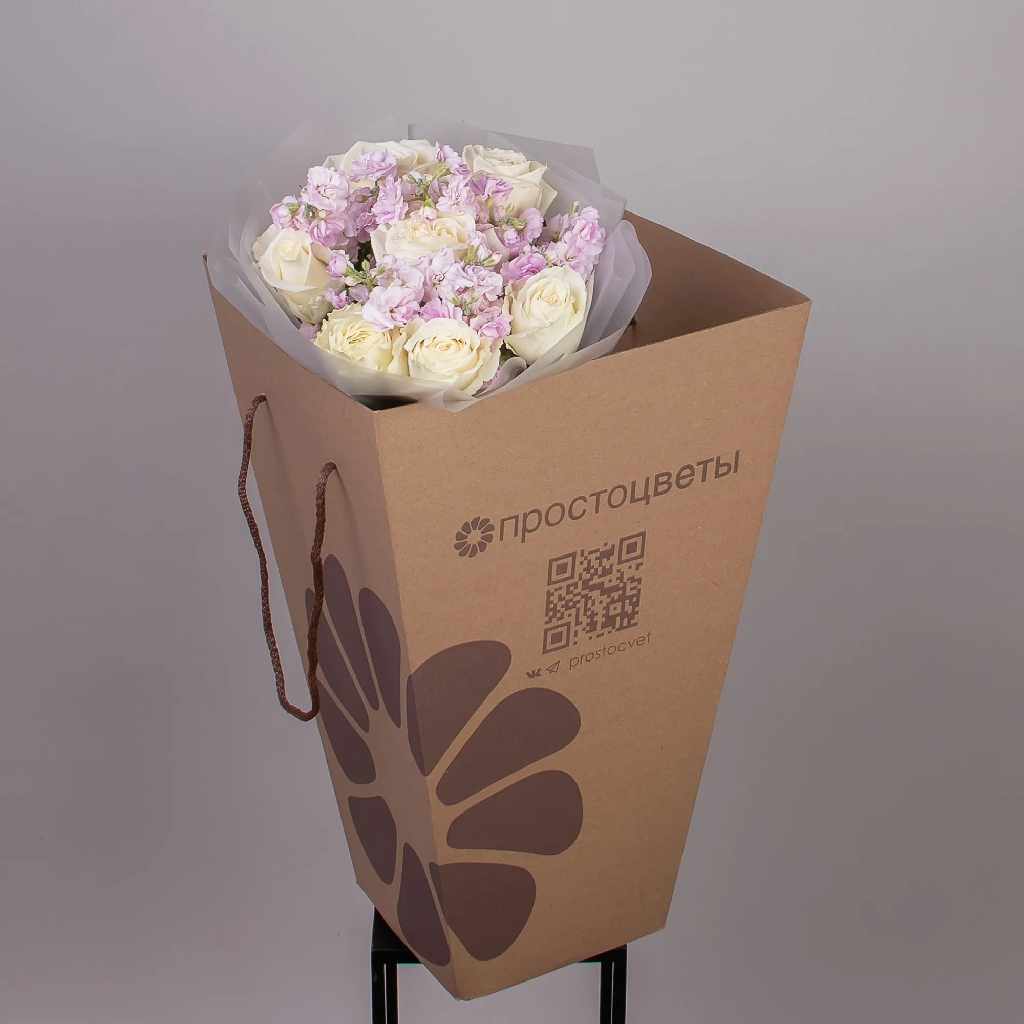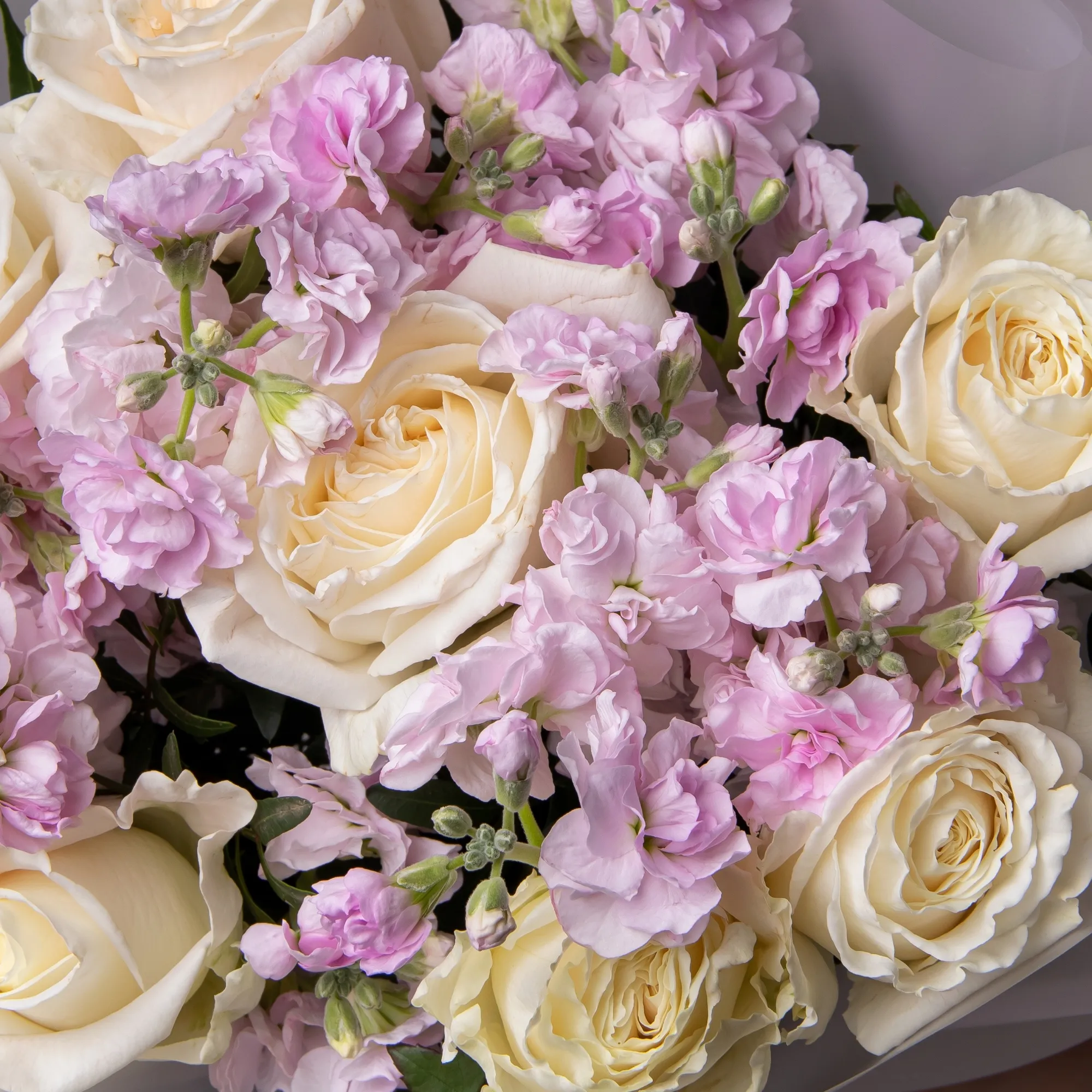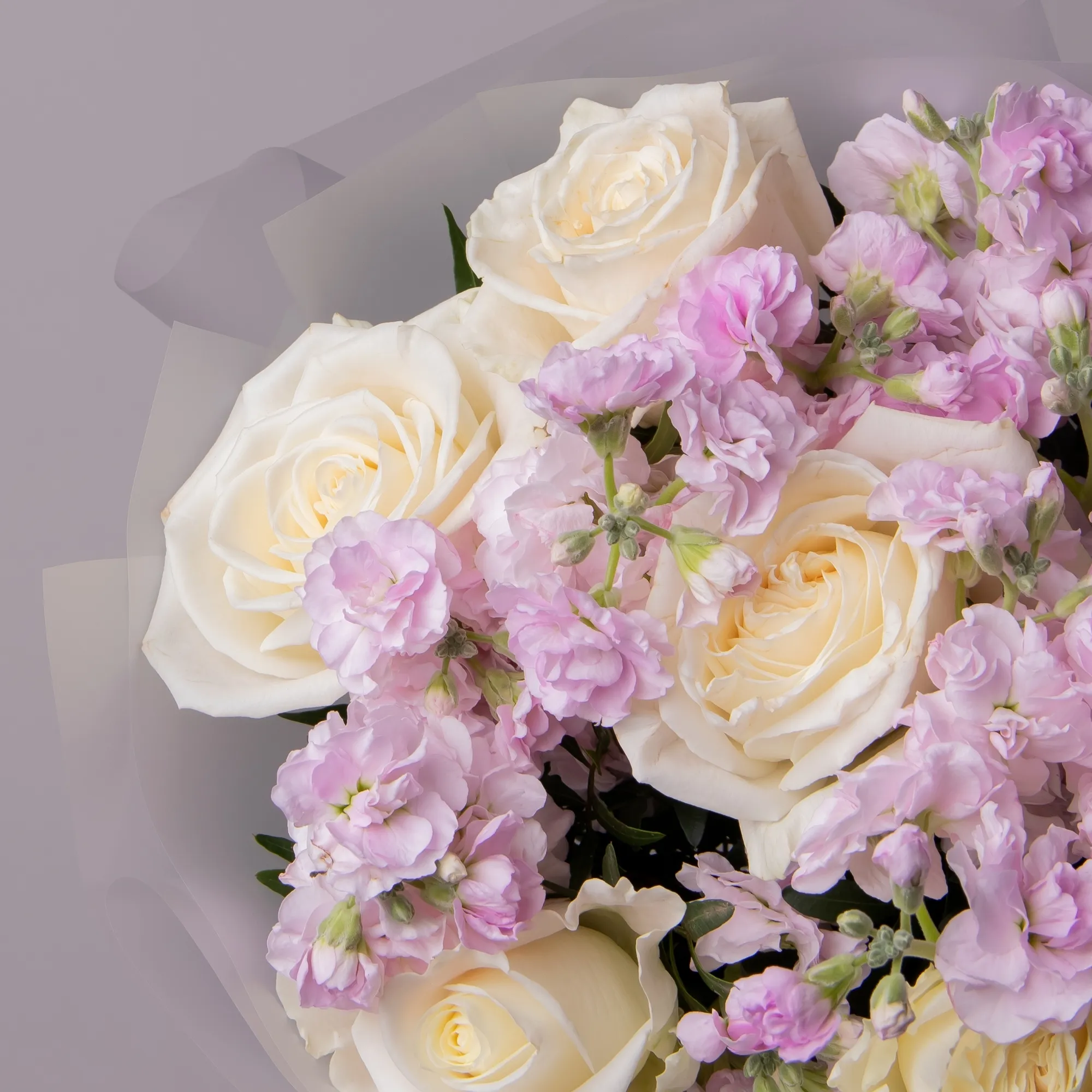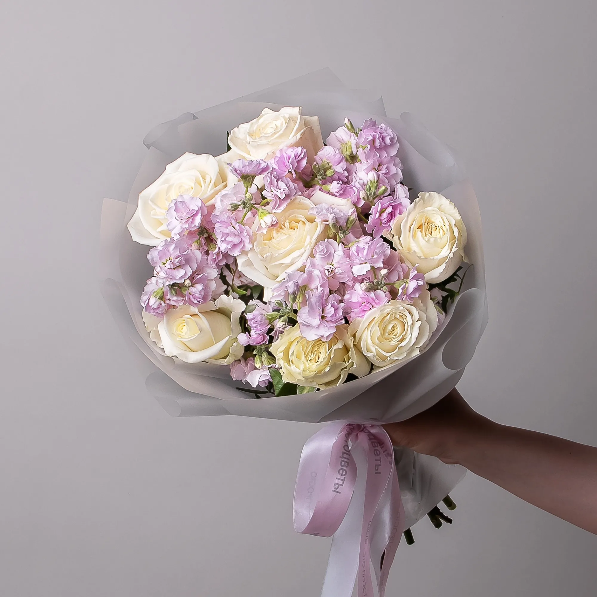 Дуобукет из розовой маттиолы и белой розы