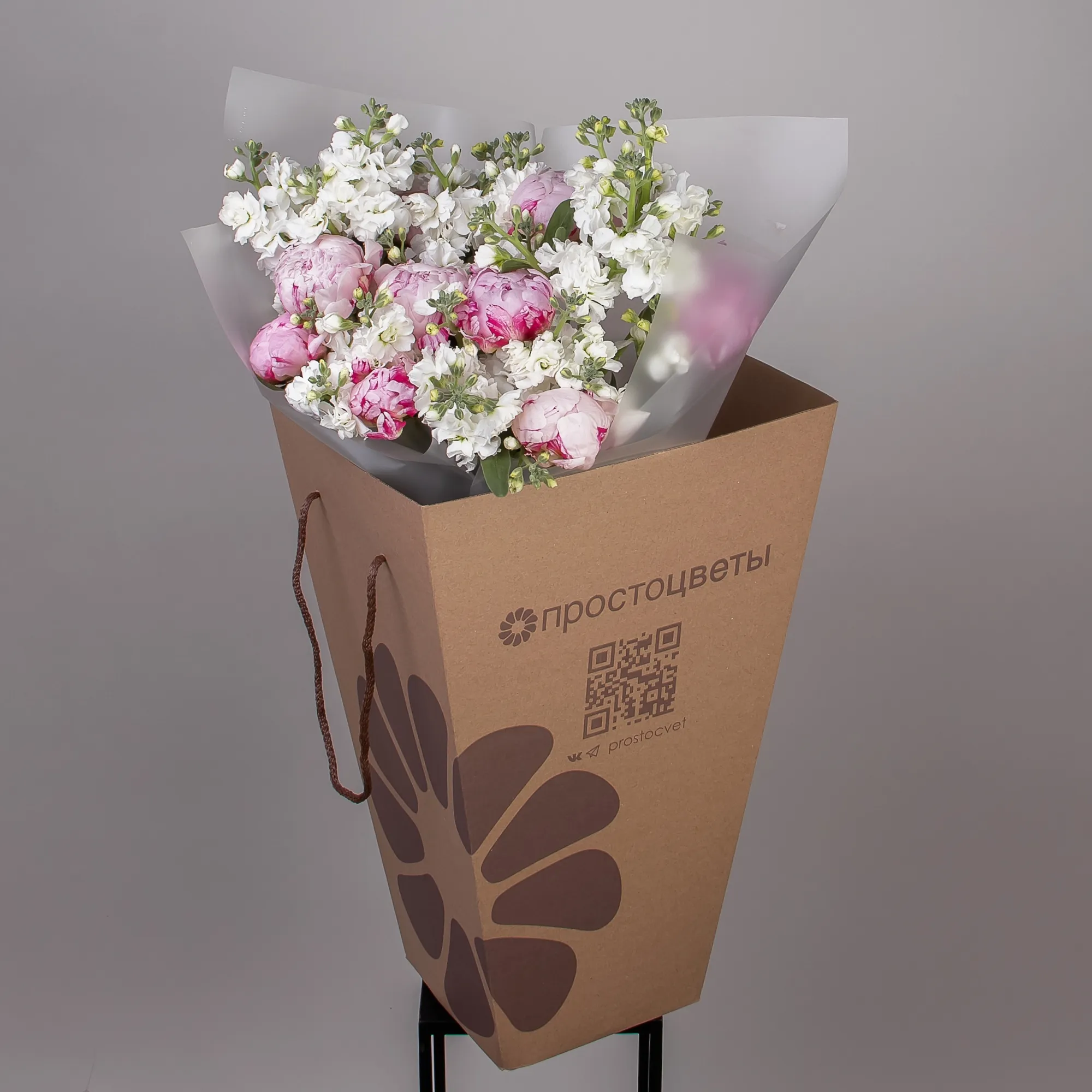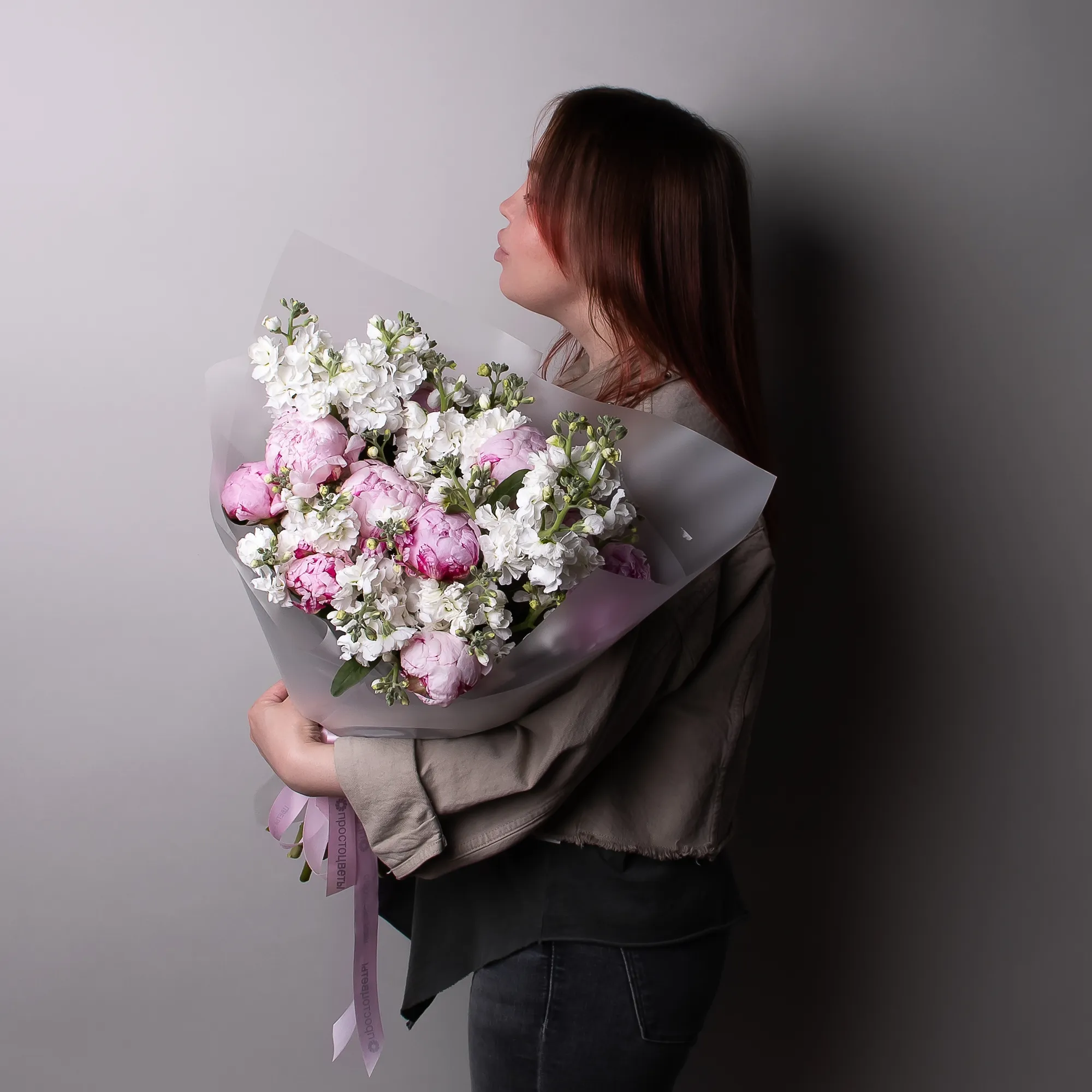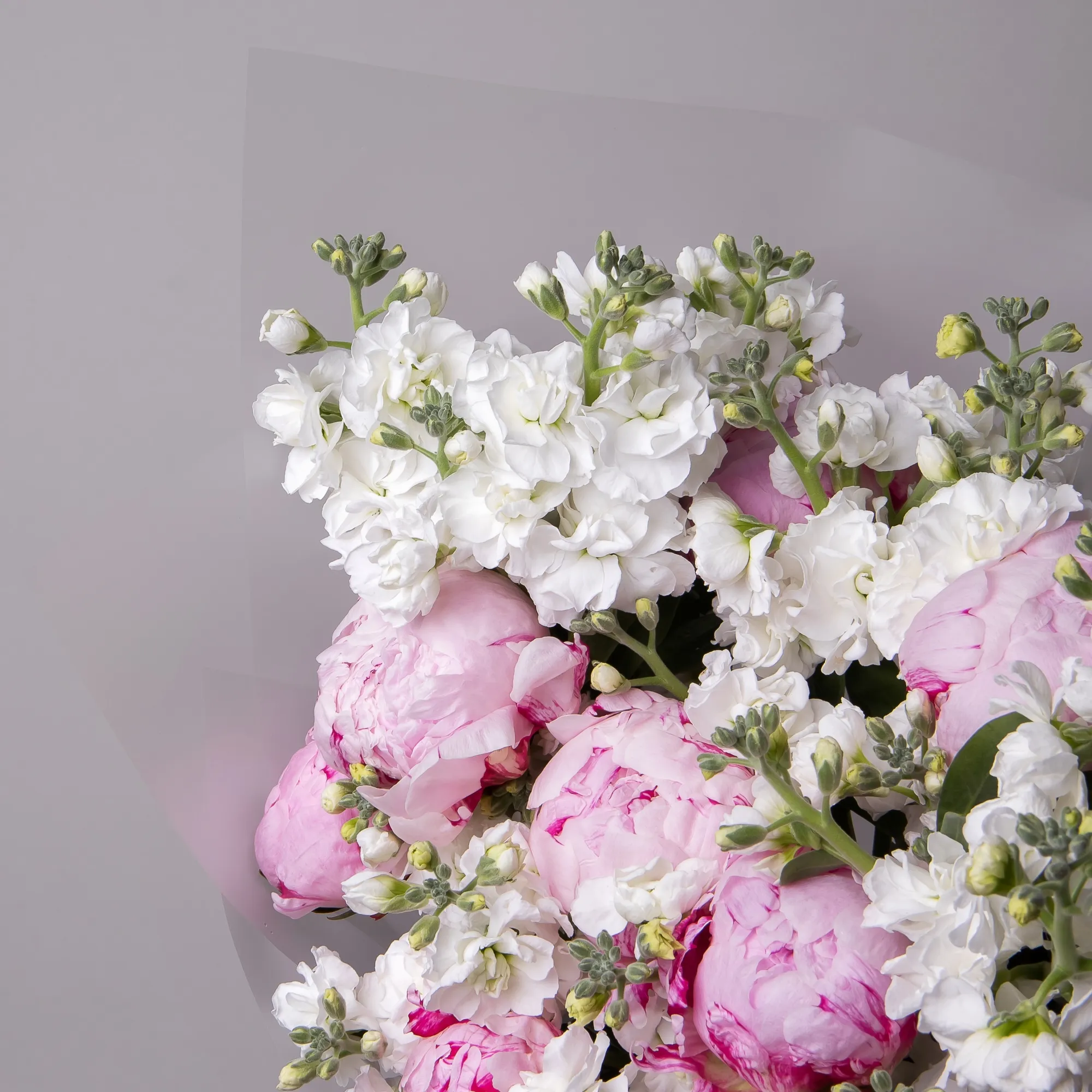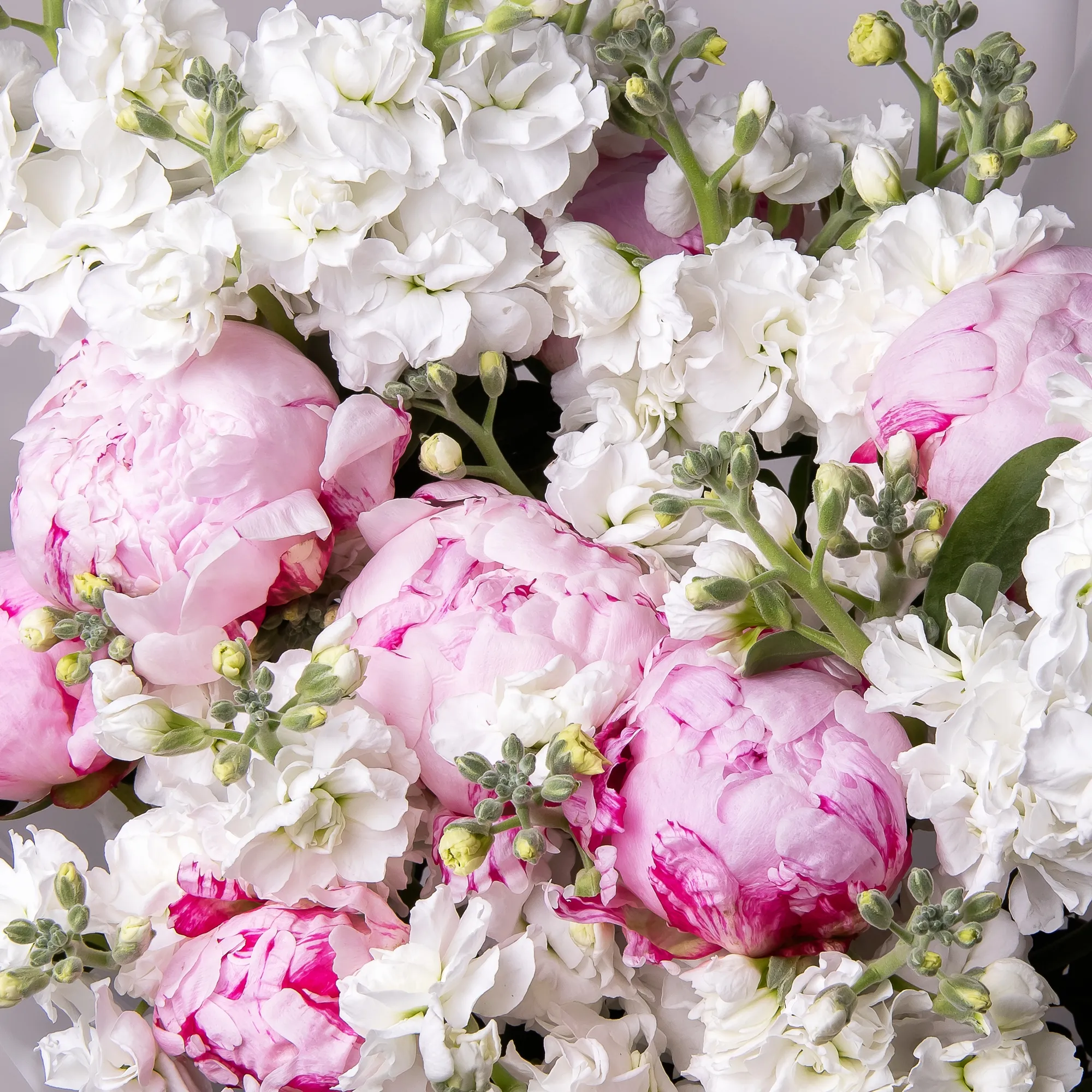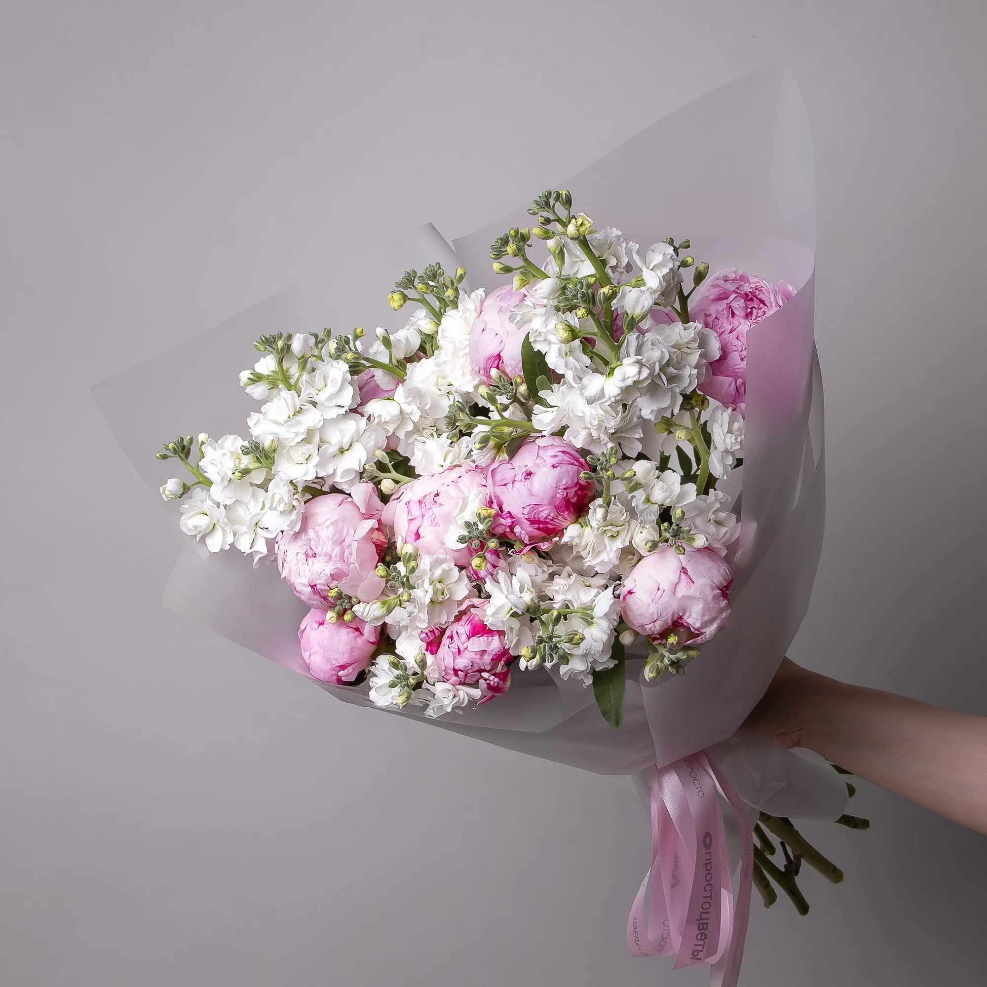 Дуобукет из розовых пионов и белой маттиолы