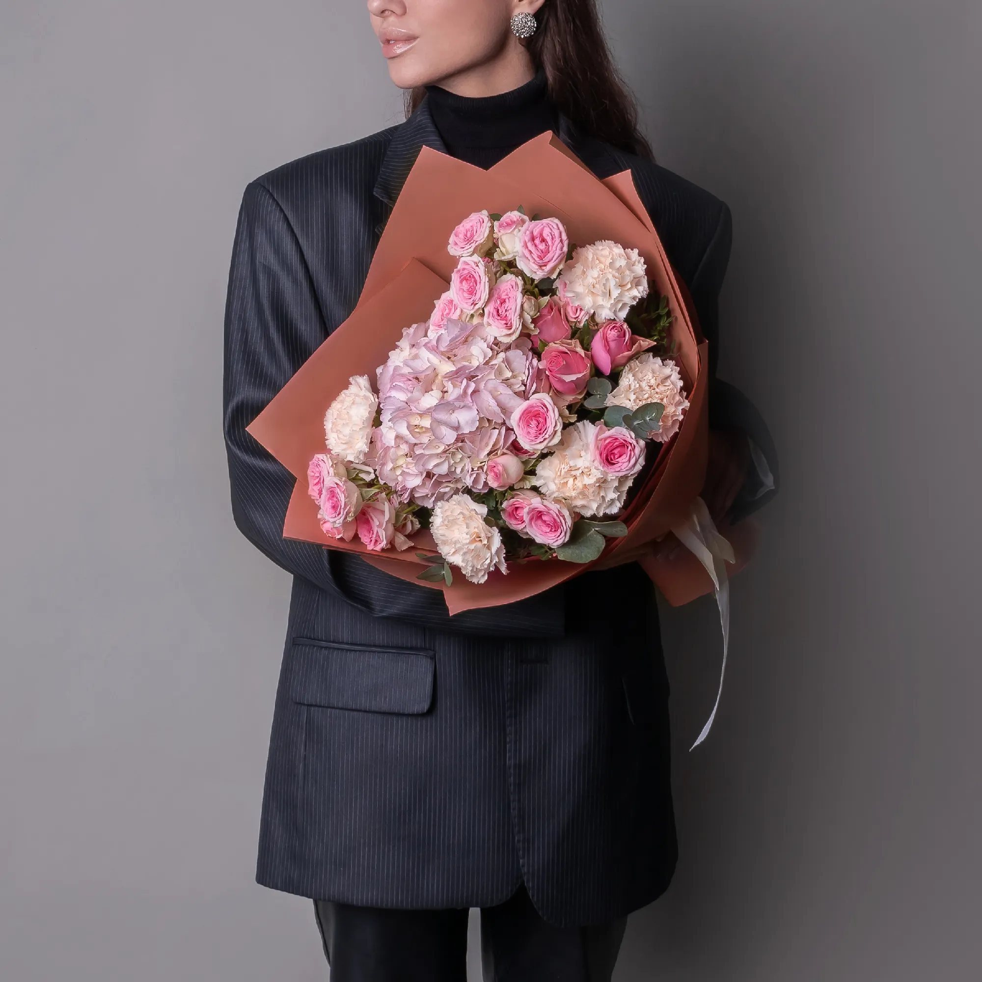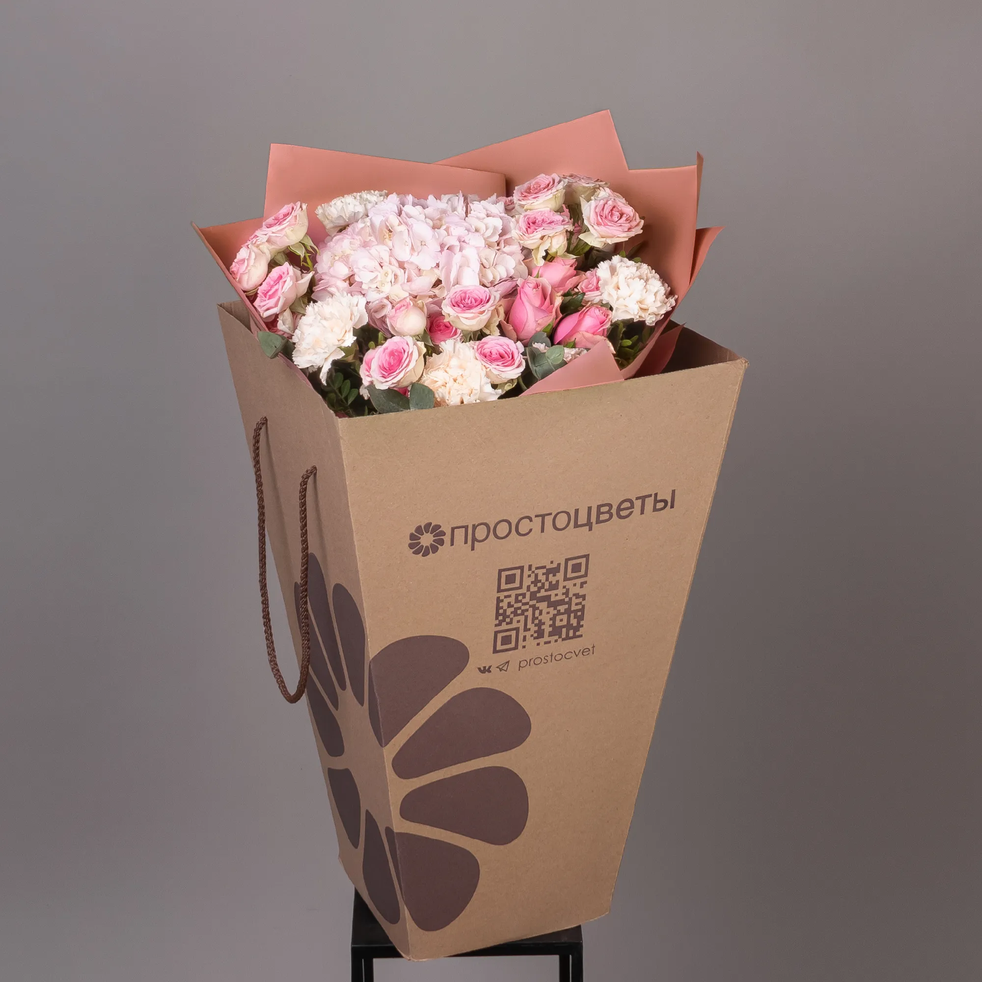 В составе букета "Элегантная роскошь" в размере М кустовая роза "Динара", роза "Вэм", розовая гортензия, светло-розовая гвоздика. Дополнен листьями фисташки и эвкалипта. Этот букет - отличный вариант презента, если нет какого-то особого повода. Чтобы сделать приятно близкому человеку. И помните, что цветы - это просто.
